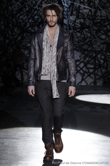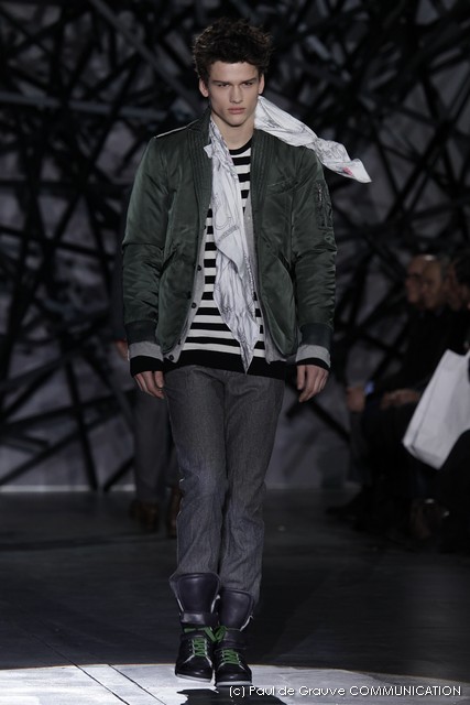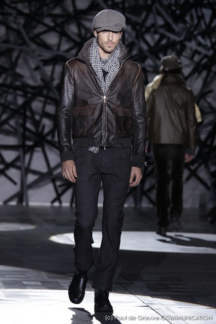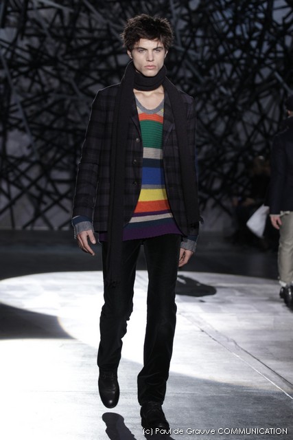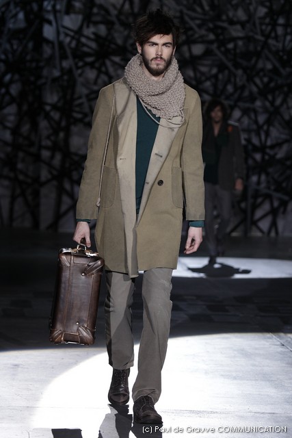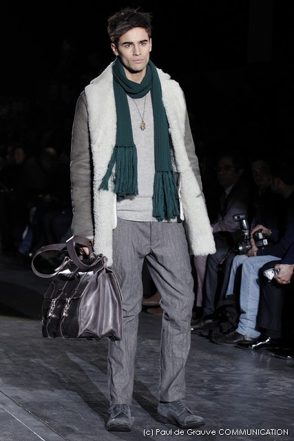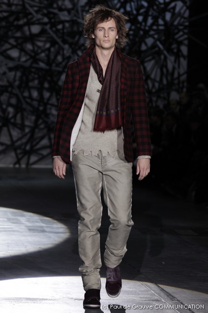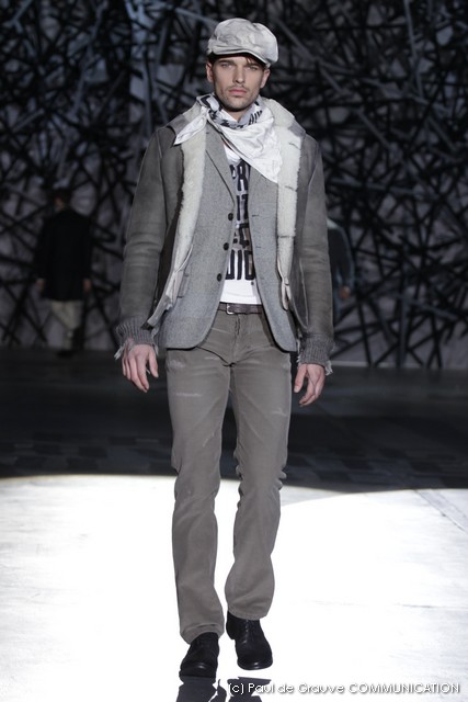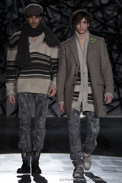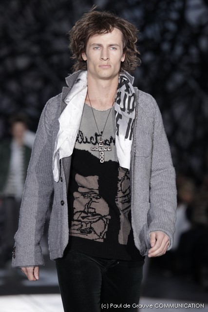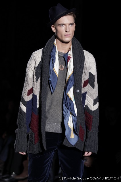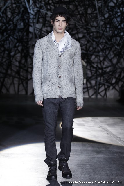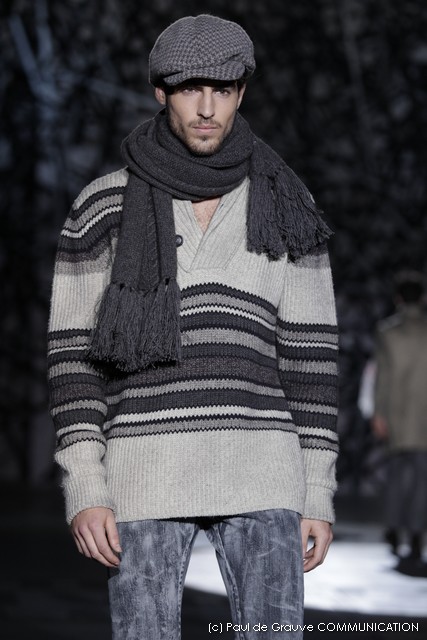 Protagonista della collezione è la maglia in cashmere sporcata e sovra tinta; a tricot, con effetto retrò, distrutta da numerosi trattamenti. Anche i giubbetti in pelle hanno effetti vari ottenuti da trattamenti. Cardigan lunghissimi, accanto ad altri corti e over, pullover dalle foggie svariate, leggerissimi e con il bordo dal taglio asimmetrico, lunghi e a bande coloratissime, sobriamente grigi, o di un bel verde petrolio. Un cardigan/gilet con bordo in contrasto sotto le giacche; bello e ben costruito color biscotto portato con sopra un giubotto in pelle o in verde da portare sotto la giacca del completo e un bel foulard a stampa.