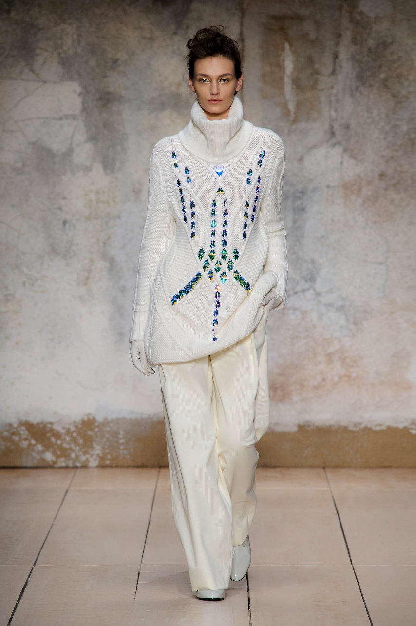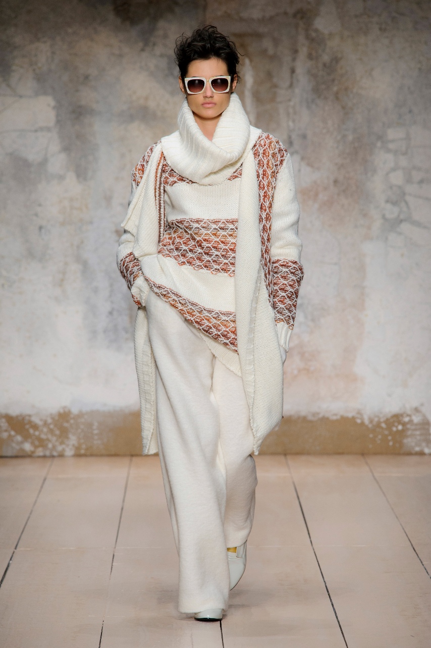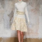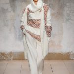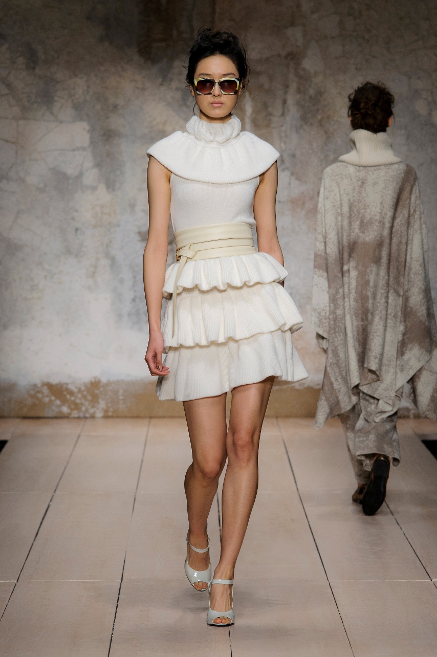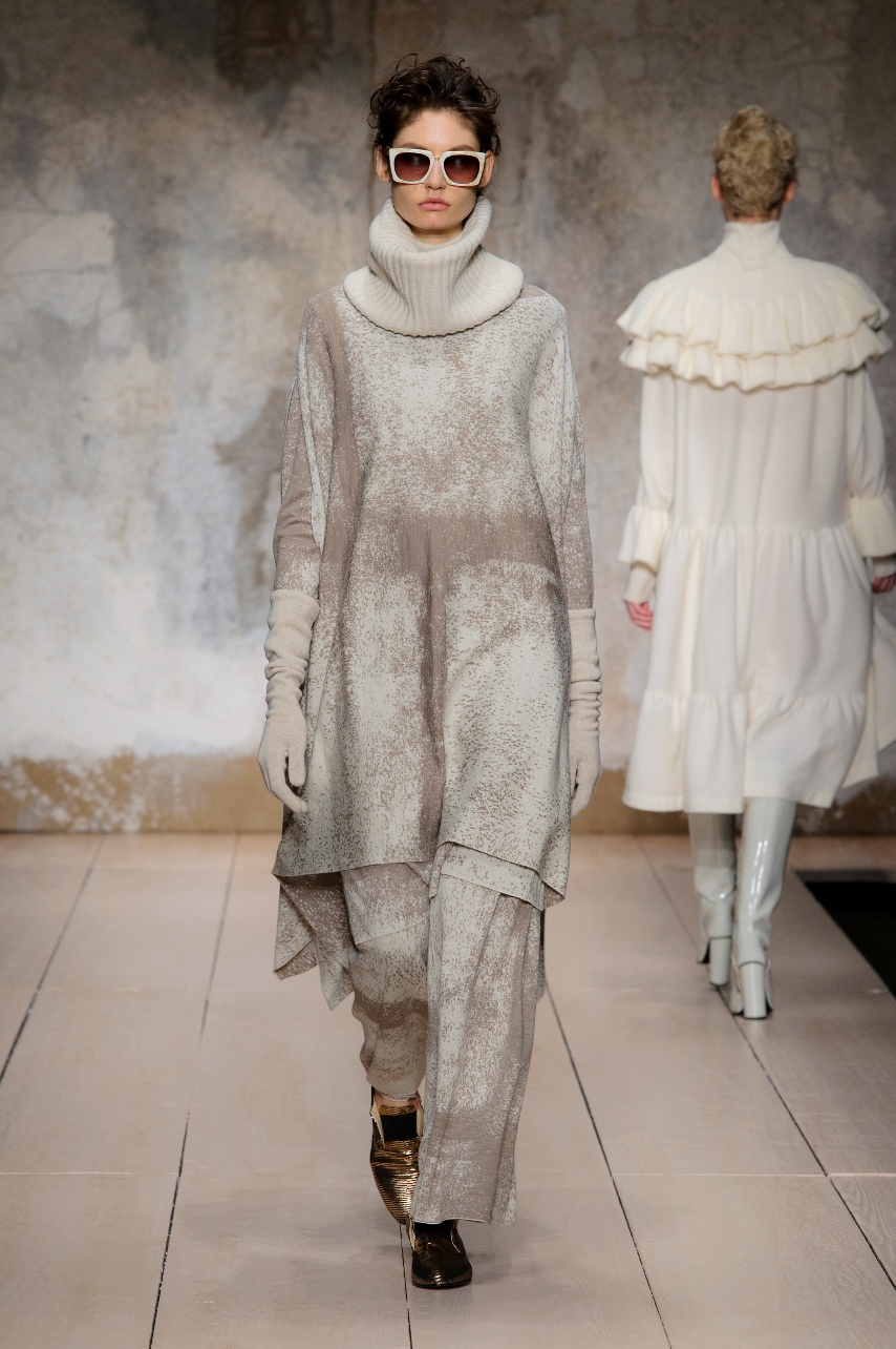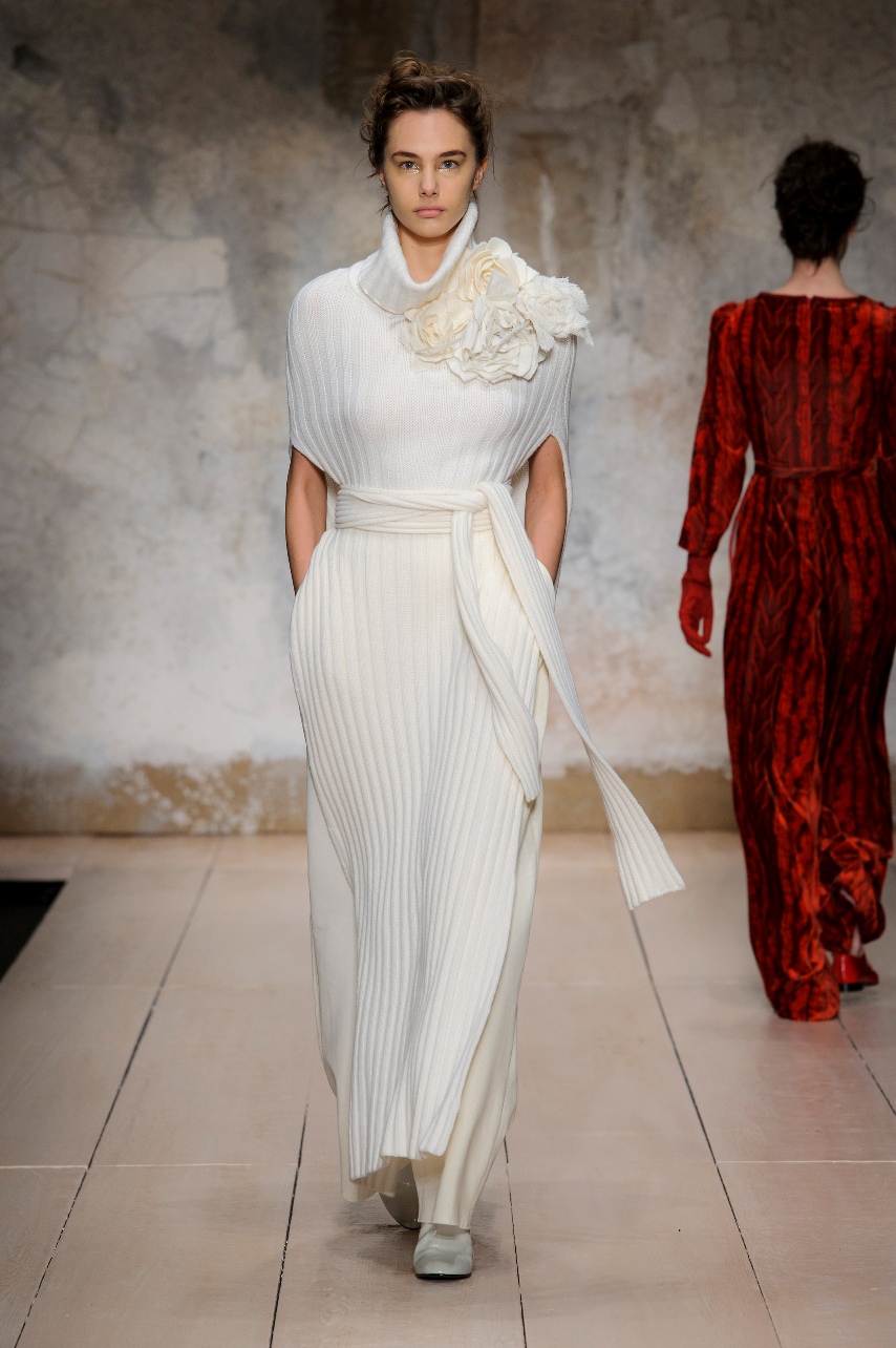 Il bianco, tinta nobile e pura, equilibrio e neutralità, tanto amata dalla stilista, è combinata con i nocciola e “colora” gonne, gorgiere e pantaloni di cachemire impreziositi da sprazzi di fili, emergenti qui e là dalle pareti del tessuto.