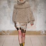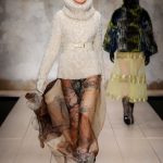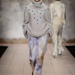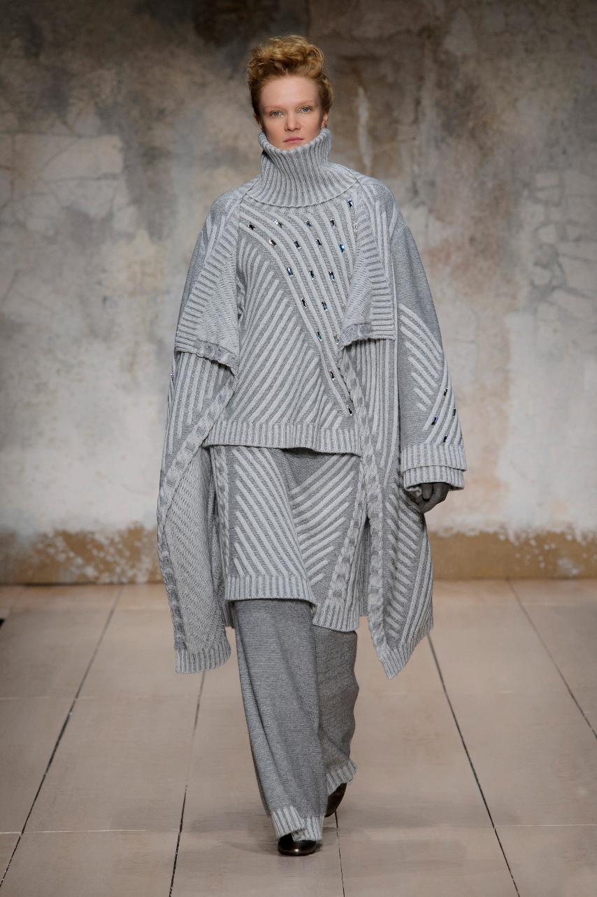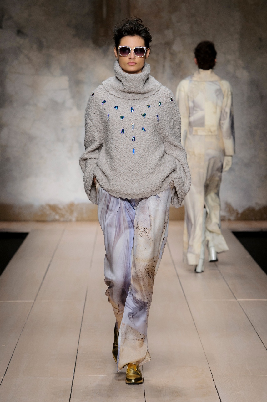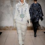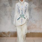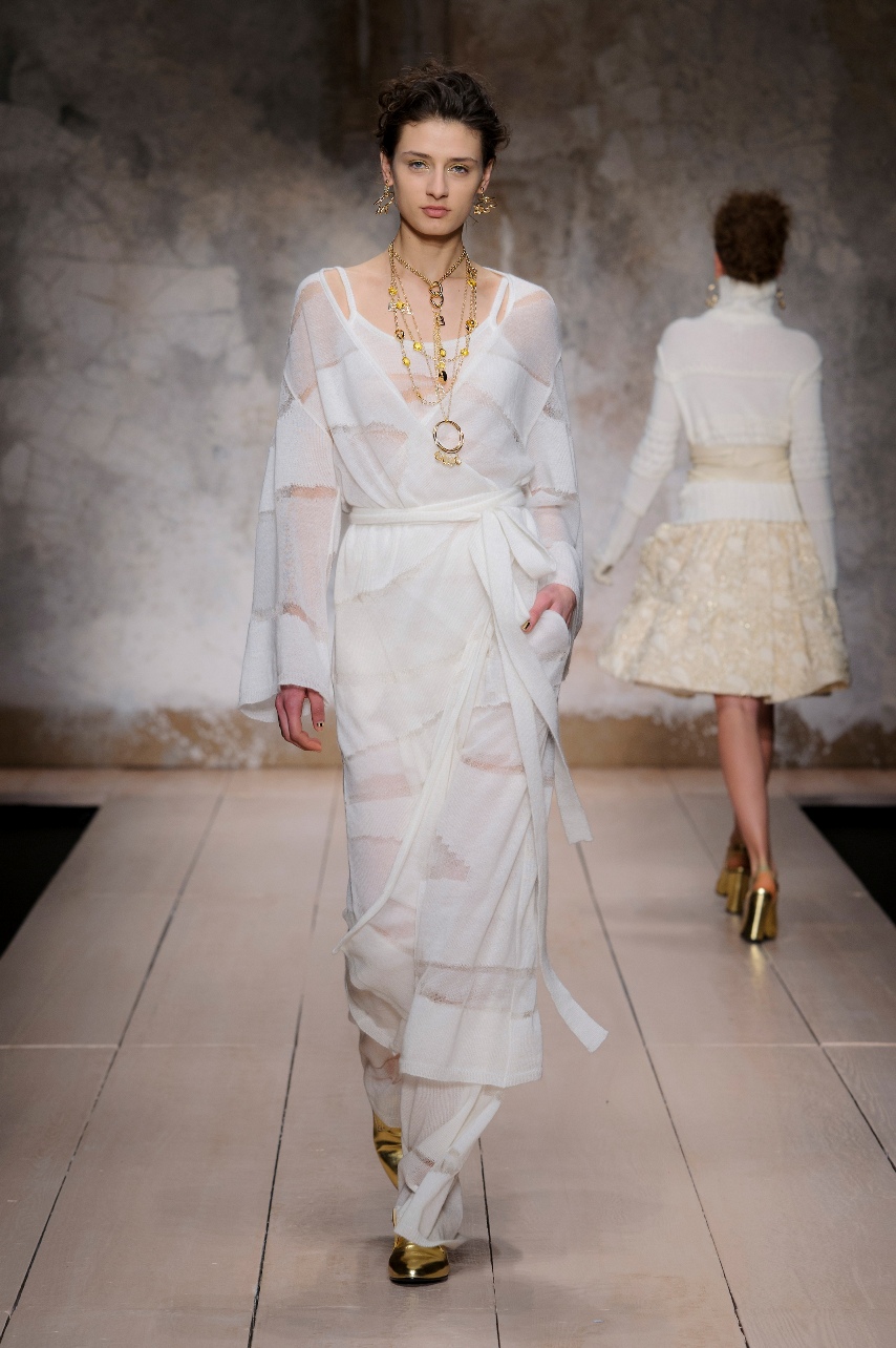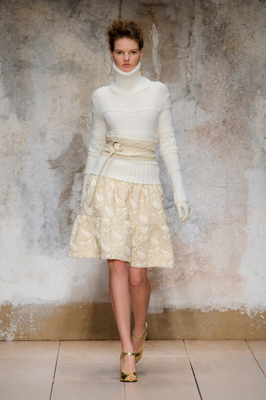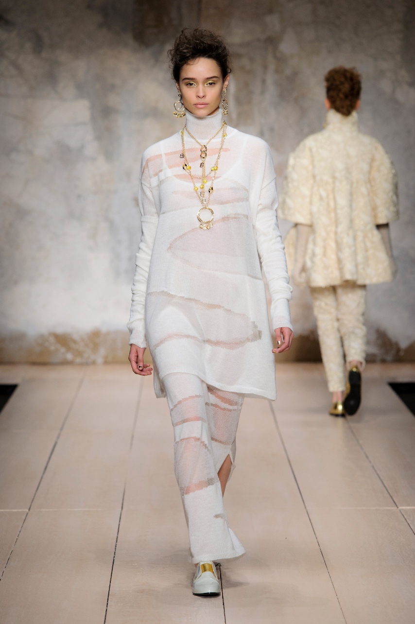Il bianco, tinta nobile e pura, equilibrio e neutralità, tanto amata dalla stilista, è combinata con i nocciola e “colora” gonne, gorgiere e pantaloni di cachemire impreziositi da sprazzi di fili, emergenti qui e là dalle pareti del tessuto.