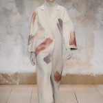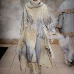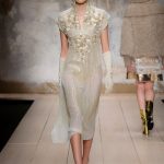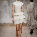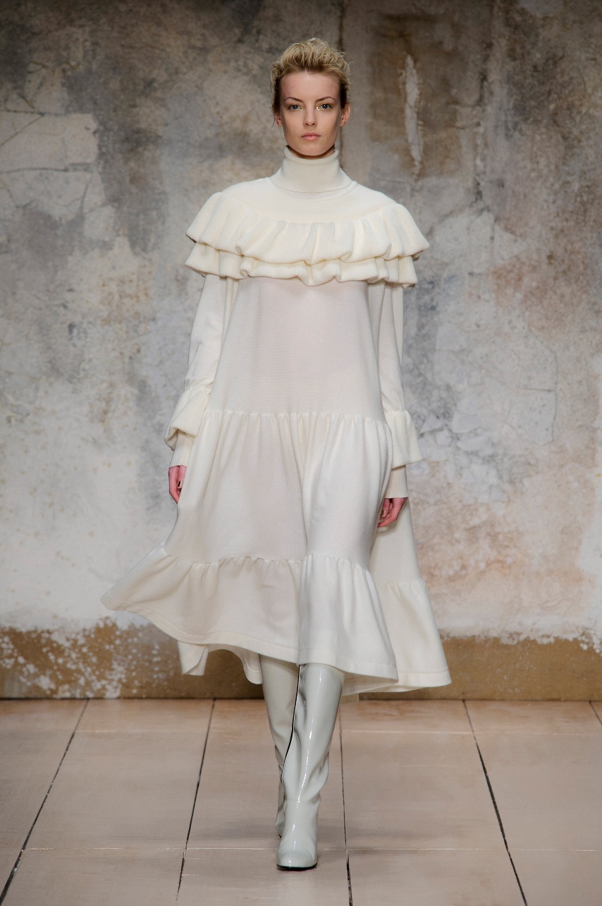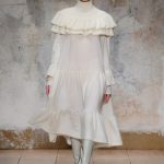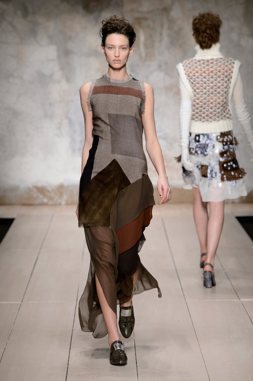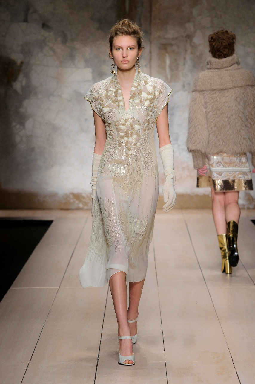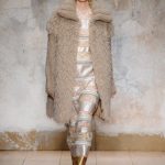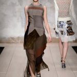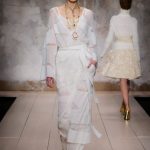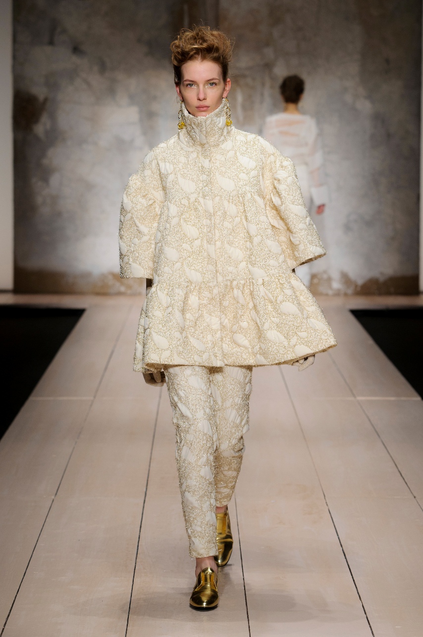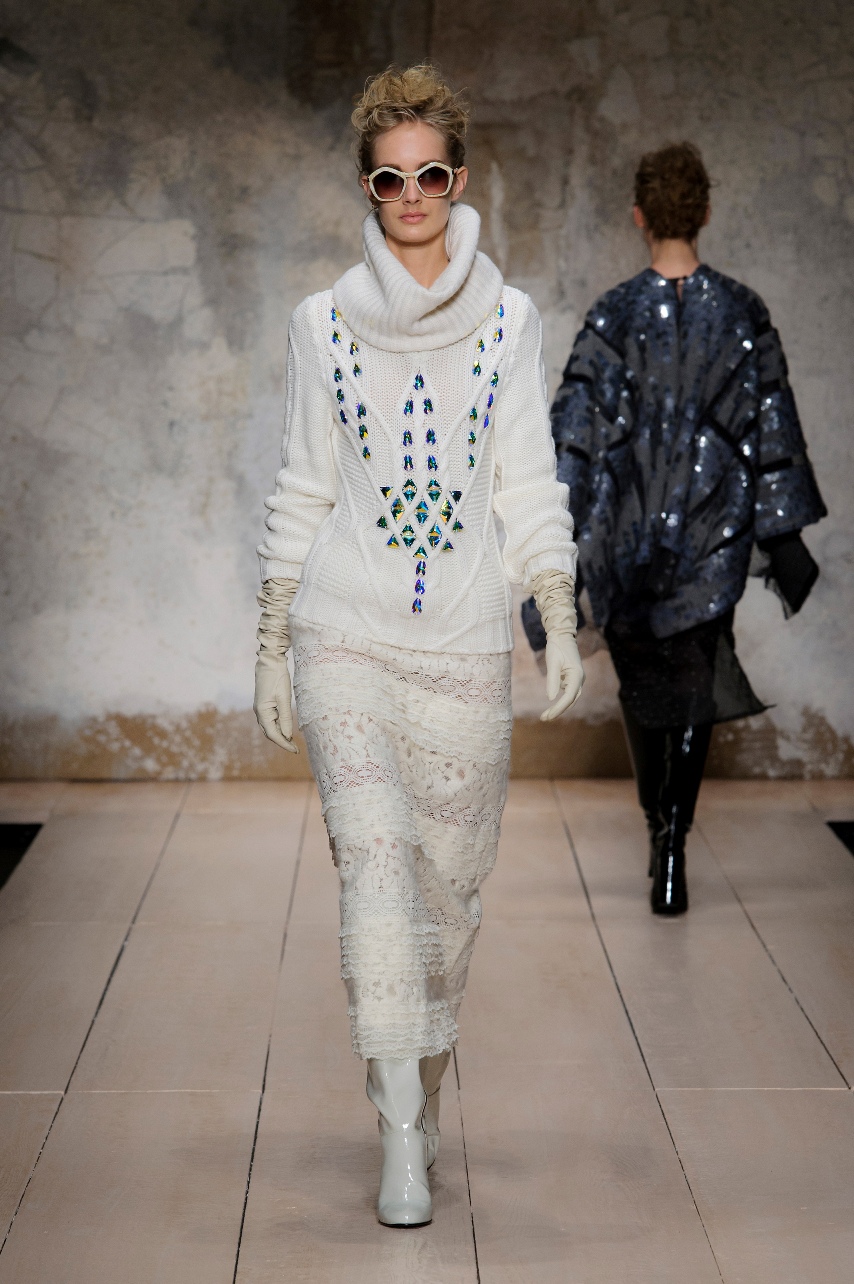 Il bianco, tinta nobile e pura, equilibrio e neutralità, tanto amata dalla stilista, è combinata con i nocciola e “colora” gonne, gorgiere e pantaloni di cachemire impreziositi da sprazzi di fili, emergenti qui e là dalle pareti del tessuto.