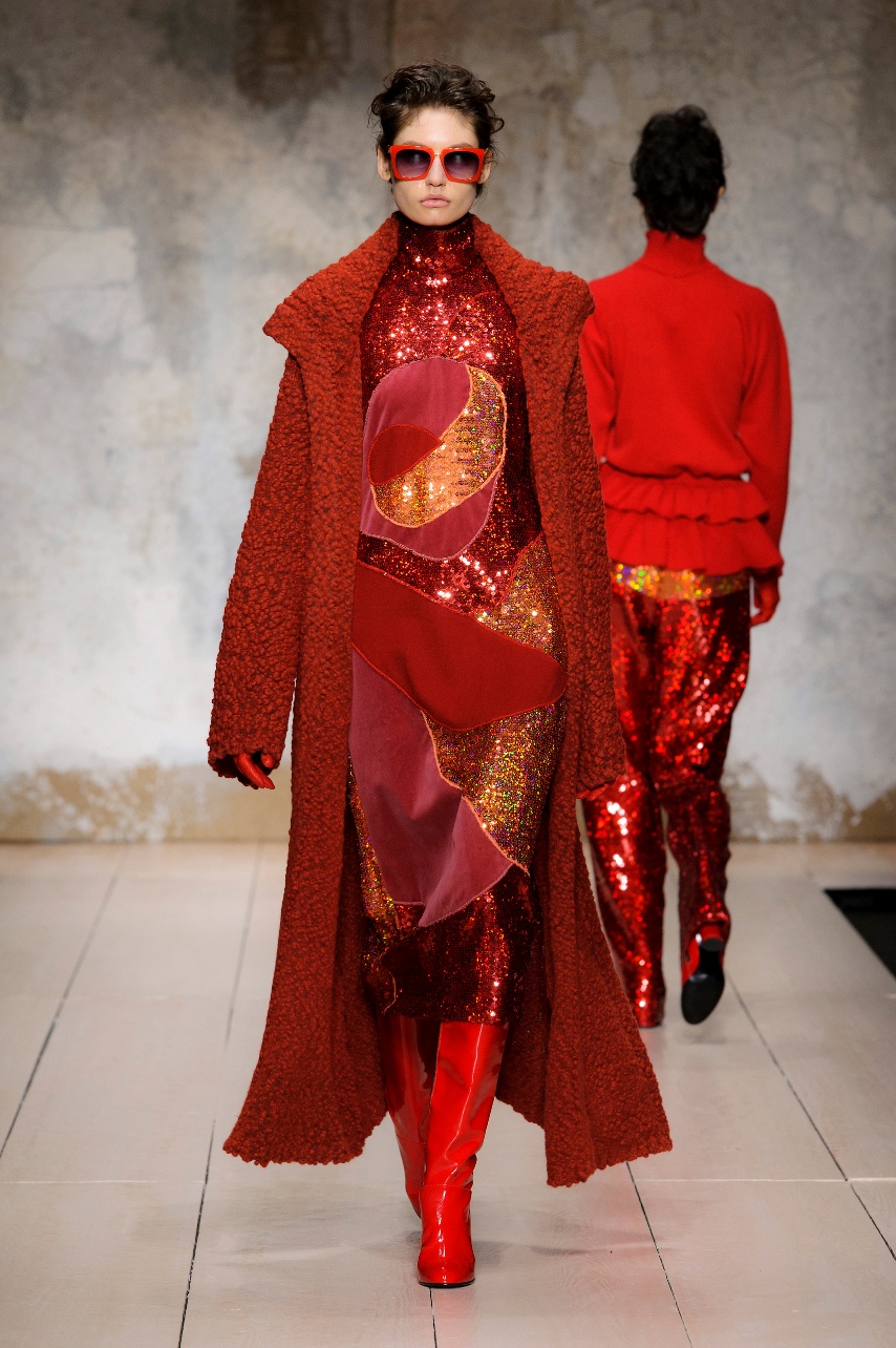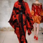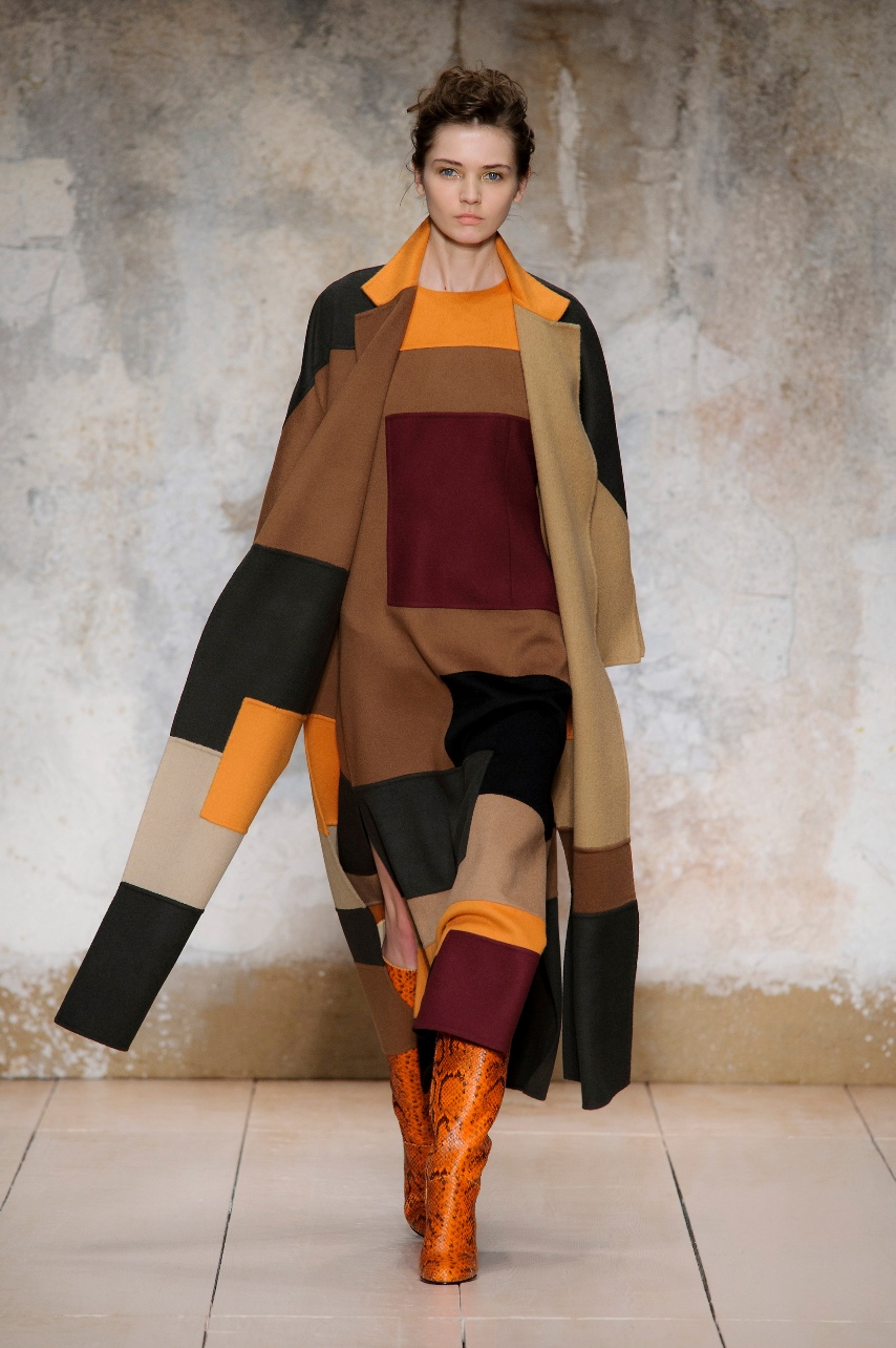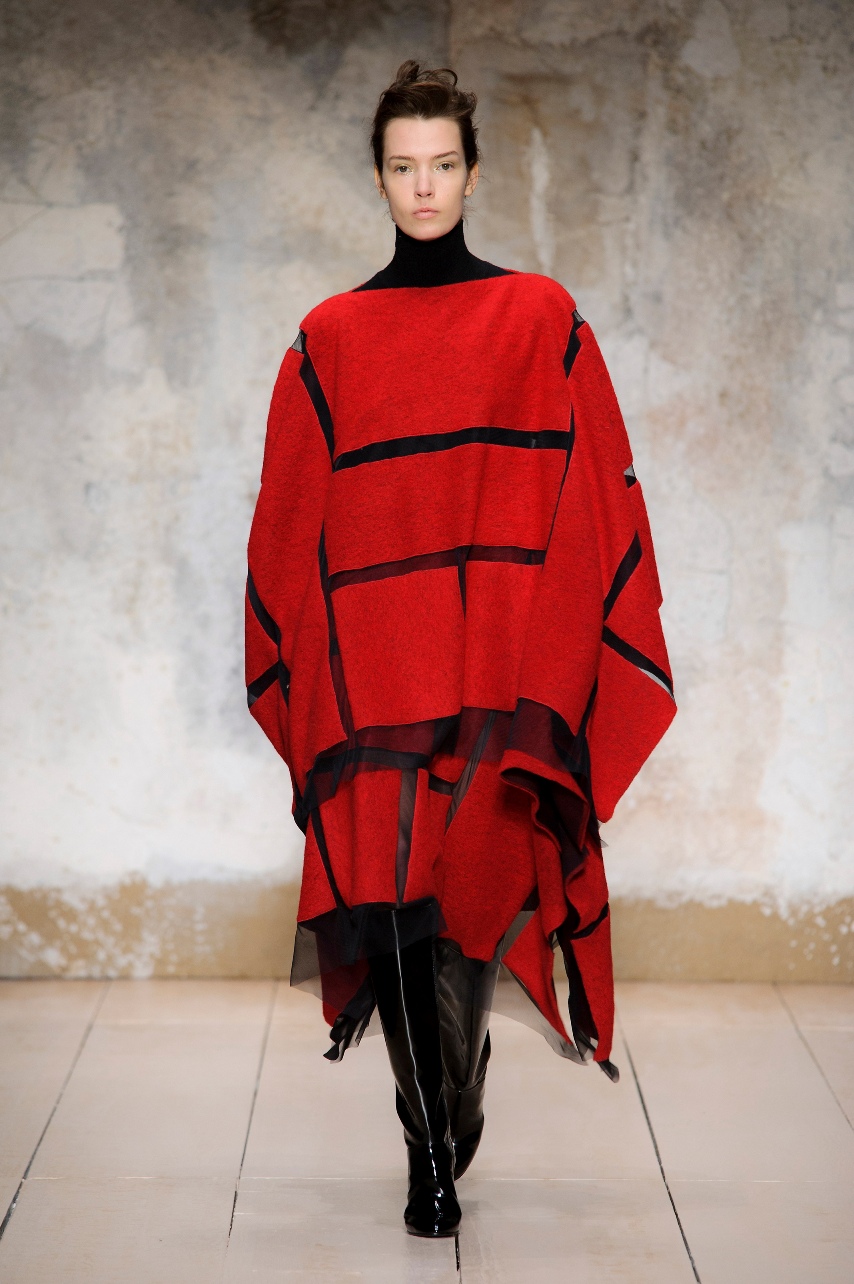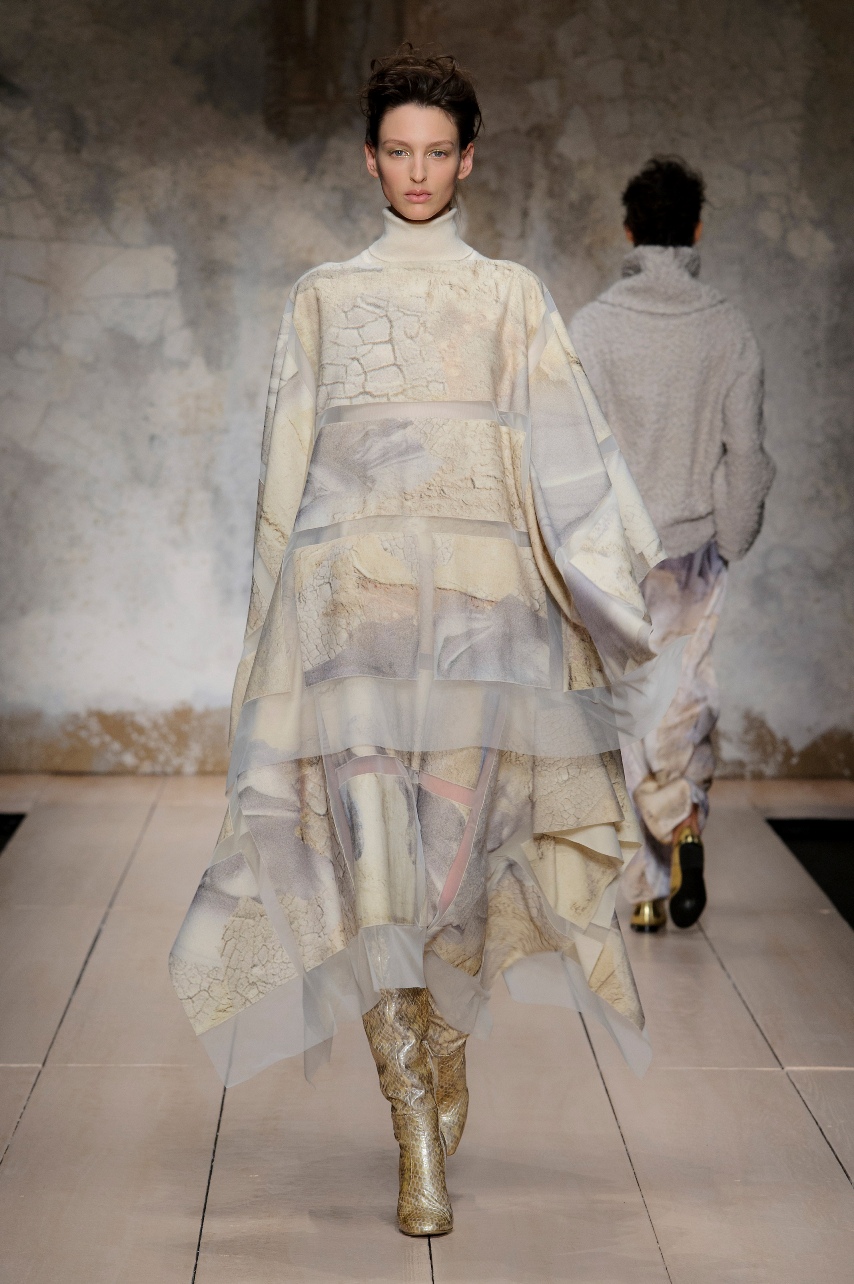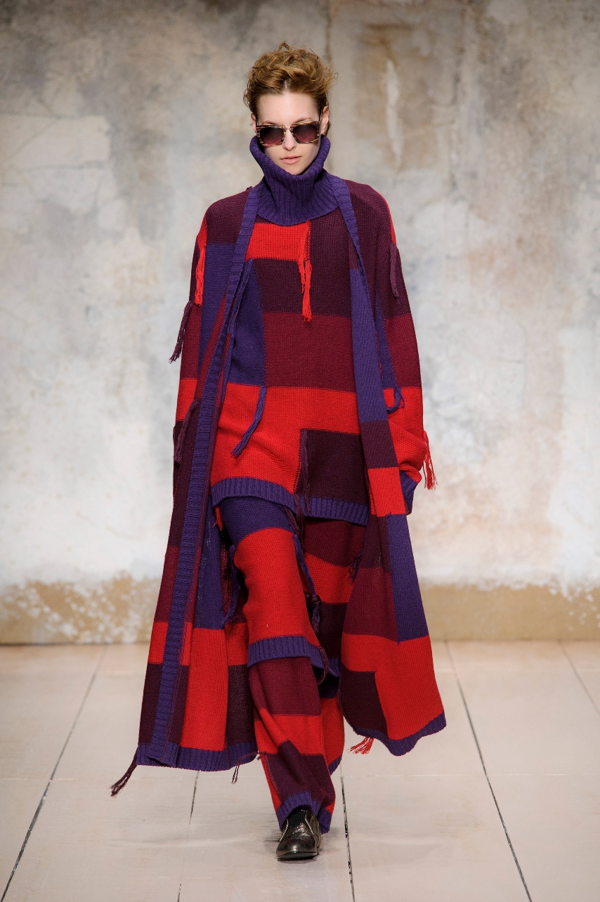 Tinte tenui dai toni pietrosi dipingono impalpabili sete, toni terrosi si stagliano sui patchwork di velluto e un rosso deciso sovrasta abiti e tricot dai volumi importanti.