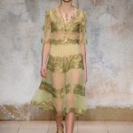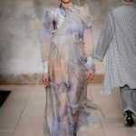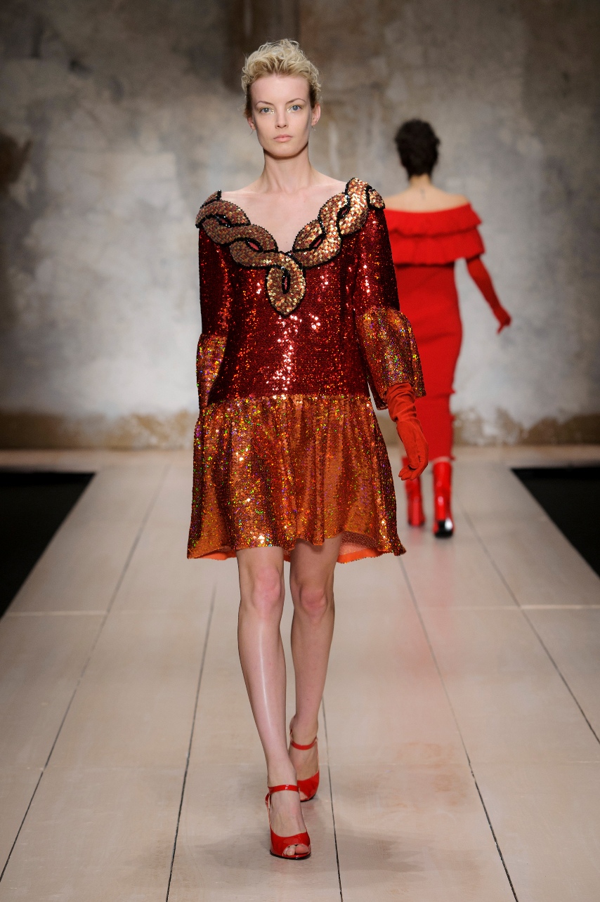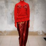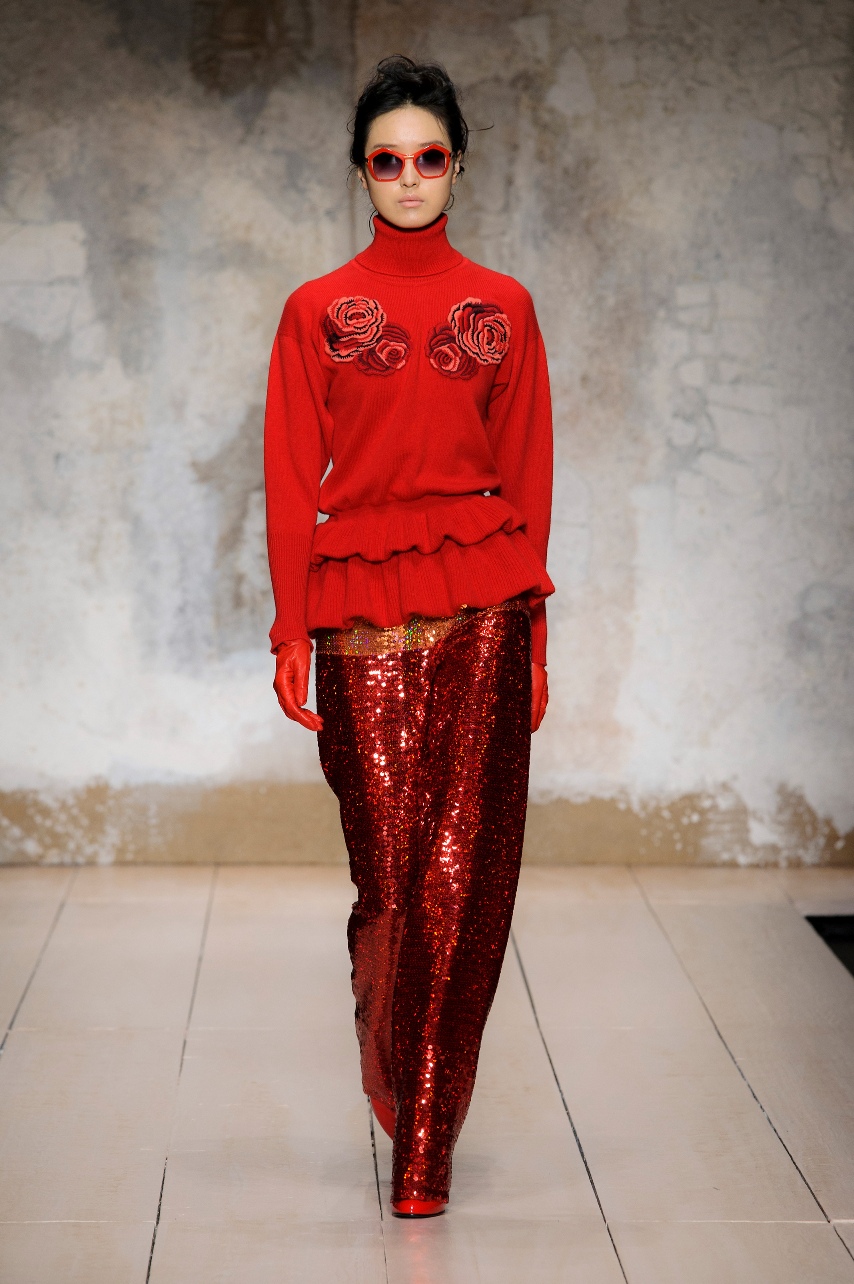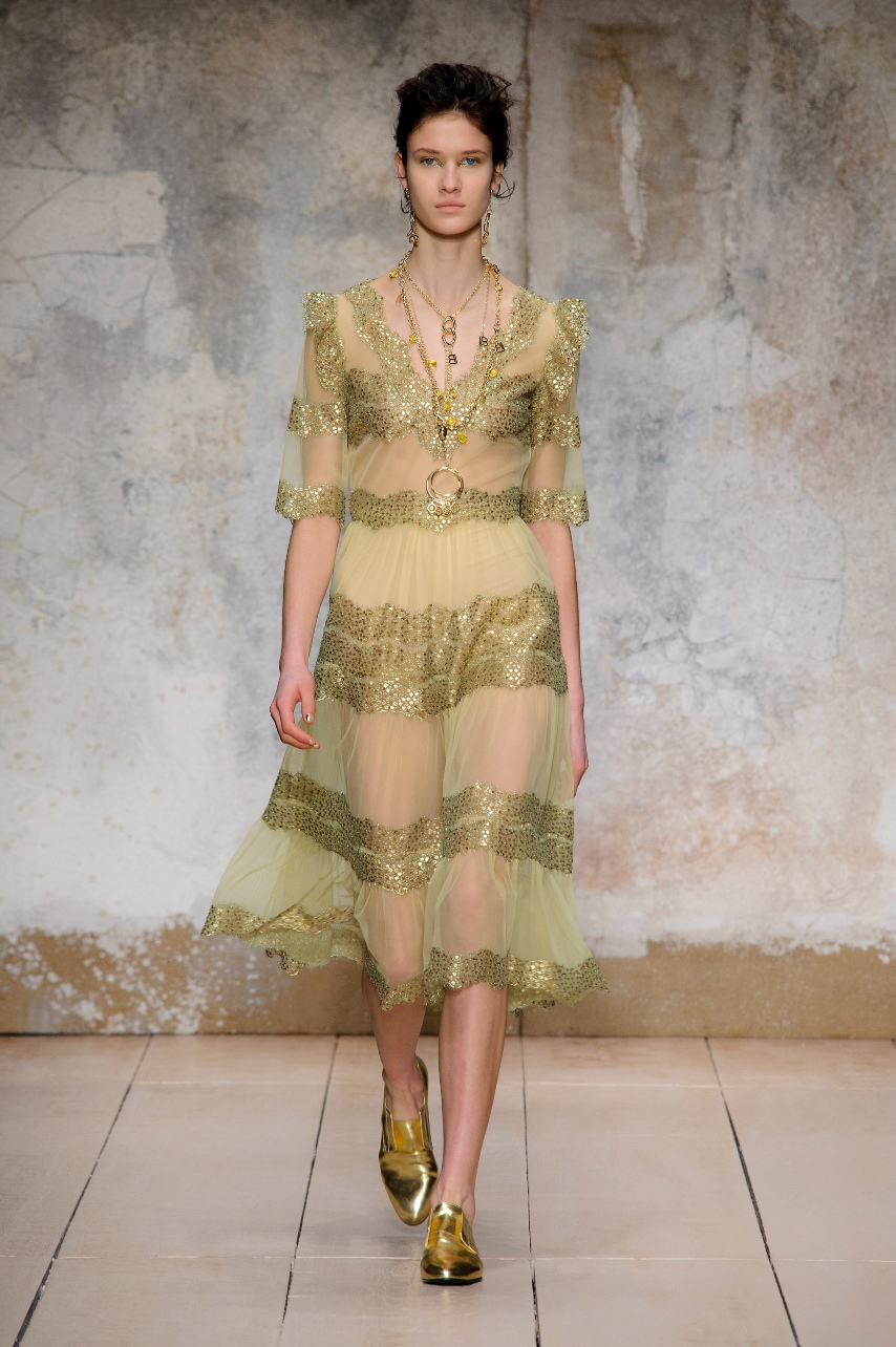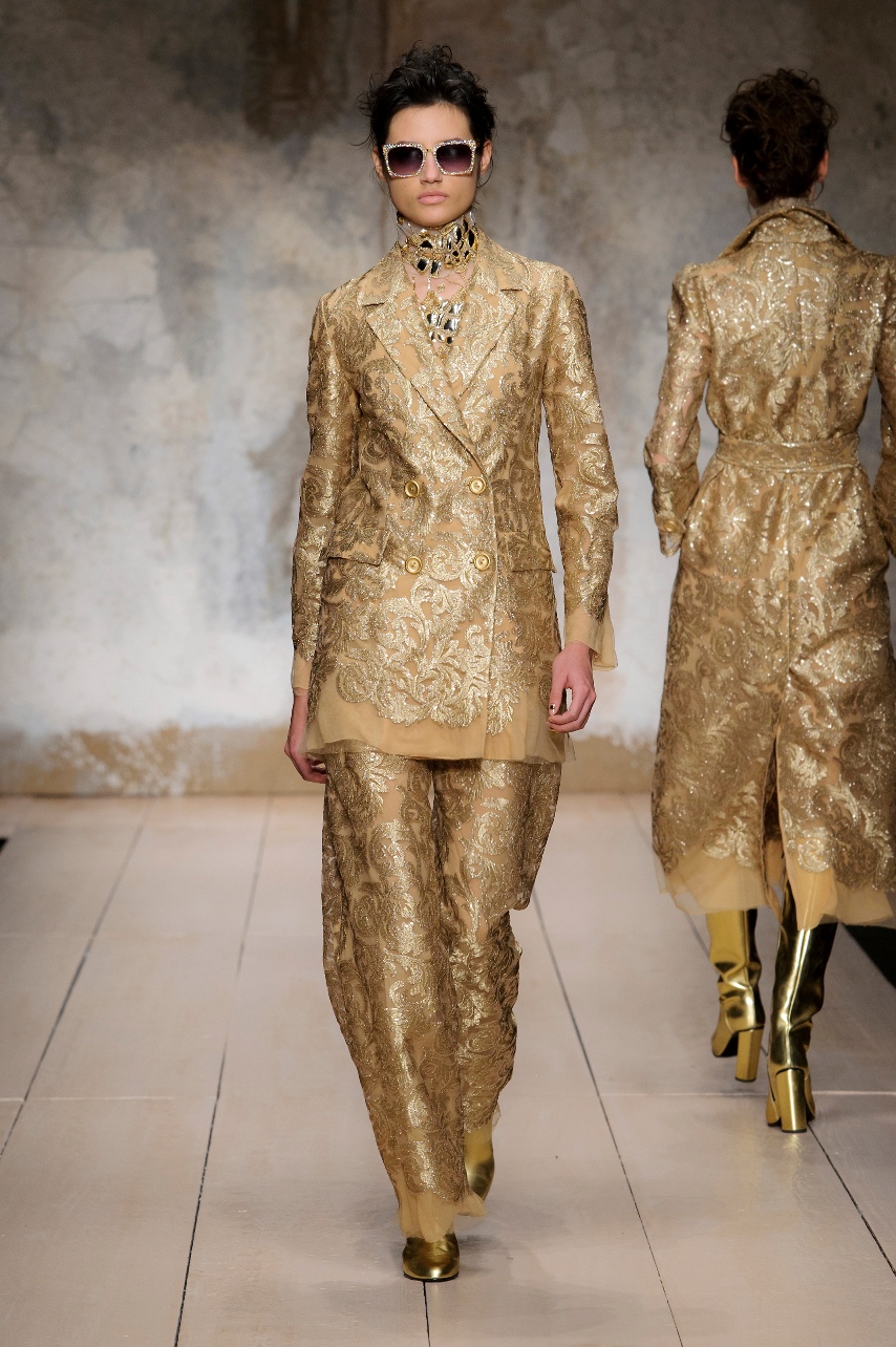 Una proposta definita da contrasti: volumi verso linee fluide, vita segnata o lasciata libera, colli importanti o semplici girocollo, maniche a sbuffo o maniche dritte e lineari, pantaloni morbidi o strutturati, gorgiere e spalle nude, paillettes e juta, materia grezza e pizzo.