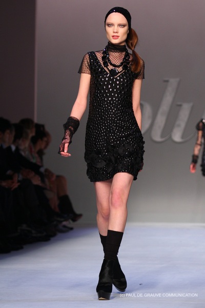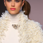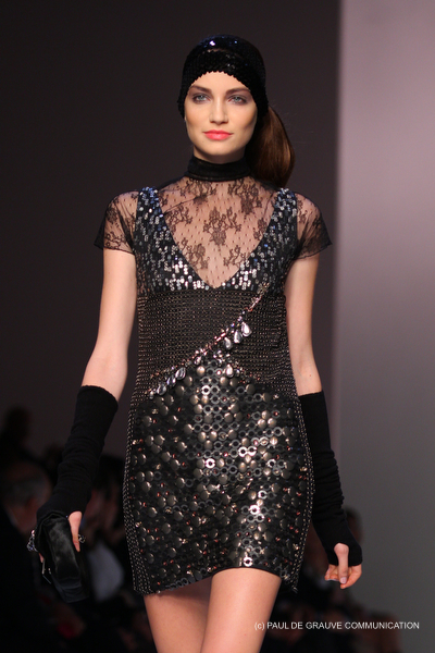 Borchie, cristalli, paillettes, jais impreziosiscono come punti luce cardigan ed abiti in maglia con trasparenze di pizzo dalle silhouette fluide o si fanno scintillante trama all’insegna di un décor sofisticato di ispirazione glam-rock