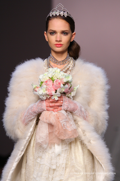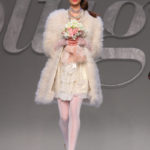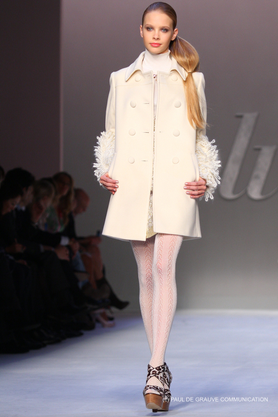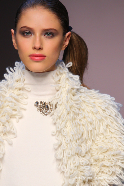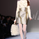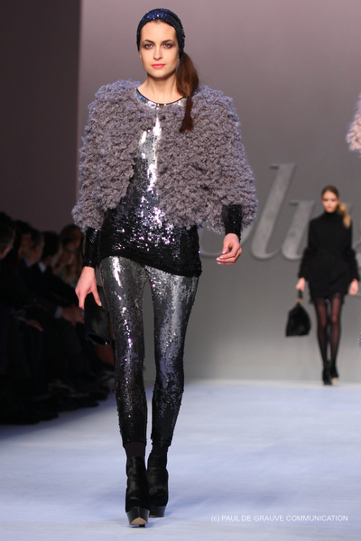 Molto belle anche le ampie cappe in lana, nella delicata tonalità del lilla che come romantiche nuvole sono proposte su abiti di paillettes iridescenti; e ancora le maniche ton su ton dei cappotti rese importanti da dettagli in lana o cashmere.