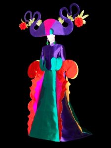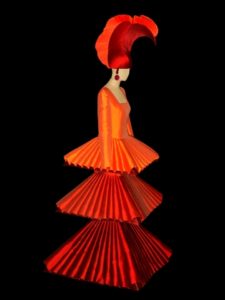 Ogni abito ideato dal genio creativo di Capucci si ispira non solo ai palazzi e alle costruzioni ma anche ai paesaggi, trae spunto ed eredita il nome, dalle meravigliose “architetture naturali” della Repubblica Popolare Cinese. “˜Khingan’ ricorda le pianure ondulate divise da aridi piani rocciosi con elementi in mikado frammentato a spicchi, nei toni del verde, del blu, del turchese e del grigio. “˜Zungaria’ evoca le zone rocciose e sabbiose, costruendo una suggestione in mikado giallo oro, verde e rosa fucsia, con ricami in rilievo. “˜Quiliam Sham’ è la sorgente del Gange tra le nevi del Tibet reinterpretata dal Maestro attraverso sete mikado, raso bianco e crema con inserti verdi e cordoni dorati. “˜Sishuan’ il fertile terreno collinare, diviene un abito in organza color acqua e mikado oro, ricoperto di ricami di fiori e di pietre mentre “˜Kunlun’, i rilievi e le basse montagne cinesi, sono resi con una profusione di mikado fucsia, arancio e giallo, modellati nello stile della “˜Linea a Scatola’.