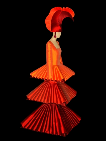 La meraviglia del legame creativo che da sempre lega gli abiti di Roberto Capucci ad ispirazioni e suggestioni provenienti dal mondo della natura continua con “˜Shandong’, abito ispirato al bassopiano cinese in mikado viola, rosso, verde e giallo, con forti elementi geometrici in contrasto. Il deserto più arido dell’Asia “˜Taklamakan’, diviene una superba creazione in seta mikado viola con elemento avvolgente in fucsia e in rosso, ricoperto di cristalli. “˜Chang Jiang’ il fiume del sud, ha ispirato la realizzazione dell’abito in mikado bianco e azzurro con onde e coppe mentre “˜Loes’, l’altopiano con vallate e gole a terrazze, è rappresentato nella creazione in mikado verde acqua, con boa di fiori su organza. Non poteva mancare “˜Xian’ abito ideato come omaggio al Daming Palace “costruito” con sovrapposizioni di canne in mikado rosso e arancio.
