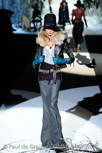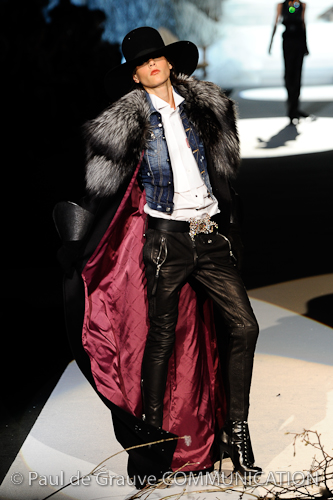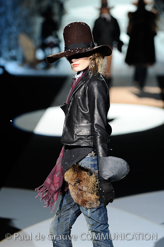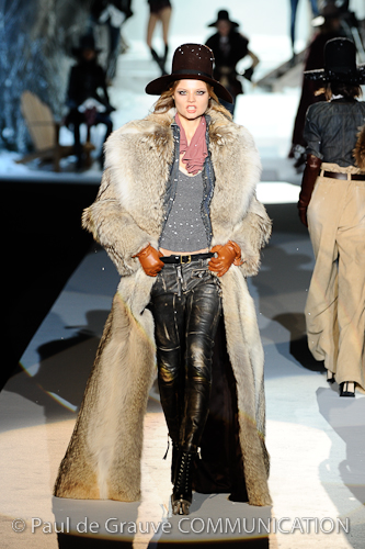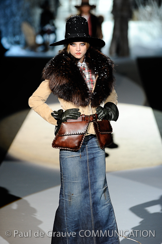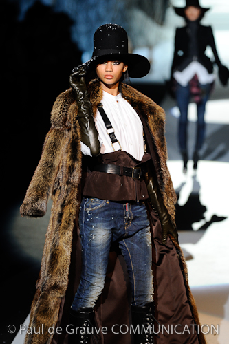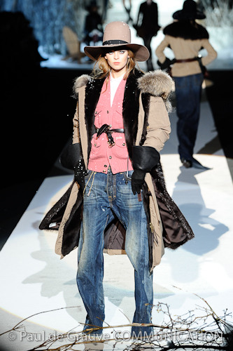 Pare invece che si sia trattato di un omaggio alle donne, alle mogli e alle fidanzate dei pionieri e dei minatori che colonizzarono l’America alla metà dell’800 e che con loro hanno condiviso il duro lavoro di assoggettare una terra incolta e di dar vita ad insediamenti anche in angoli impervi. Ed allora i due gemelli le hanno rivestite allo stesso modo, strati su strati per fare fronte al clima rigido e con gli stessi tessuti di base con il denim, tessuto da lavoro per eccellenza, sporcato e rovinato, ma anche “chinos”, camicie a quadri, camicie bianche senza collo; e poi pelli lavate ed usurate, pellicce per i grandi freddi, gilet e grembiuli da lavoro, giacche con tasche portaattrezzi. Perché l’omaggio fosse completo sulla passerella sfila anche qualche pioniere uomo.