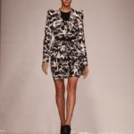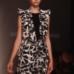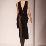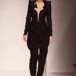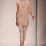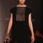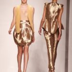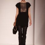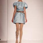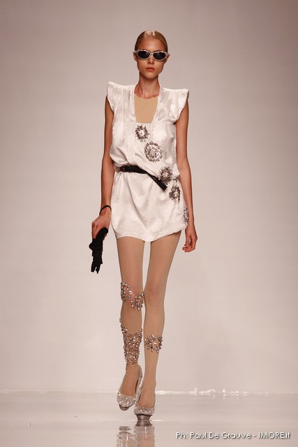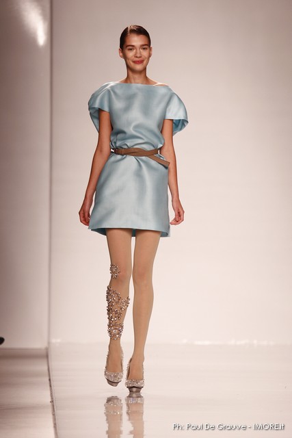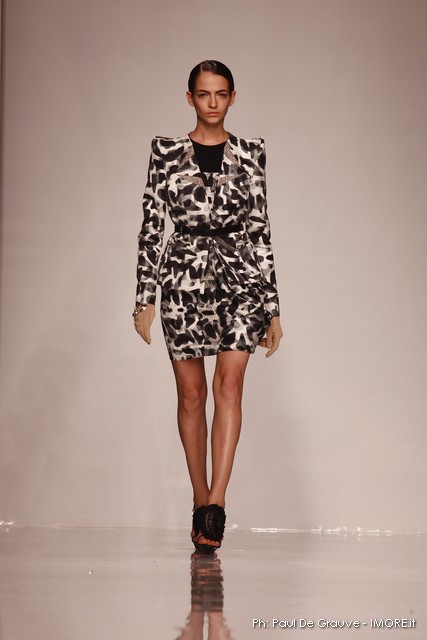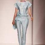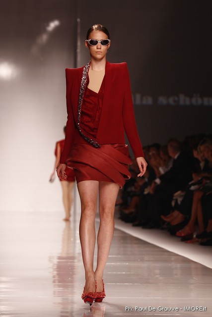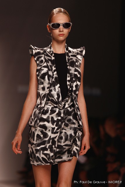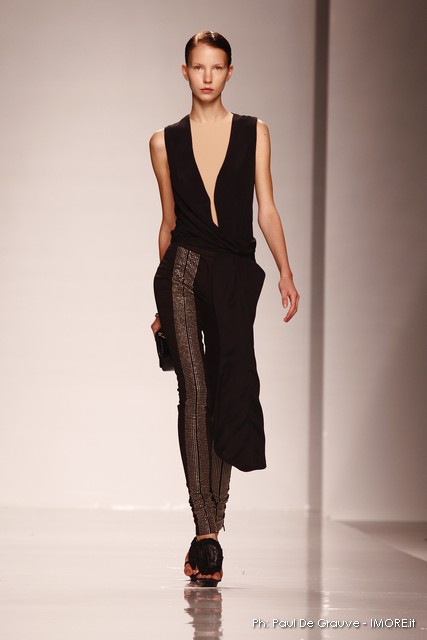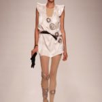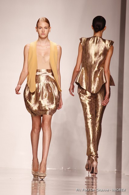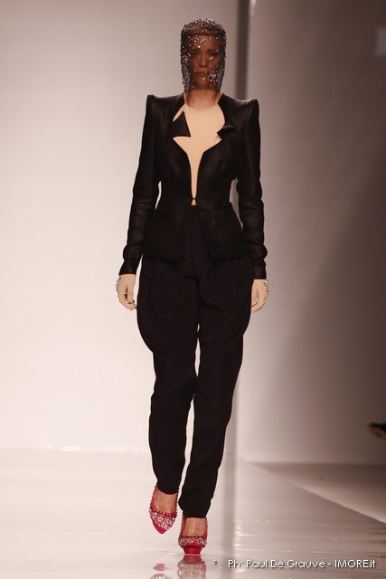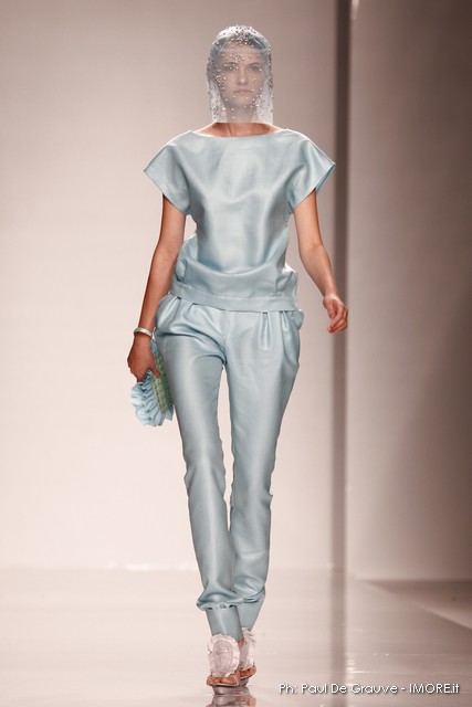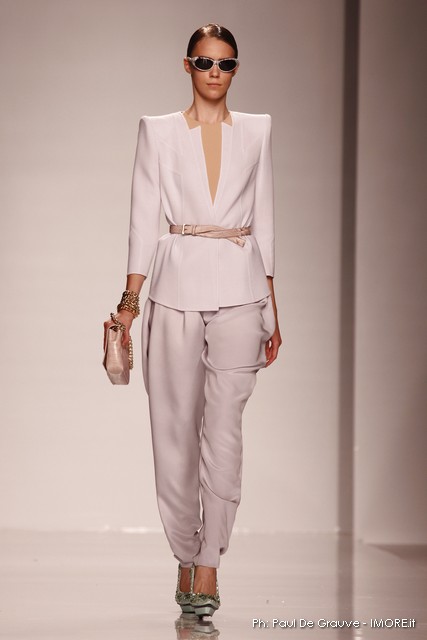 Altri elementi che connotano la collezione sono le spalle sottolineate, insellate, con reminiscenze orientali, sottolineate da ricami di cristalli, e che rendono la figura spigolosa, addolcita poi dalla morbidezza dei volumi della gonna o dalla scivolosità del tessuto sul corpo.
