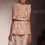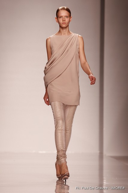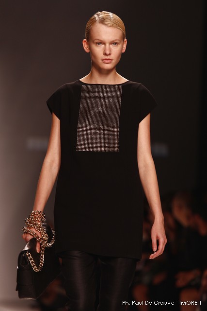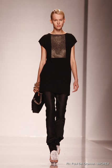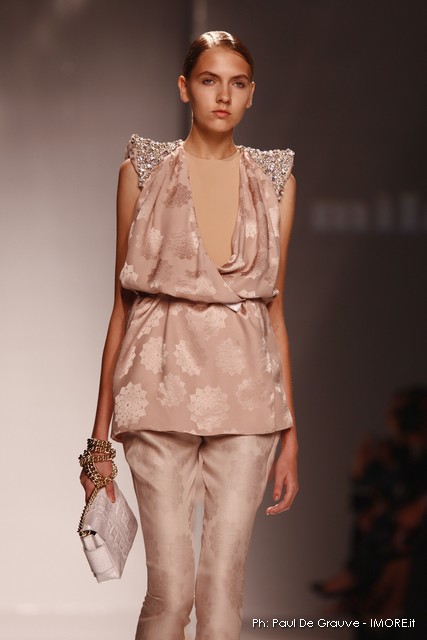La nota più dissonante con la sobrietà dello stile Mila Schon è rappresentato da alcuni complementi che nell’insieme risultano poco eleganti: i leggings color carne arricchiti con ricami eccessivi di fiori in micro paillettes; le scarpe con intarsi di cristalli.Interessanti i gioielli.