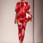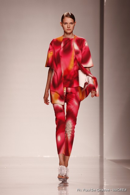 La Gervasio sovraccarica i capi di volumi tradendo le geometrie lineari della stilista milanese. Pieghe sovrapposte e girate verso l’alto, gonne a corolla, evoluzioni di tessuto che cambiano di volta in volta la silhouette, come negli abiti rosa a stampe dai pannelli che scendendo dalle spalle e sono contemporaneamente maniche e drappeggio atto a gonfiare la gonna. Drappeggi e pieghe scultura come nell’abito lungo rosso, oppure nella gonna bianca con blusa celeste, panneggi che inseriscono asimmetrie nella linea.