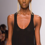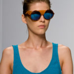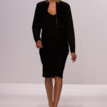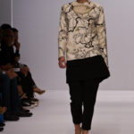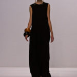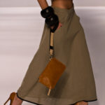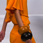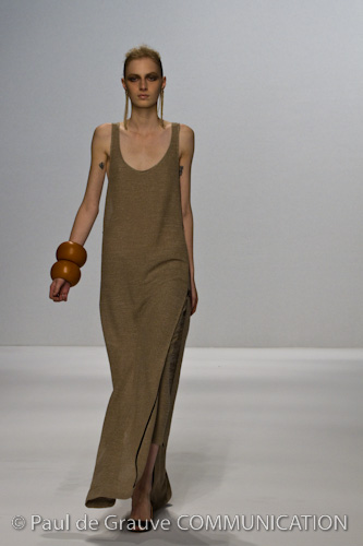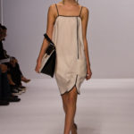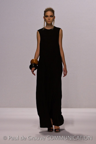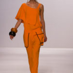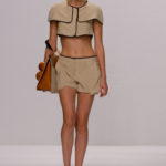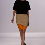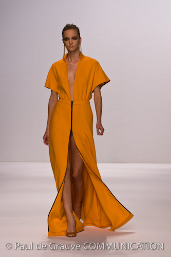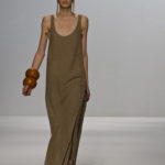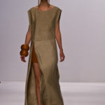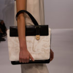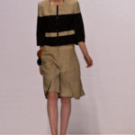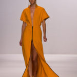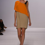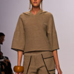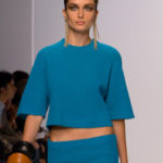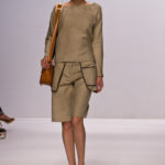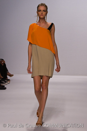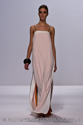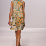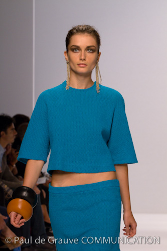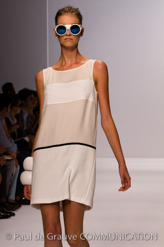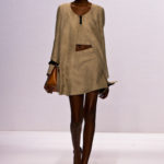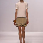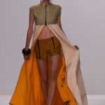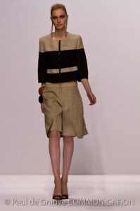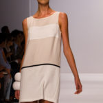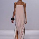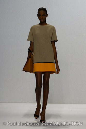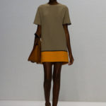 Dinamica, moderna, raffinata, la collezione di Alviero Martini 1° Classe, ha molte reminiscenze d’antan: ispirazione geometrica anni ’60. Affonda le radici in Mondrian/YSL anche se non ne usa i colori perché la collezione utilizza prevalentemente tonalità chiare, neutre e solo di tanto in tanto compaiono colori più accesi, come l’arancio, giallo zucca e il turchese, oltre il bianco e il nero. Ma ricorrendo agli insegnamenti del maestro YSL, la planarità della superficie dell’abito è rotta da segni scuri che talora limitano i riquadri talora verticalizzano la figura, a volte segnano l’orlo come nell’ampio abito bianco, dal corpino color canapa tagliato sotto il seno, fodera color zucca. Il segno scuro diventa una lunga zip che percorre la scollatura delle spalle.