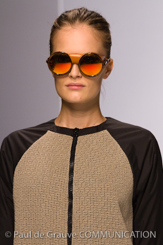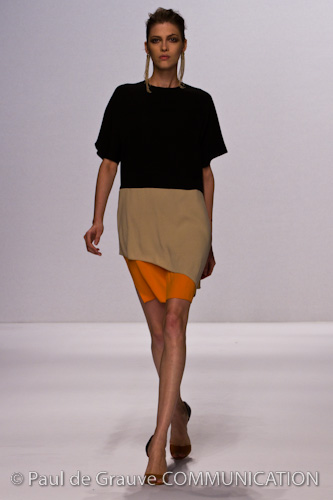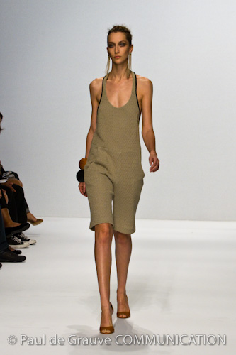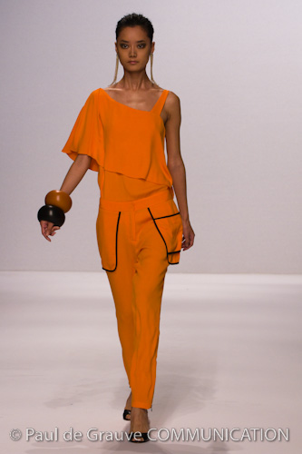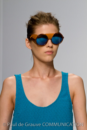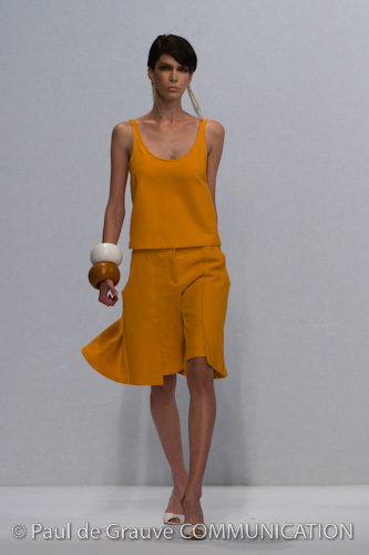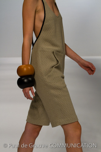 Abiti quindi di struttura geometrica, piana, dove solo le sovrapposizioni regalano volume. I tagli sono netti, squadrati accentuati dai contrasti di colore; taglio triangolare negli abiti lunghi a tunica per lasciare intravedere gli short corti di colore a contrasto; anche i tagli asimmetrici sono squadrati. La linea curva solo nelle scolature profonde davanti e nelle canotte; negli accessori borse e bracciali; nei grandi occhiali tondi dalla lente colorata che ricordano quelli dei saldatori.
