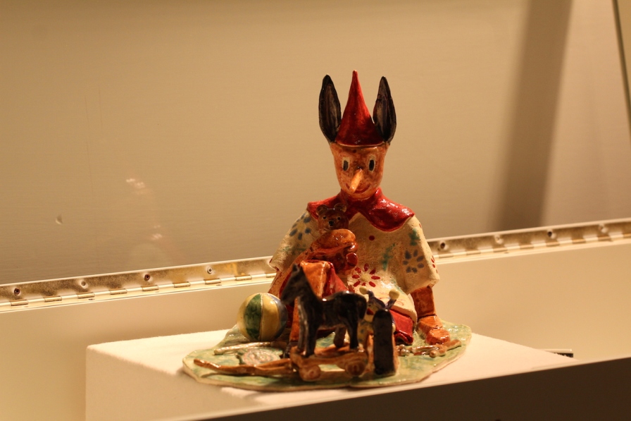 Esposte le fantastiche opere ceramiche di Francesco Vitale, dell’associazione Ceramicarte ed i pupazzi di stoffa di Ornella Schiroli, in collaborazione con la Biblioteca Civica Mortara di Casalmaggiore (che ha reperito le più originali e ricercate edizioni a stampa del libro di Pinocchio), mentre deliziosi bijoux attinti alle collezioni del museo, databili entro gli anni Trenta del ‘900 e mai presentati al pubblico, conferiscono alla rassegna il carattere di evento speciale e memorabile. In questi piccoli ornamenti – splendidi – i dettagli accurati ed i frequenti riferimenti iconografici al design pre-disneyano attestano l’interesse peculiare delle industrie bigiottiere di Casalmaggiore per le mode ed i trend dell’epoca nonché le strategie di marketing messe in atto per acquisire clienti e commesse, nella consapevolezza che Pinocchio sarebbe stato un successo.