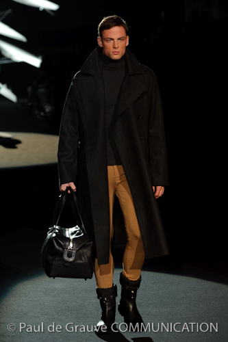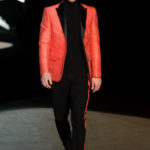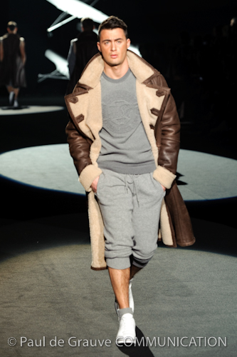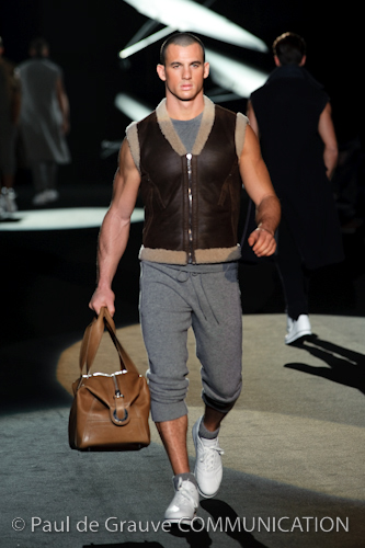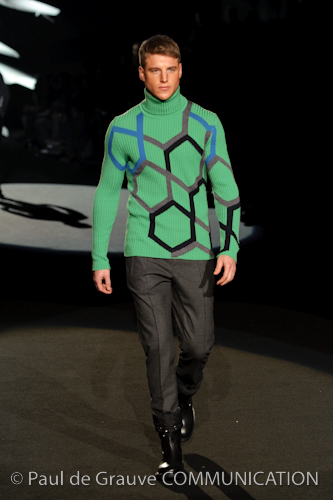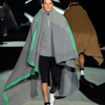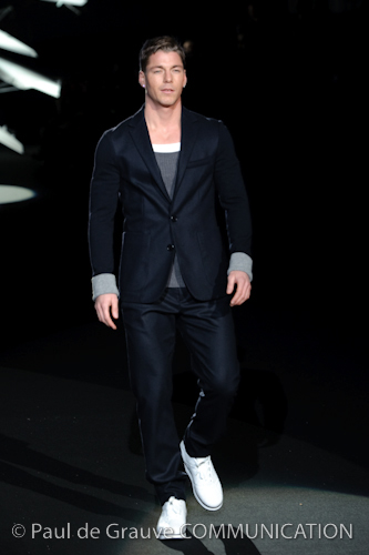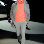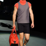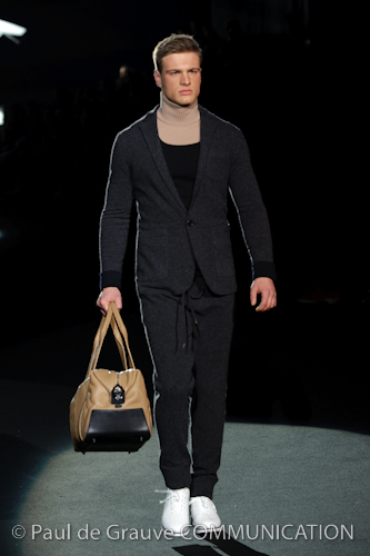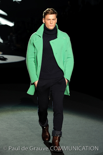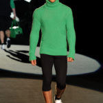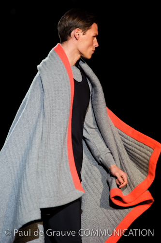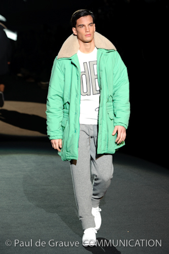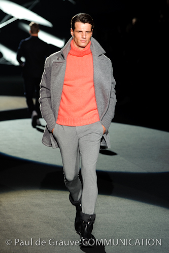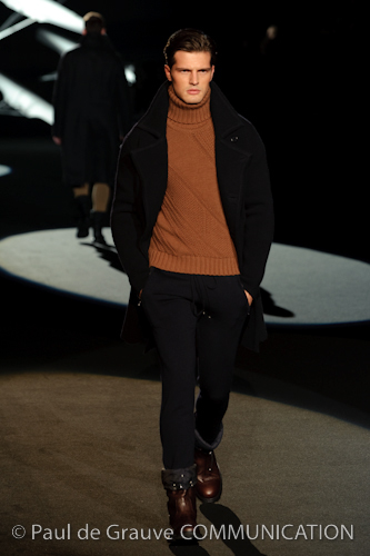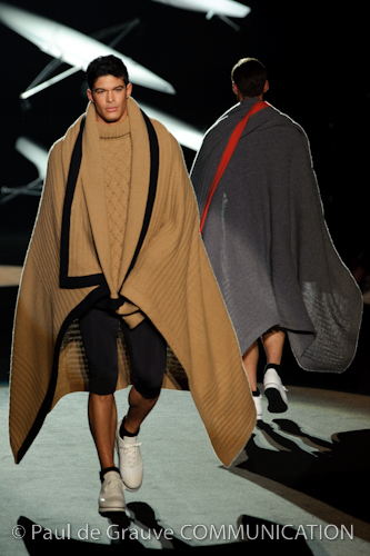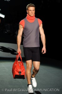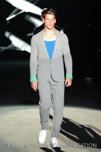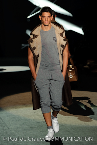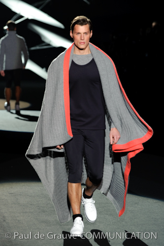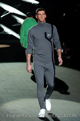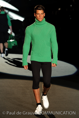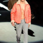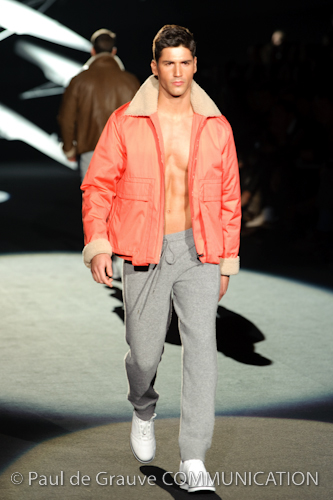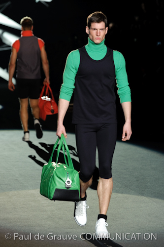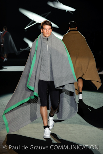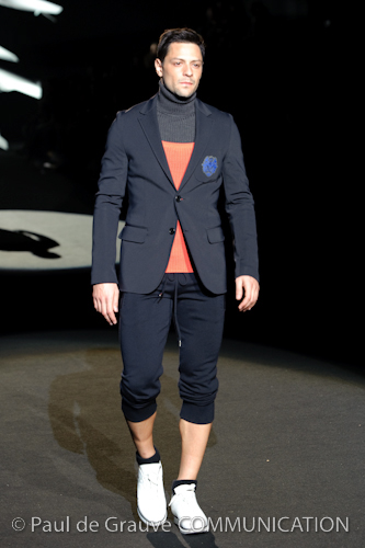 Naturalmente i capi più specifici, quelli adatti al momento della prestazione, non mancano, il body e la tuta, la t-shirt e la canotta coloratissime arancio. Ma intorno gira tutta una serie di capi che definiremmo più o meno distanti dalla riva utili al cultore della disciplina.I pants, la tuta, le sneakers, enormi scialli plaid necessari quando si scende dalla canoa, accompagnati da una sacca per attrezzi che diventa importante in pelle verde stampata ad esagoni. Per arrivare al circolo sportivo, capi pesanti, montoni, caban e cappotti senza maniche, confortevoli: lo stilista raccomanda che siano di un paio di taglie più grandi dell’abituale per non costringere la corporatura dell’atleta. Se accade che solamente si assista alla regata, allora è bello indossare un pullover di lana grossa collo alto con disegni a nido d’ape o a intreccio, o più lisci ma stampati sempre ad esagoni che si sovrappongono. Se la sera si festeggia la premiazione è tutta una sorpresa: anche gli ospiti saranno stupiti dalla giacca del tuxedo dal colore acceso arancio, ma a sorprendere basteranno anche solo i revers e banda bianchi o i revers e banda arancio su giacca e pantalone nero, sotto un maglione dolce vita, che talvolta ha anche esso perso le maniche.
