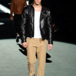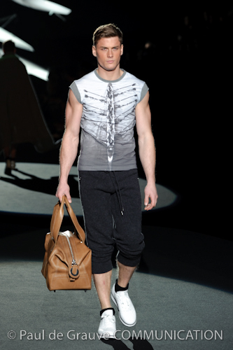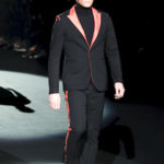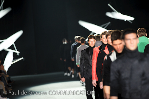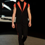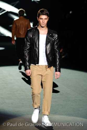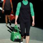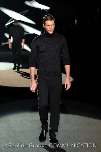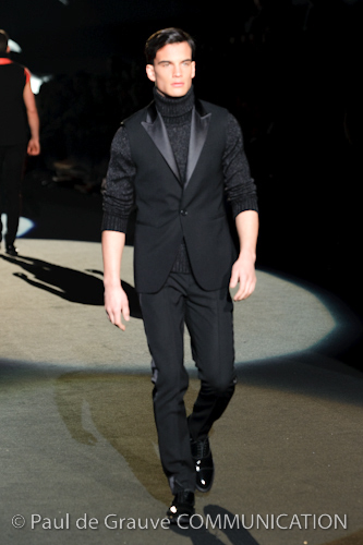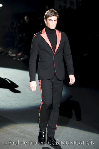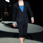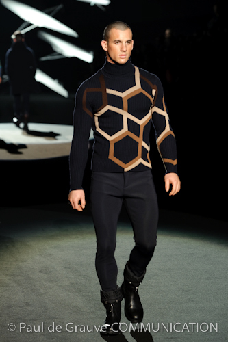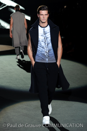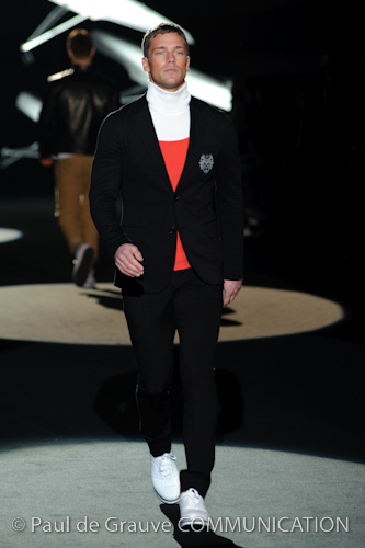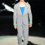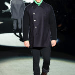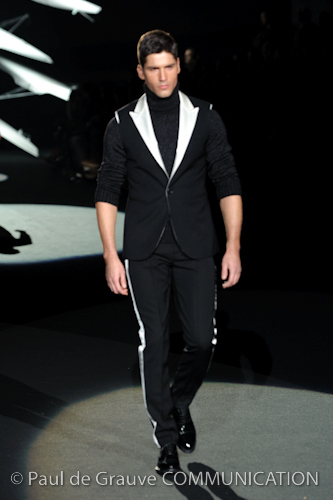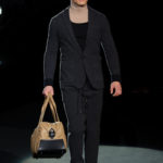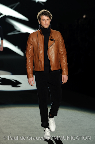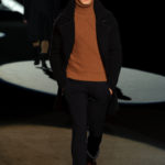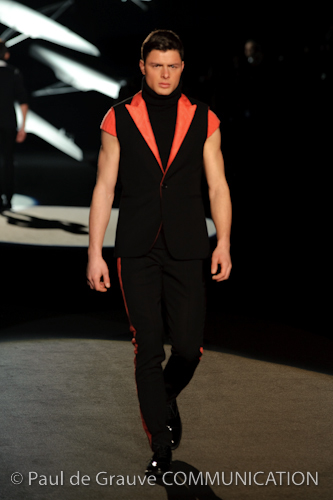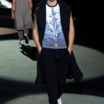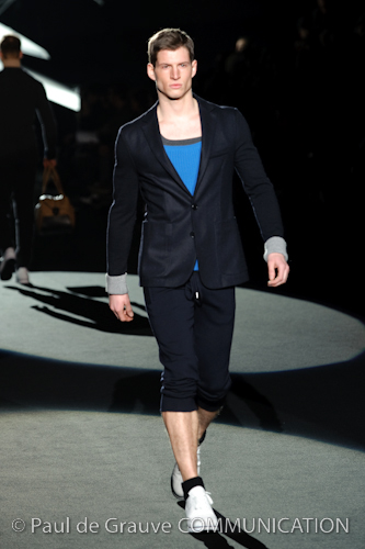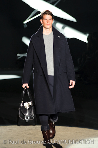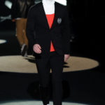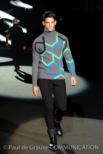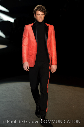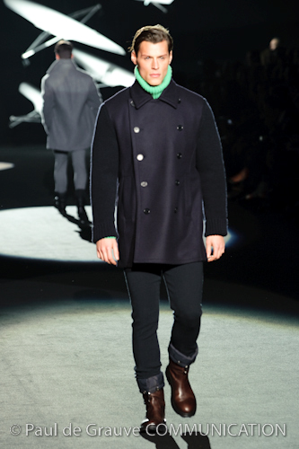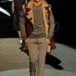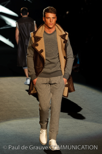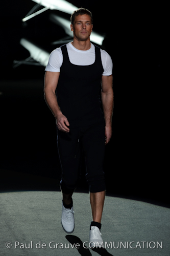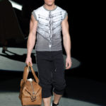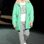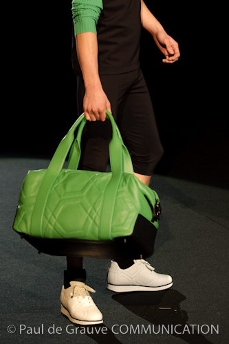 Naturalmente i capi più specifici, quelli adatti al momento della prestazione, non mancano, il body e la tuta, la t-shirt e la canotta coloratissime arancio. Ma intorno gira tutta una serie di capi che definiremmo più o meno distanti dalla riva utili al cultore della disciplina.I pants, la tuta, le sneakers, enormi scialli plaid necessari quando si scende dalla canoa, accompagnati da una sacca per attrezzi che diventa importante in pelle verde stampata ad esagoni. Per arrivare al circolo sportivo, capi pesanti, montoni, caban e cappotti senza maniche, confortevoli: lo stilista raccomanda che siano di un paio di taglie più grandi dell’abituale per non costringere la corporatura dell’atleta. Se accade che solamente si assista alla regata, allora è bello indossare un pullover di lana grossa collo alto con disegni a nido d’ape o a intreccio, o più lisci ma stampati sempre ad esagoni che si sovrappongono. Se la sera si festeggia la premiazione è tutta una sorpresa: anche gli ospiti saranno stupiti dalla giacca del tuxedo dal colore acceso arancio, ma a sorprendere basteranno anche solo i revers e banda bianchi o i revers e banda arancio su giacca e pantalone nero, sotto un maglione dolce vita, che talvolta ha anche esso perso le maniche.