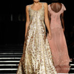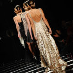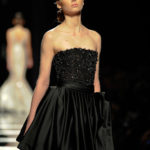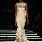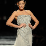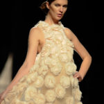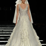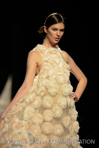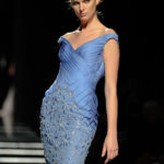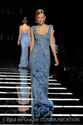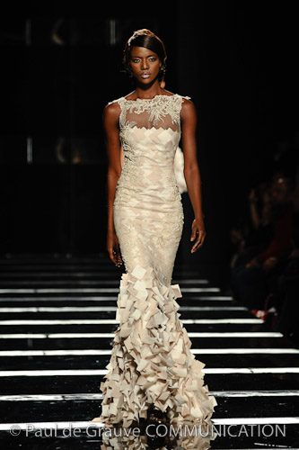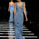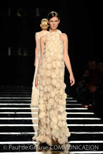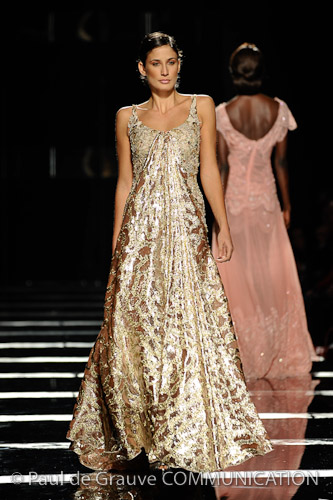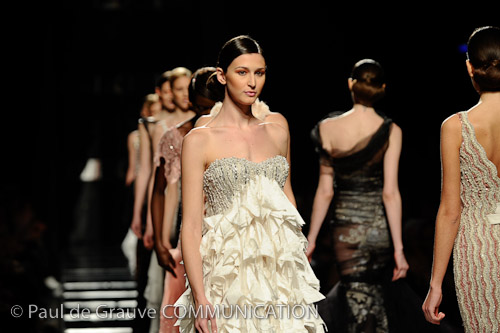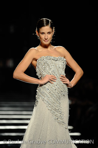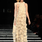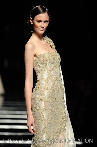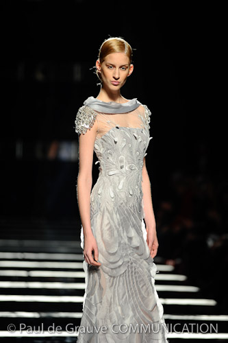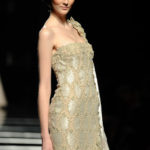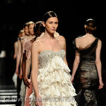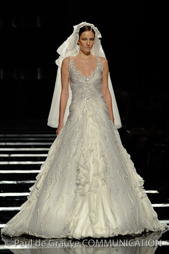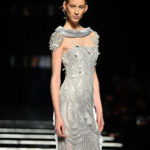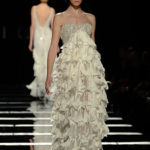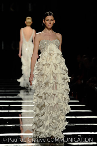 Sfilano strascichi, velature e ricchi ricami, origami in tessuto dalle forme essenziali e geometriche. Linee architettoniche spuntano a condizionare gli orli delle gonne, come particolari in rilievo o “incisi” sulle stoffe. Lo chiffon, il tulle e l’organza si tingono di bianco e di nero. Dominano il grigio e le sfumature argento, il rosa antico e metallizzato, il celeste, il beige e il greige.