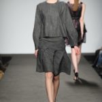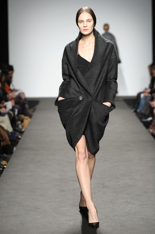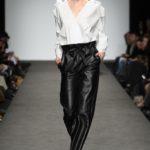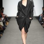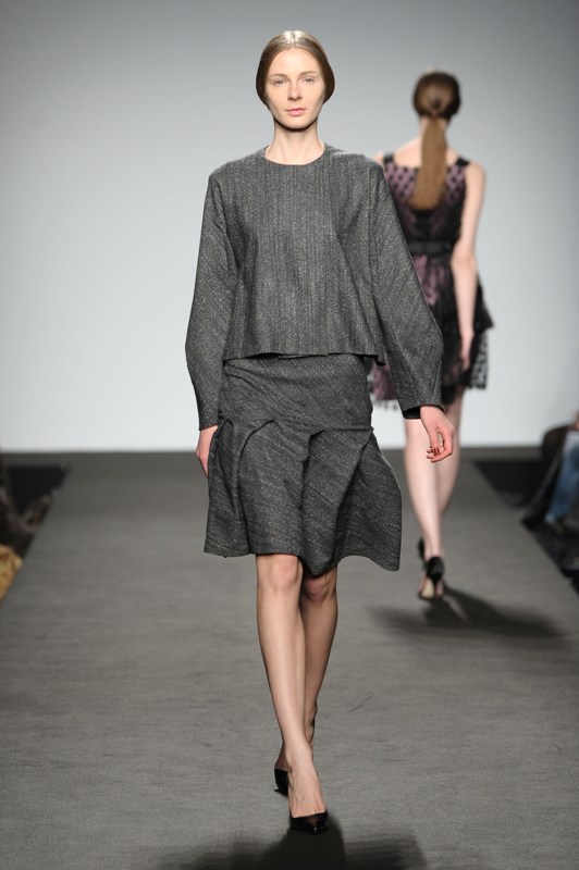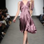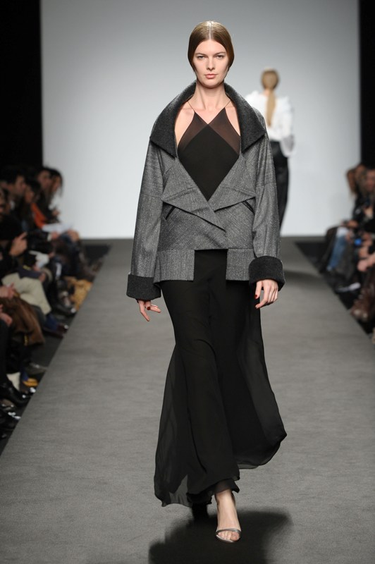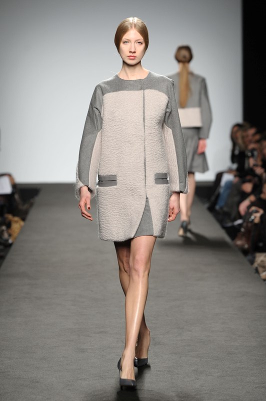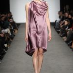Giacche e cappoti in pelliccia ecologica,in cashemire e lana tweed; raso di seta, crêpe, pizzo per gli abiti da sera, mentre i colori si muovo dal blu lavanda, verde oliva, nero, grigio glicine per una collezione elegante, femminile all’insegna della leggerezza.