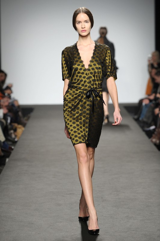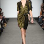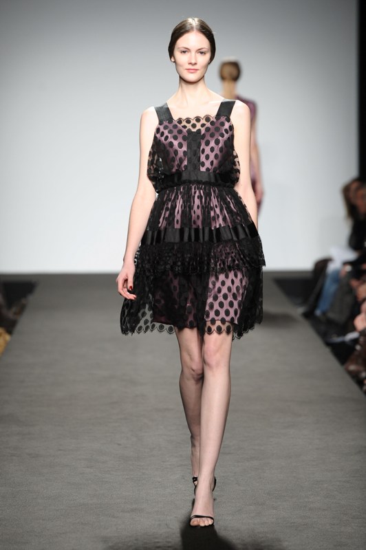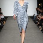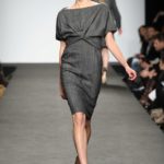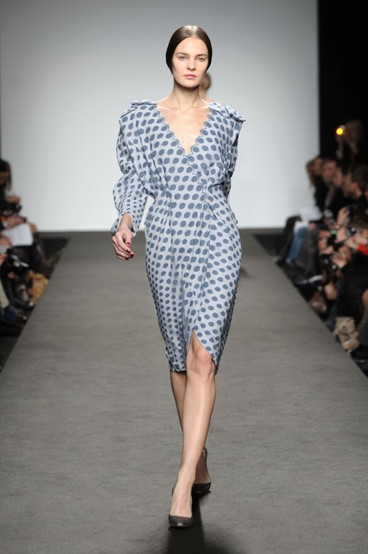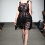 Rimane comunque il fatto che Angelo Bratis ha imparato bene la tecnica del drappeggio che usa indifferentemente per abiti da sera e mezza sera, gli intrecci di nastri, e di tessuto che formano nodi: abiti senza cuciture dove il tessuto leggero è solo puntato per creare movimento. Ma è senza cucitura anche il capospalla, corposo, architettonico che acquista in questo modo una linea cocoon. Geometrie create da intarsi di materiali diversi, intarsi e losanghe dello stesso tessuto, nastri che dividono geometricamente l’abitino di pizzo a pois.