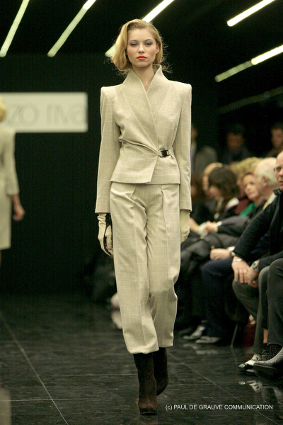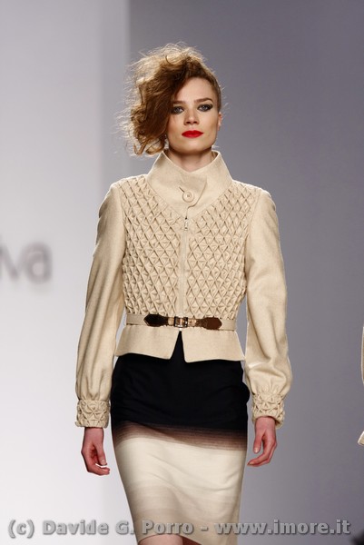Talvolta abbiamo sottolineato, come per la collezione a/i 2009/10, un doppio registro nella definizione della donna che intendeva vestire. I capi del mattino rispecchiavano la tradizione sartoriale dello stile Riva che si rivolge a una donna dall’eleganza accuratissima ma comunque severa e sobria nell’insieme. Per la sera lo stilista sceglieva in quella occasione una rappresentazione femminile più disinvolta, di una donna che mira a sedurre con l’abito e con il corpo.