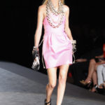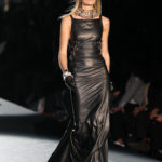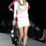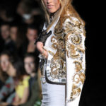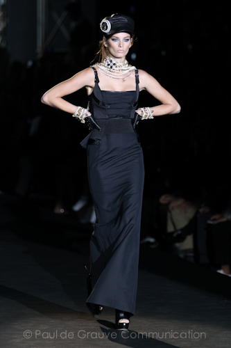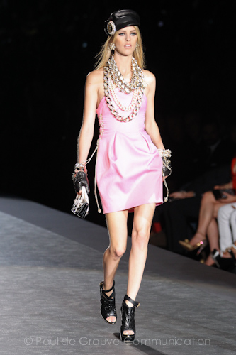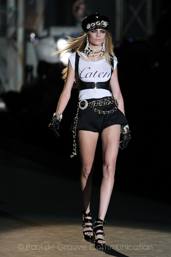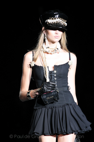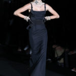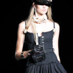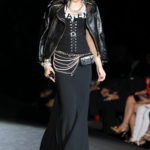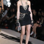 Tessuti diversi si avvicinano, pizzo e tramati preziosi accostati a jeans e pitone, per un effetto inaspettatamente armonioso. La logomania è molto anni Novanta e i cuori che spuntano qua e là danno anche un tocco romantico imprevisto. Gli accessori sono ovunque, ricchi e pregiati, uniscono come una serie di anelli il passato e il presente: pioggia di perle e catene ad effetto maglia che arricchiscono ogni look illuminandolo d’oro. Le borse sono mini, davvero piccole come portagioie nascosti tra le mani, come piccoli pacchetti regalo sorretti da collane di perle, o piccole clutch fissate alle estremità di una sciarpina. Anche i boot spuntati dai tacchi vertiginosi sono ricamati con gli stessi motivi che ritroviamo sugli abiti, rigorosamente neri si abbinano alle coppole lucide da biker.