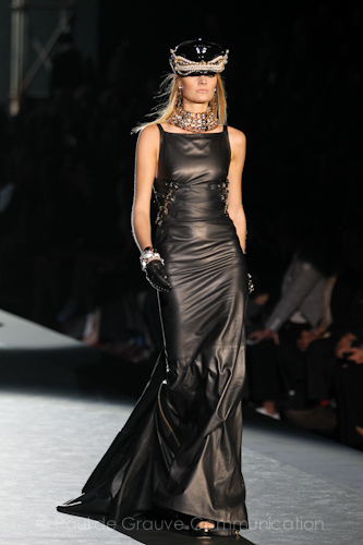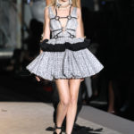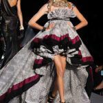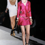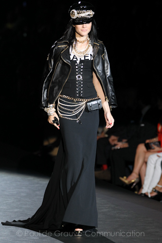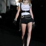Il tema principale del biker-couture anni ’90 è d’ispirazione per tutto lo show, sapientemente ricercato negli outfit da giorno e calibrato in quelli da sera. Gambe in primo piano svettano da aderenti hot pants e culottes a vita alta, mini abiti strutturati e super costruiti, chiodo e cappellini con borchie da motociclista in vernice e pelle, sono gli abbinamenti della giornata. Per la sera il mondo biker e quello couture, in apparenza molto lontani, si fondono dando vita a lunghi abiti aderenti e sinuosi o ampi e rigonfi in stampa maculata.