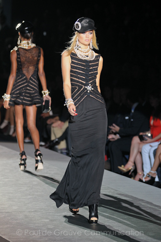 I colori sono pochi: solo brevi tocchi di rosa pastello, fuxia o rosso e l’oro delle catene illuminano una collezione bianca e nera.