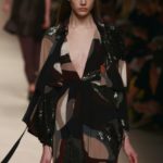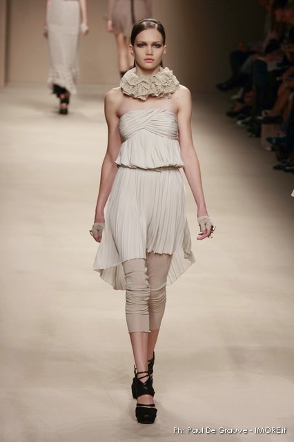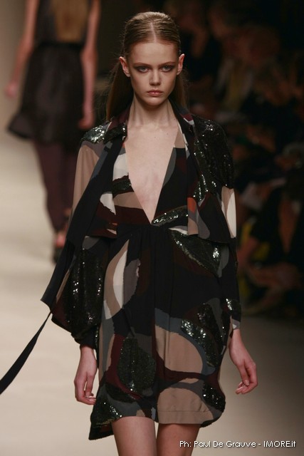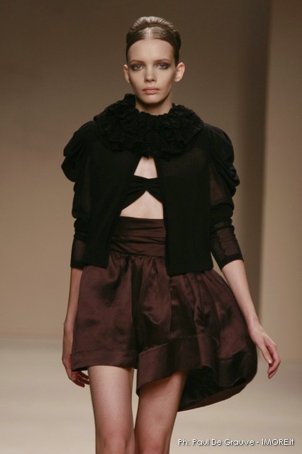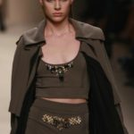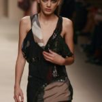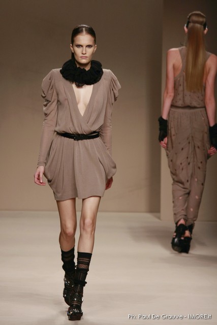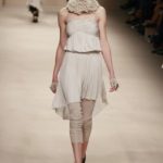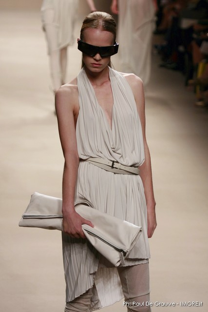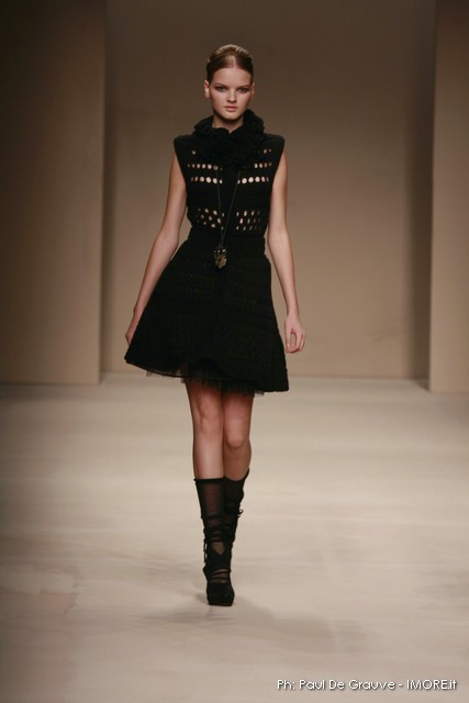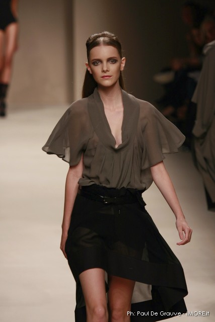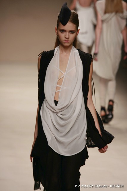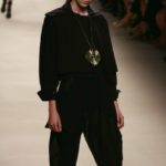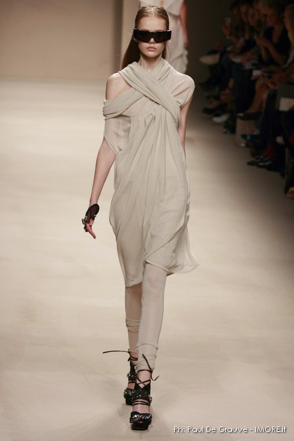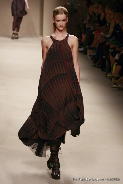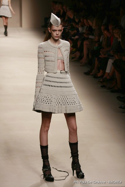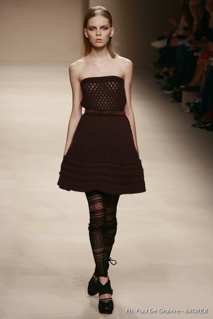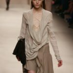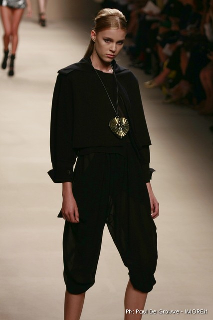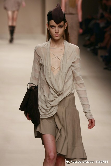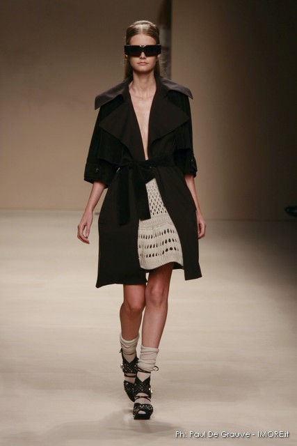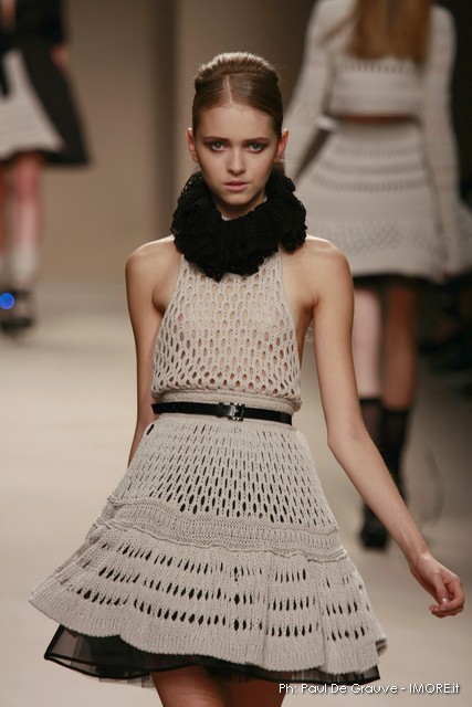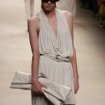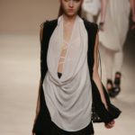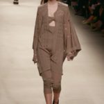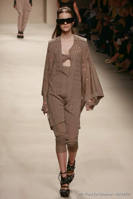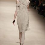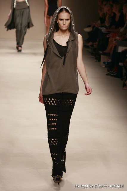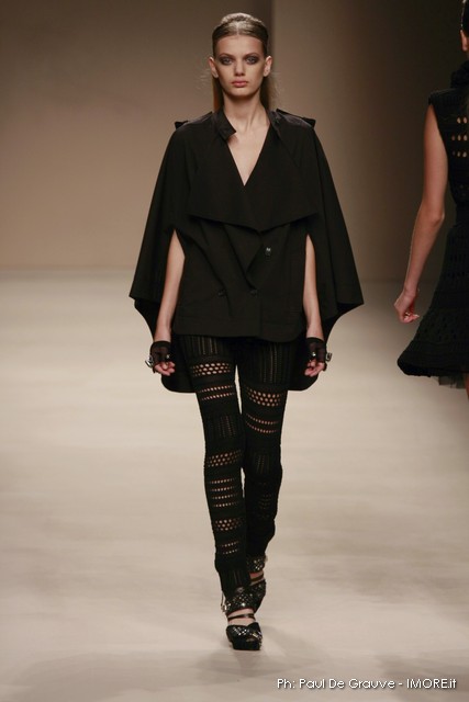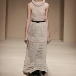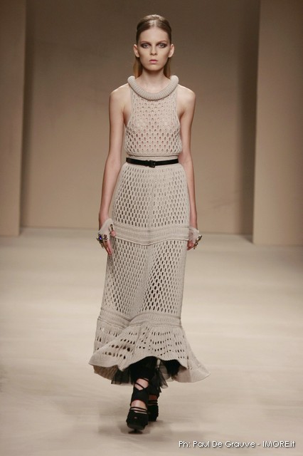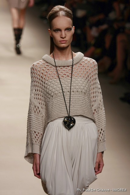 Così sulla passerella caftani di impronta nomade, abiti e tailleurs dall’aspetto voluminoso, ponchi cocoon e cappottini sartoriali. Ma anche semplici pull dai volumi ampi e stretti che creano movimenti sinuosi e che, pur coprendo il corpo, lo rendono sensuale. Sfilano abiti realizzati in rete crochet con ampie gonne a pouf, oppure drappeggiati e plissettati in jersey crepe o, addirittura, in maglie rasate talmente sottili da sembrare quasi chiffon. Il tutto, attraverso giochi di ombre e volumi, pieni e vuoti, chiari e scuri.