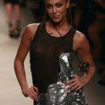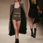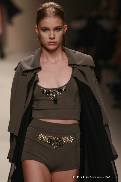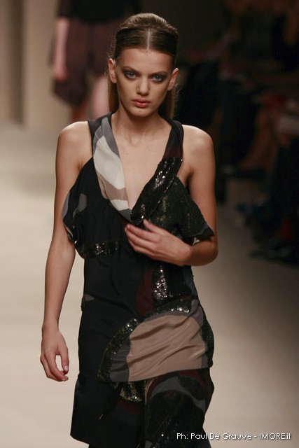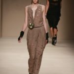 I toni sono naturali, dal mastice al bianco sporco fino al beige, caldi e freddi, e sono mescolati con l’ebano fino ad arrivare al nero e a un verde a metà tra il salvia e il kaki. Non mancano paillettes iridescenti e metalliche, applicazioni gioiello, pietre e lustrini. Si tratta di una palette soft, dai colori assolutamente non vivaci, per una collezione dal forte impatto e poco classica, disegnata per la terza stagione consecutiva dal giovane Albino d’Amato.