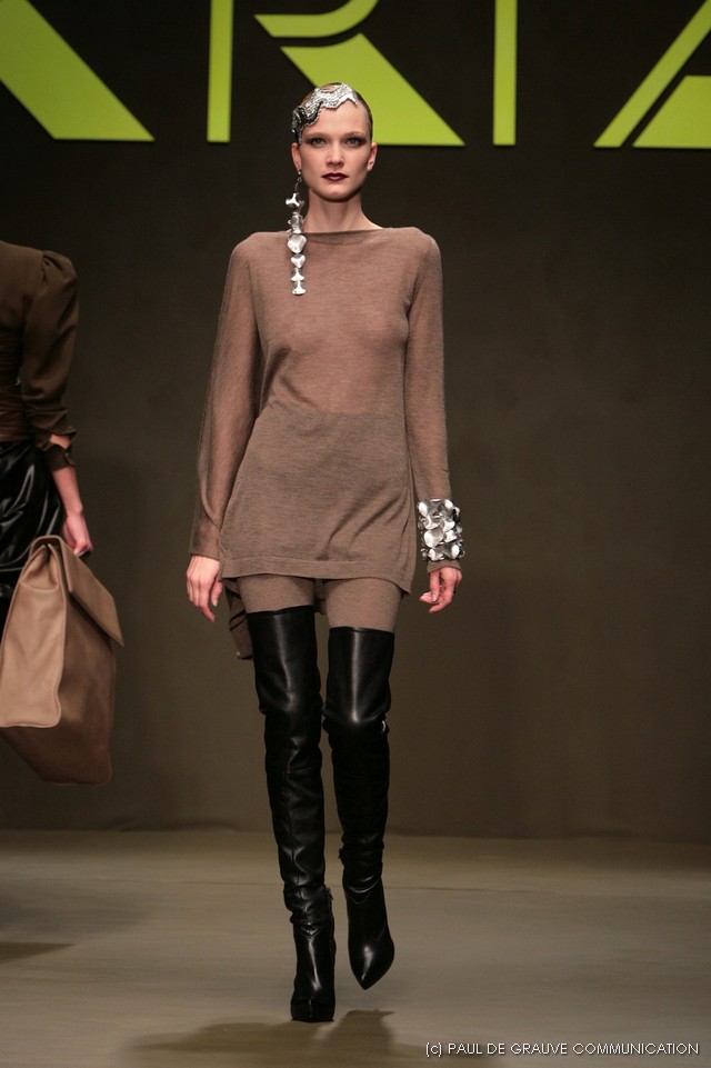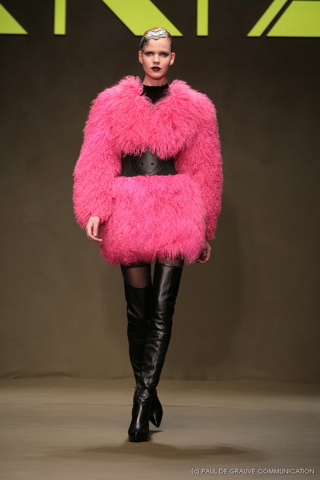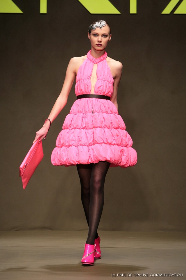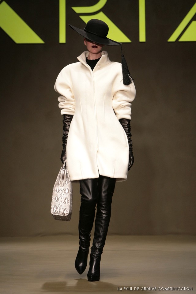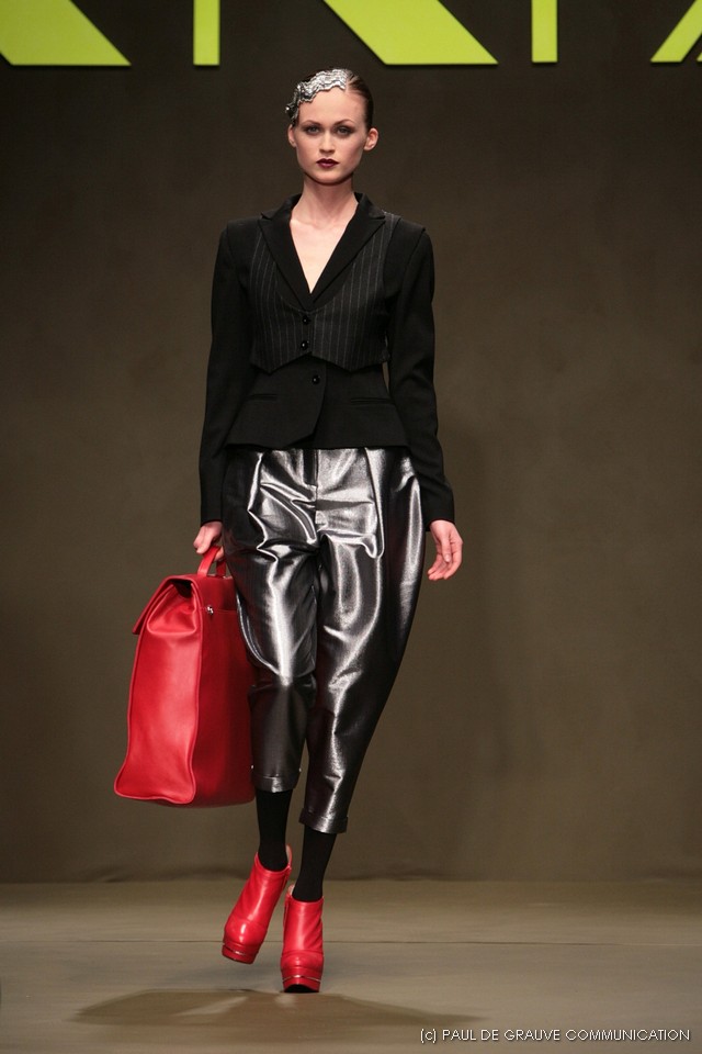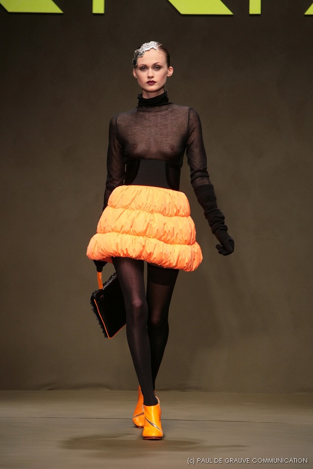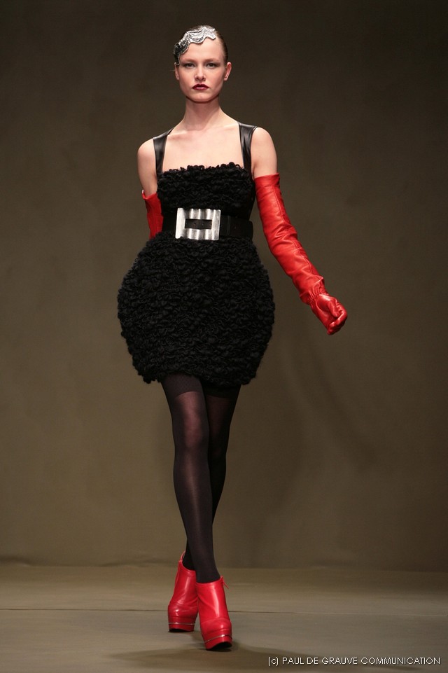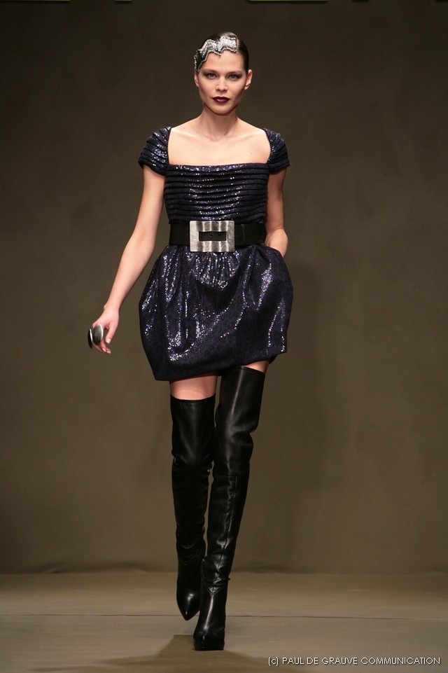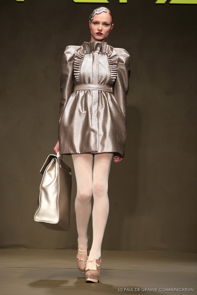 La linea ad anfora raggiunge una elegantissima espressione nell’abito lungo rosso cupo. Risulta più sbarazzina negli abiti corti da sera realizzati in diversi materiali, accompagnati di dettagli di pelliccia sintetica mongolia, giallo, fuxia, arancio o portati con corti soprabiti dello stesso materiale. Si fa meno evidente, lasciando spazio ad una linea corolla negli abitini a balze in colori solari. Si perde negli abiti lunghi scivolati e mossi in tessuto argento o in quelli a balze che ricordano lo stile charleston degli anni “˜20/’30.