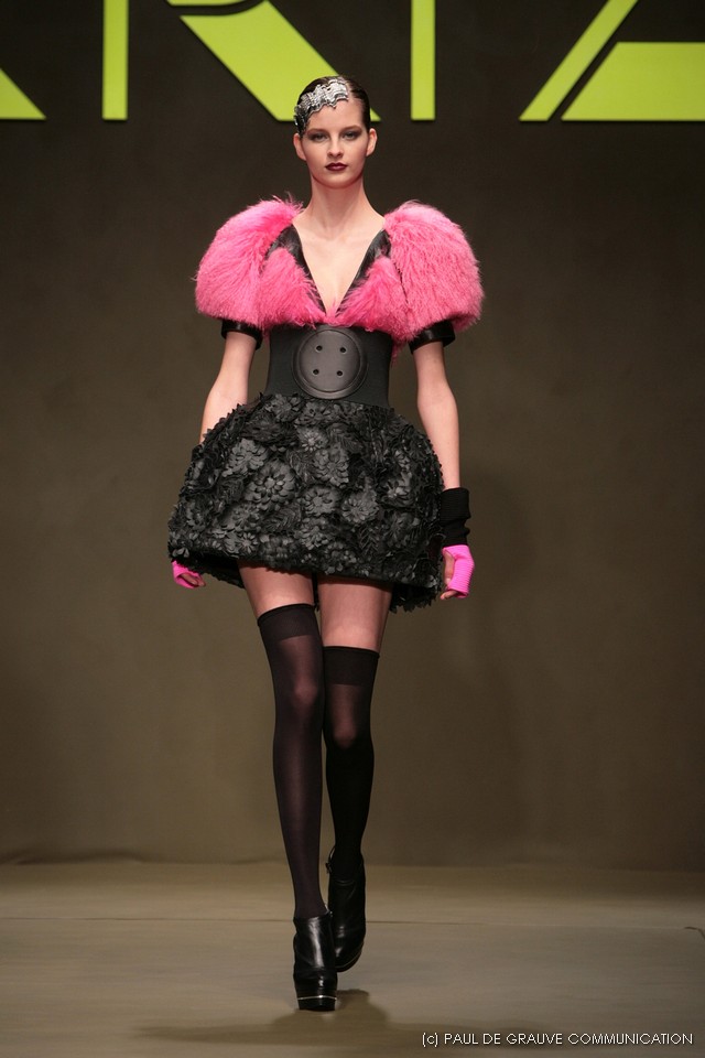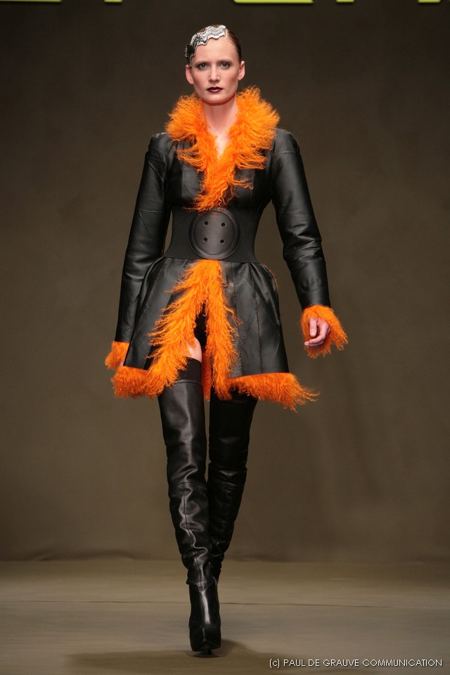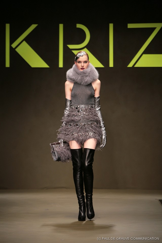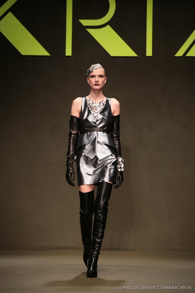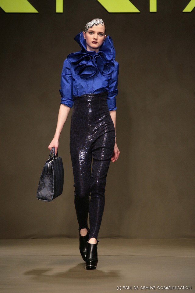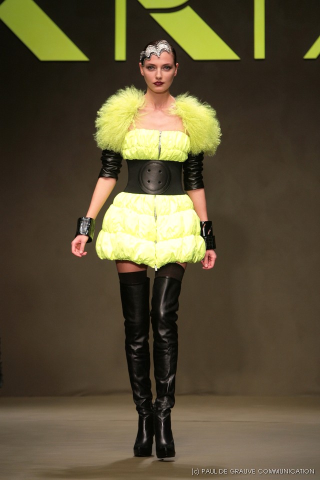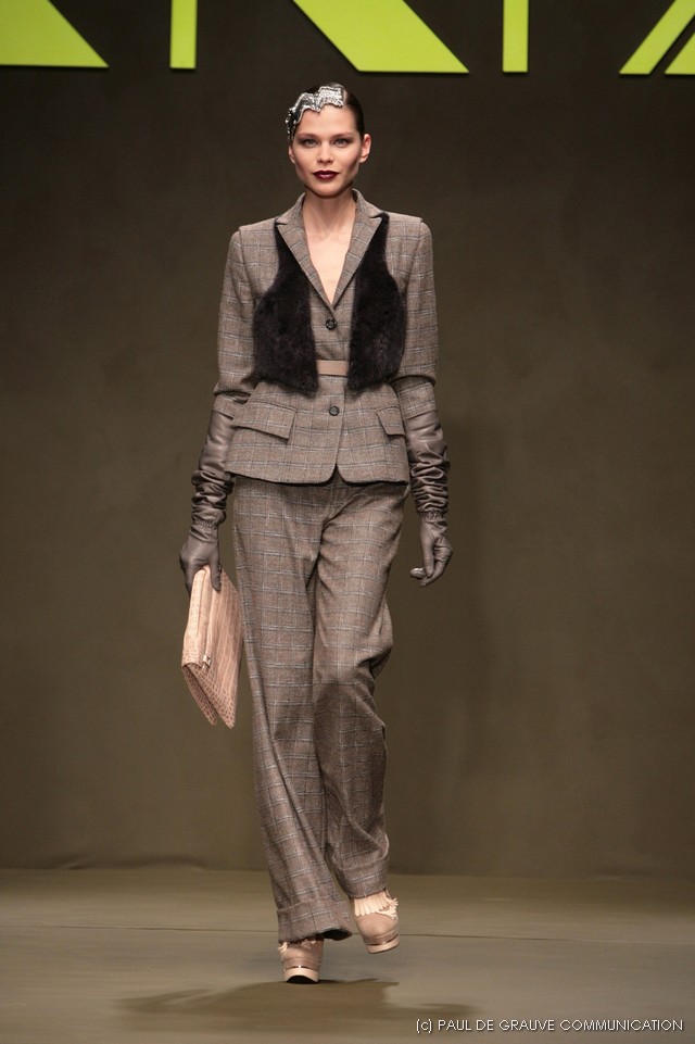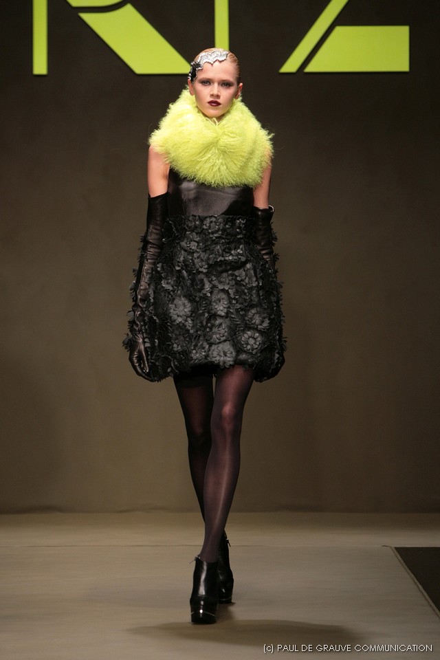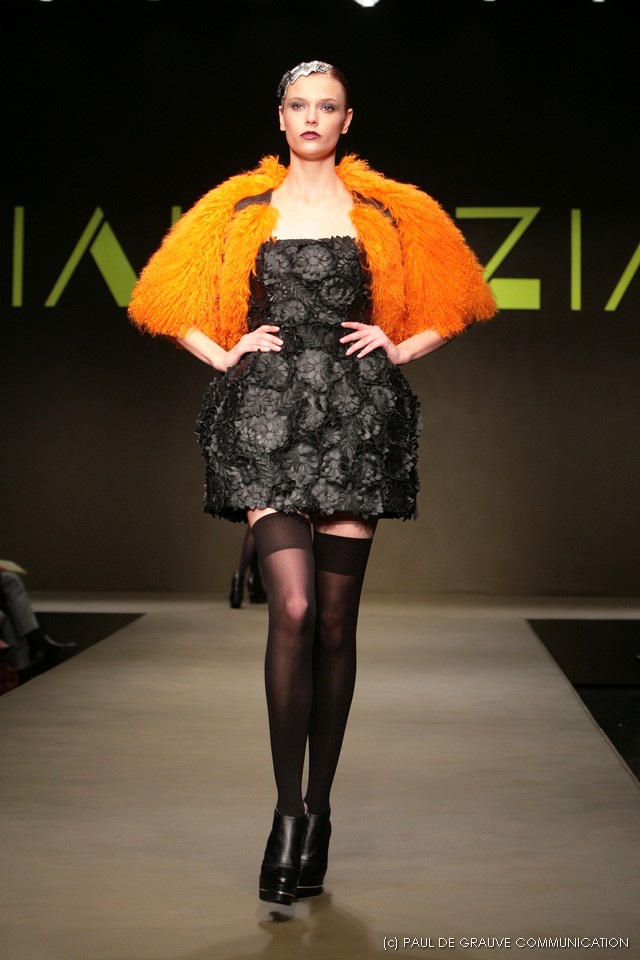 La linea ad anfora raggiunge una elegantissima espressione nell’abito lungo rosso cupo. Risulta più sbarazzina negli abiti corti da sera realizzati in diversi materiali, accompagnati di dettagli di pelliccia sintetica mongolia, giallo, fuxia, arancio o portati con corti soprabiti dello stesso materiale. Si fa meno evidente, lasciando spazio ad una linea corolla negli abitini a balze in colori solari. Si perde negli abiti lunghi scivolati e mossi in tessuto argento o in quelli a balze che ricordano lo stile charleston degli anni “˜20/’30.