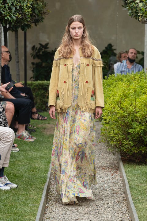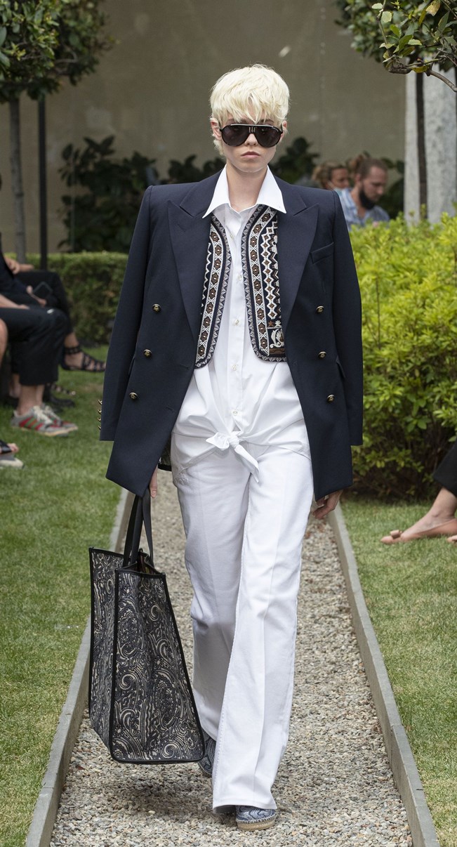 L’iconico paisley Etro mantiene inalterato il suo fascino anche nei nuovi abbinamenti più discreti e meno infiammati. I tagli sartoriali sono volutamente puliti e minimal, persino le ruches non appaiono ampollose. Niente di netto o tagliente si intenda. I contrafforti delle fantasie dei tessuti giocano a favore della fluidità. L’appeal è divinamente pulito e sobrio.