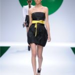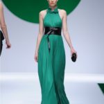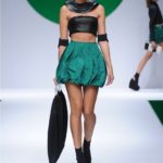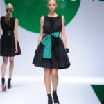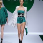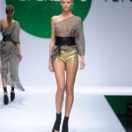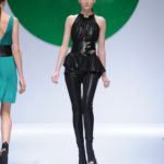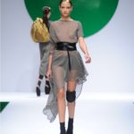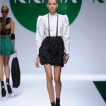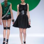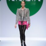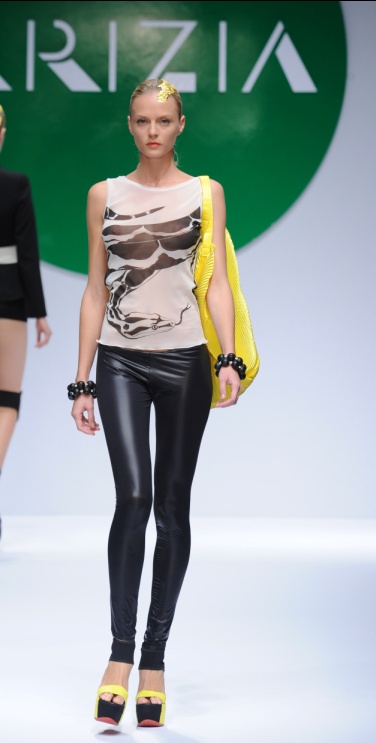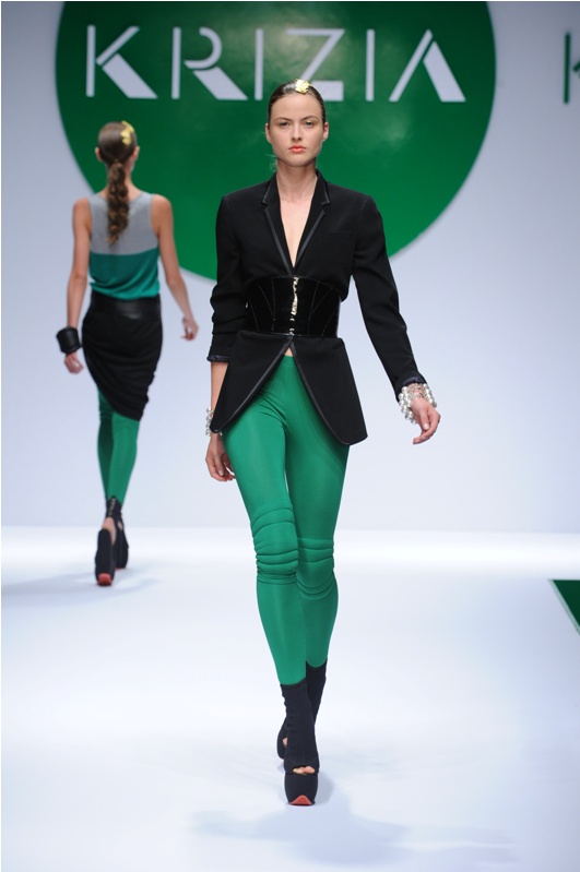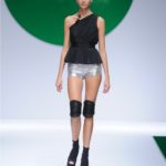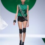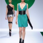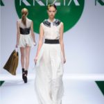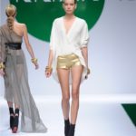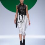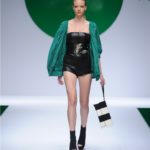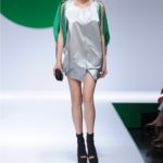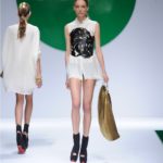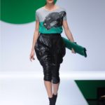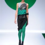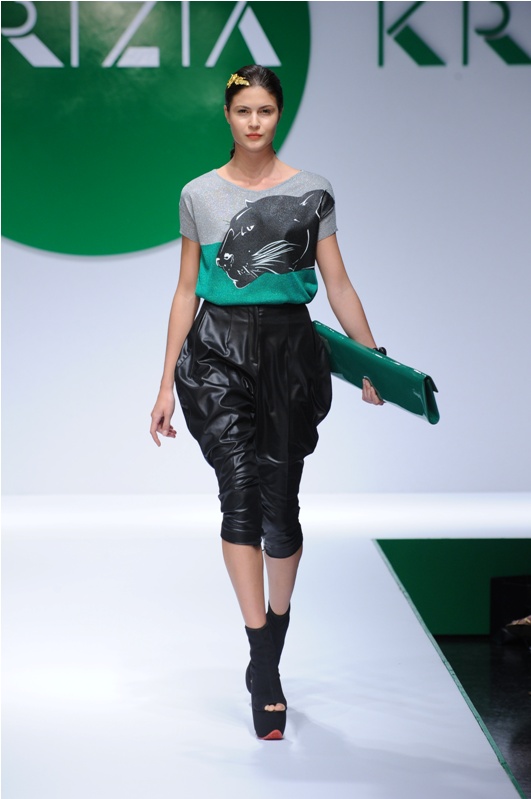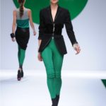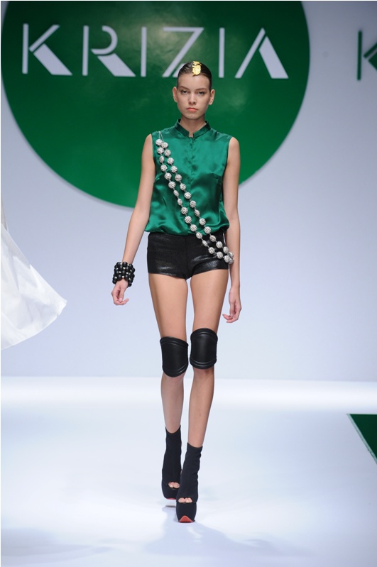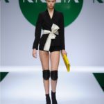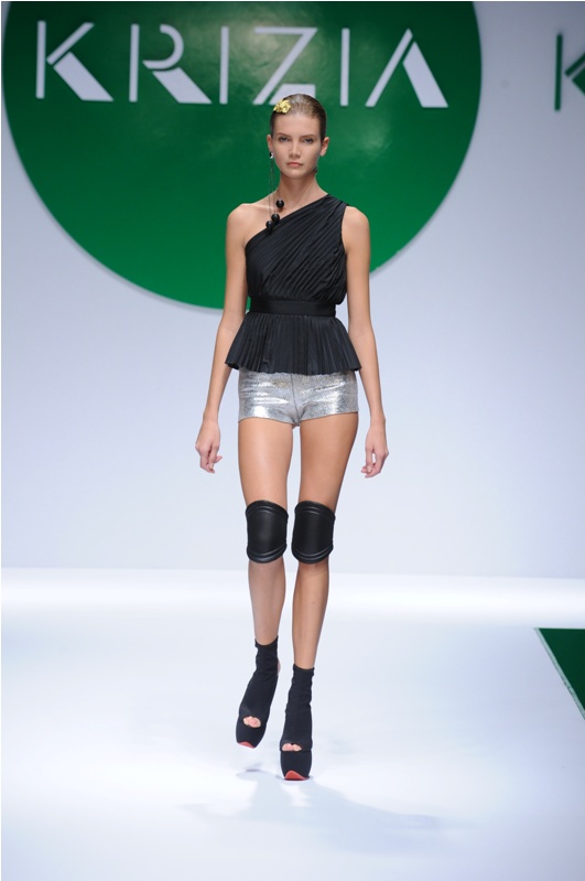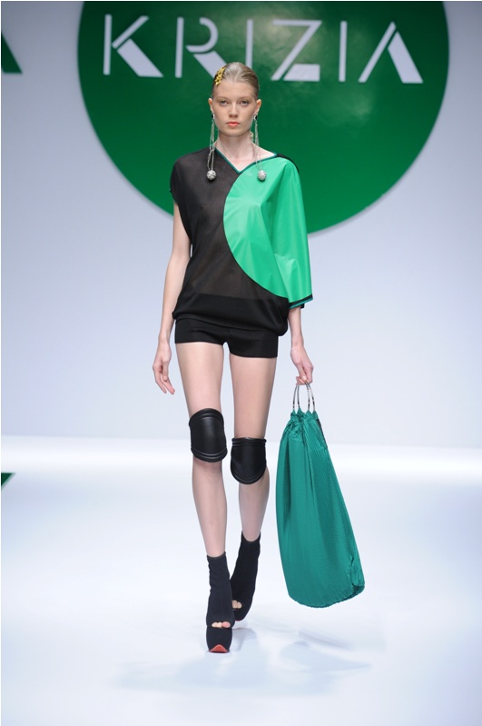 Ginocchiere, paragomiti in maglia spalmata , spalline imbottite, leggins con ginocchiere incorporate, così come Krizia le ha concepite troveranno il loro percorso nel mondo femminile dello sport: sono “accessori” belli. Ma certamente non riusciamo a pensarli come accessori che completano nella quotidianità un tailleur con short cortissimi – ammissibili solo in passerella per dare enfasi all’insieme- portati con giacca nera chiusa in vita da un bellissimo fiocco origami bianco, pochette lunga almeno 50 cm. A loro volta gli short cortissimi in tessuto tecnico spalmato e lucido con ginocchiere e paragomiti avranno successo sulla strada dello sport-chic con una canotta o t-shirt adeguata, che possono sostituire la camicia di seta verde collo coreano completata da una lunga collana di grosse perle argento indossata di traverso come fosse una stola o la bellissima t-shirt nera con un grande intarsio a cerchio verde; ambedue proponibili sulle strade cittadine con un bel pantalone skinny.