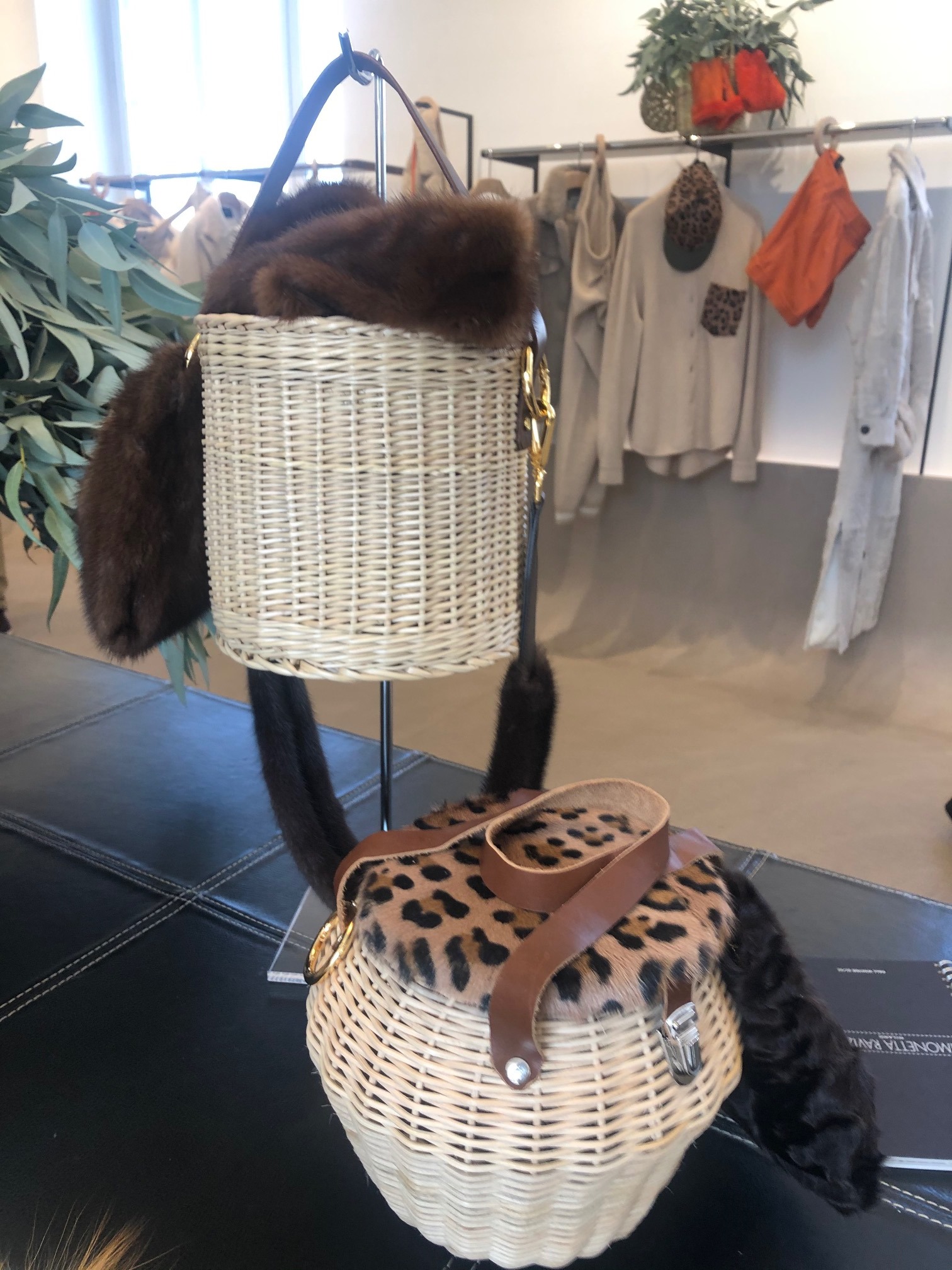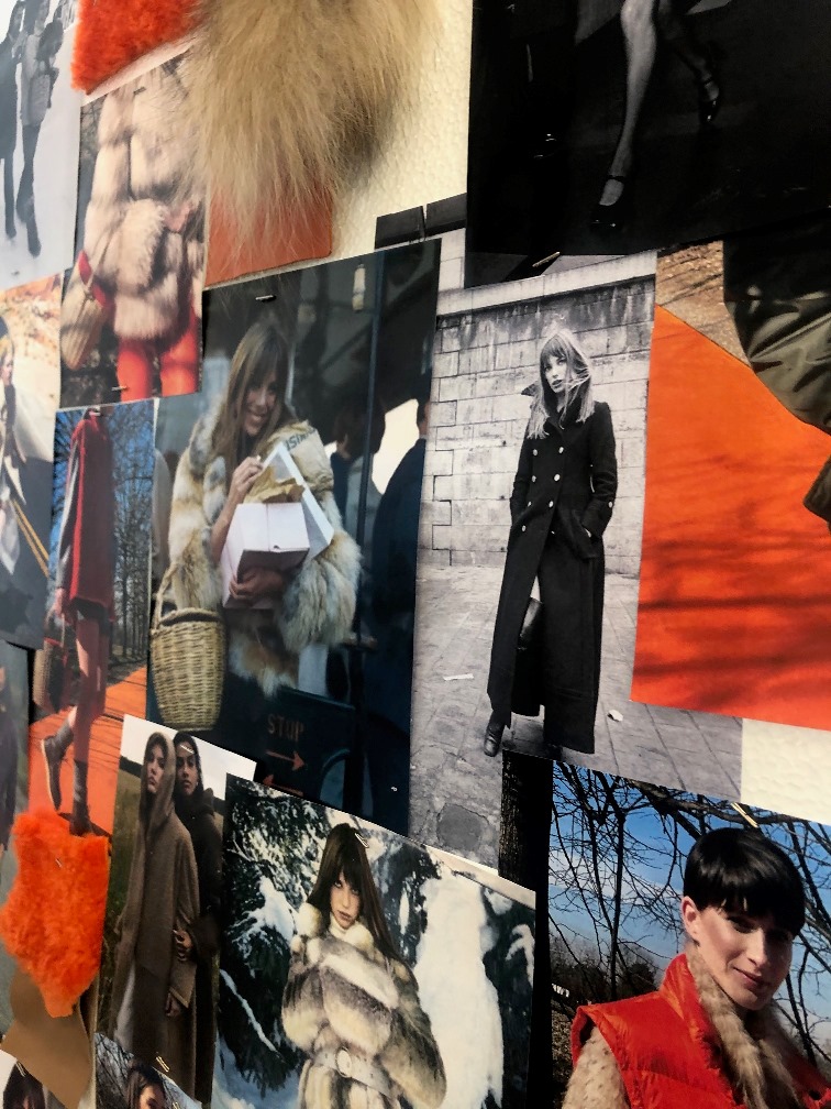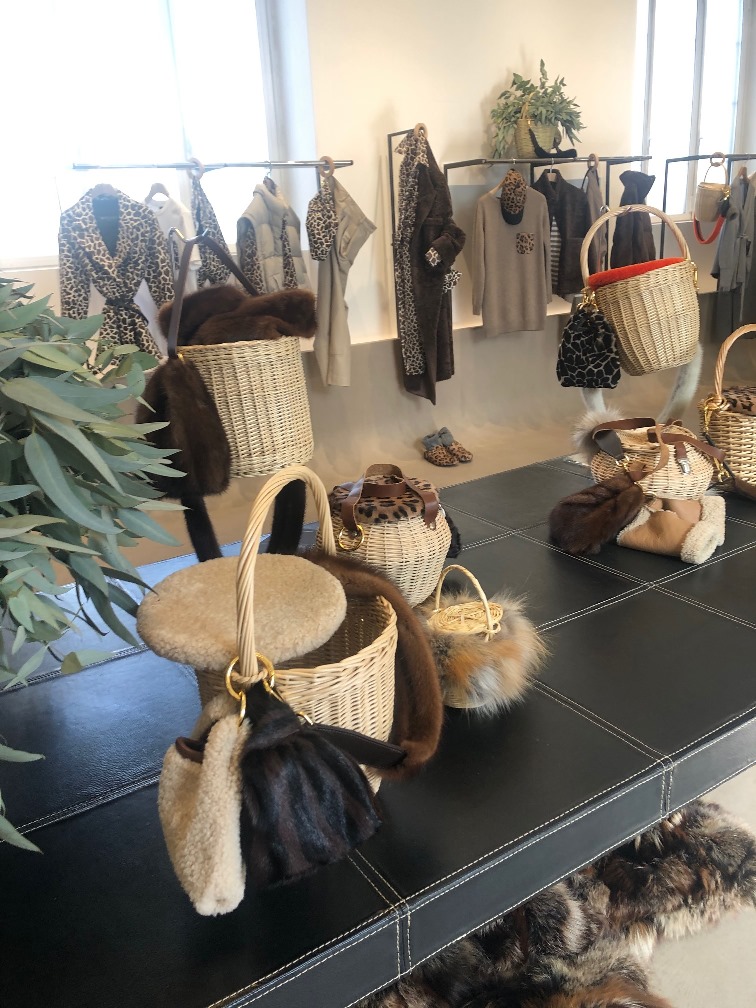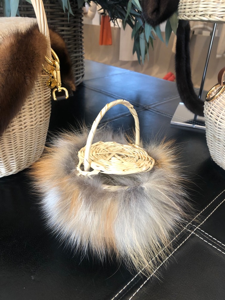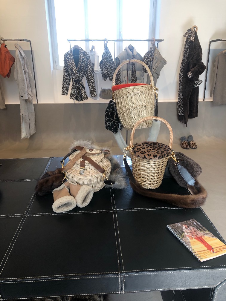 Simonetta Ravizza nel presentare la collezione, sottolinea che la fonte di ispirazione è stata l’eleganza senza tempo di Jane Birkin. Con compiacimento ci mostra un manifesto di fotografie in cui l’attrice-cantante -a cui Hermes ha dedicato a una borsa divenuta anche essa una icona, chiamandola per l’appunto Birkin Bag– che indossa con leggerezza e charme un cestello di midollino. L’idea è piaciuta alla nostra stilista che ha inserito nella sua collezione questo semplice accessorio -capace di alleggerire, sdrammatizzare, rendere gioioso qualsiasi capo-, impreziosendolo con dettagli di pelliccia.