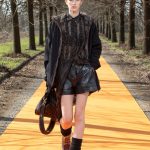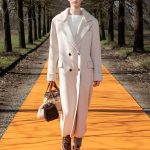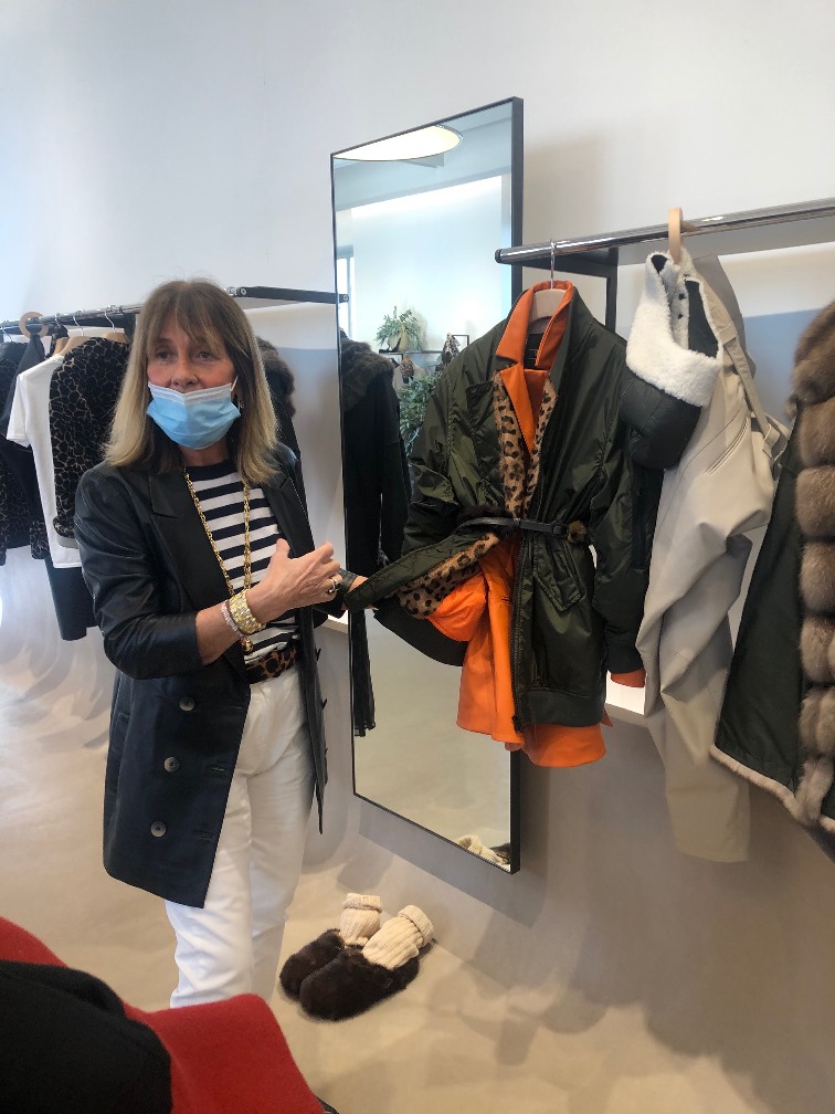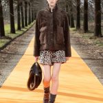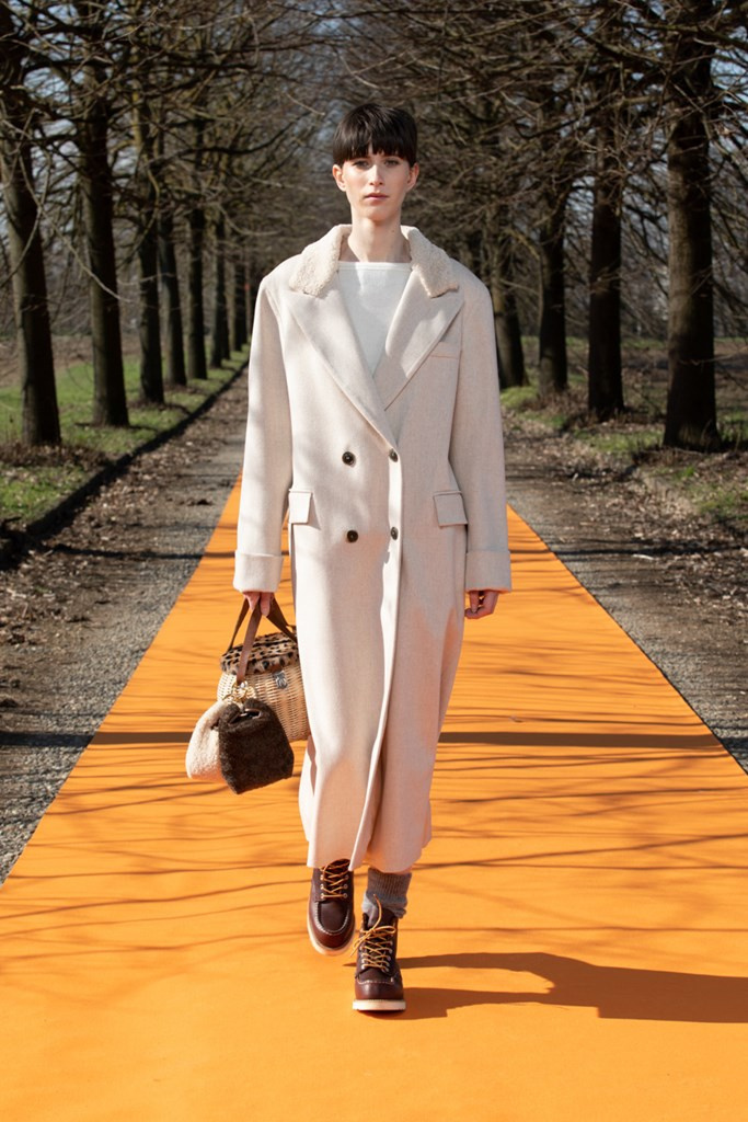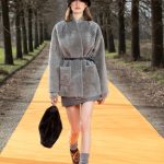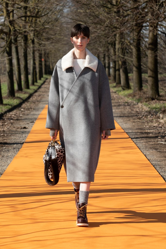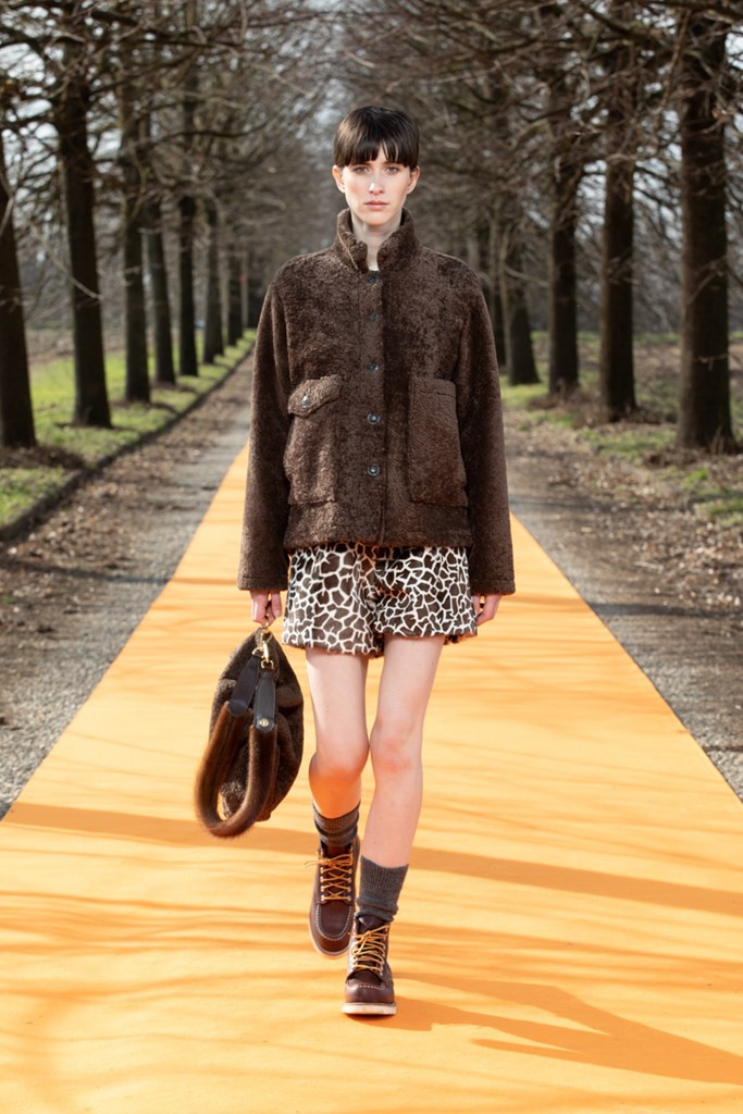 Simonetta Ravizza amplia la sua proposta. Sostituisce la calda e preziosa pelliccia con cappotti in cashmere double-face dalla bella linea incrociata e chiusa con un unico bottone. Propone piumini non in tessuto tecnico, ma in prezioso cachemire o in morbida pelle; ripropone montoni dal taglio over leggeri e morbidi, color arancio o nelle nuove stampe a giraffa, o in grigio antracite. E viene da chiedersi: riuscirà il moderno shearling a sostituire nelle prossime stagioni i piumini oramai obsoleti? Troviamo ancora capispalla in pellami di pecora, che potremmo definire “poveri”, come il cappotto bianco che ricorda la texture del persiano Breitschwanz, ma anche la giacca in volpe.