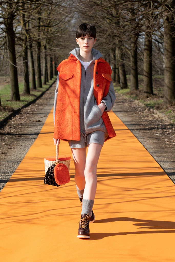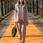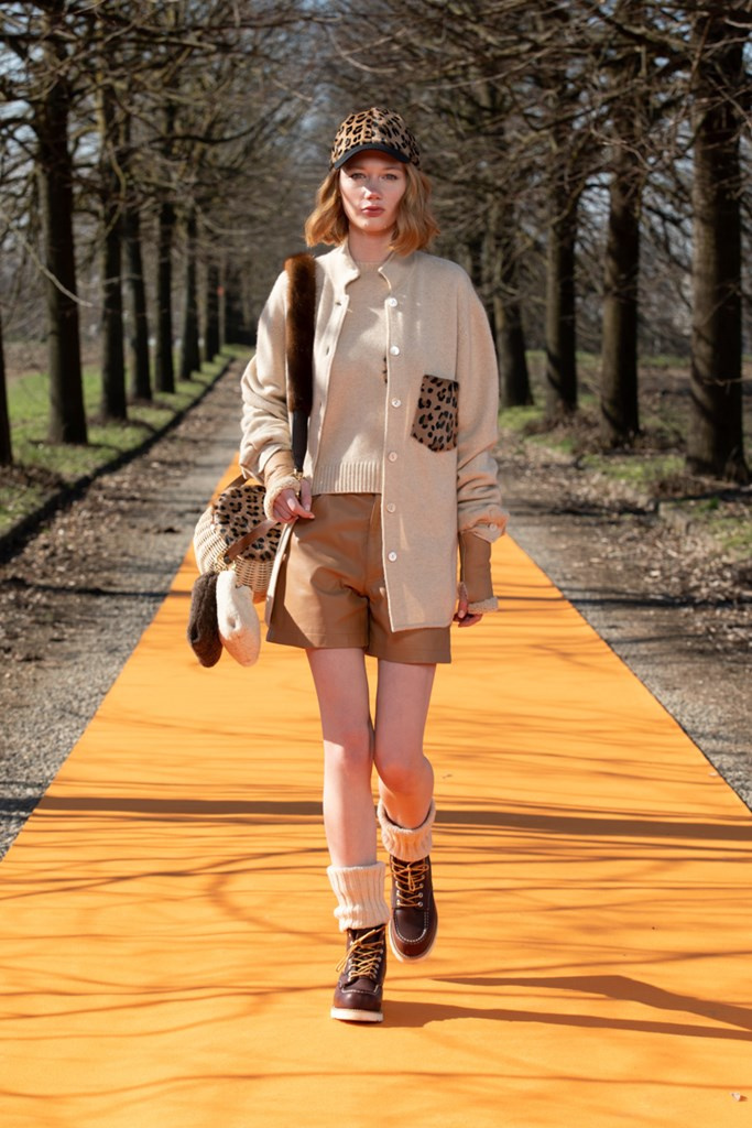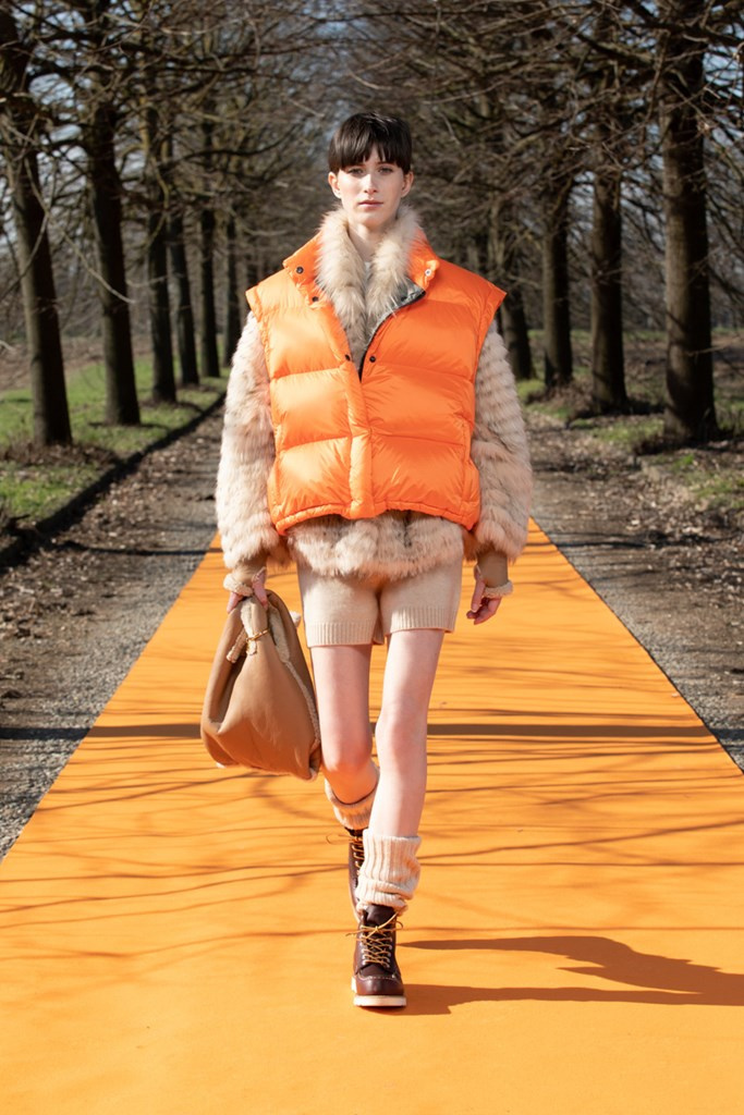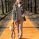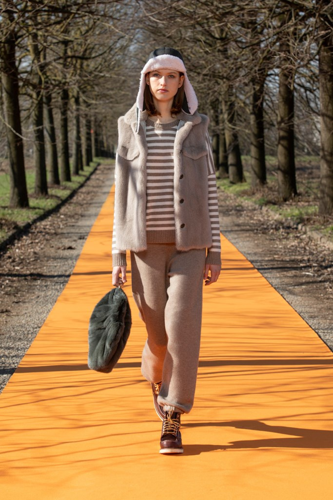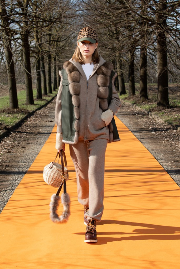 La maglieria gioca un ruolo importante con morbidi pantaloni jogging e felpe in cachemire da portare con gilet in montone arancio o con la camicia-gilet in visone taupe combinata con visone e zibellino.