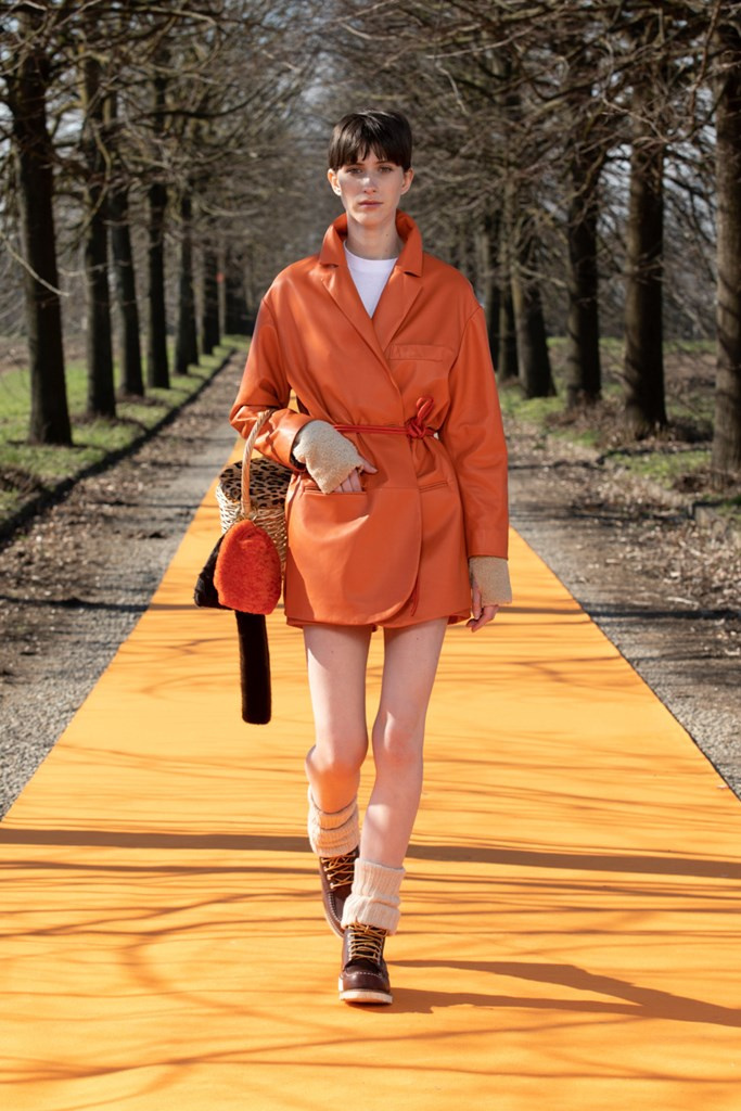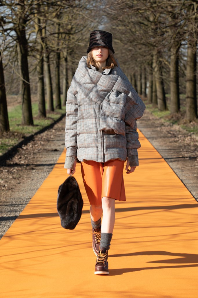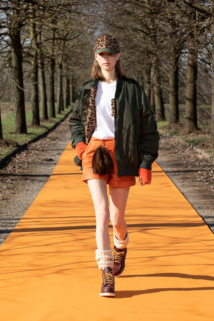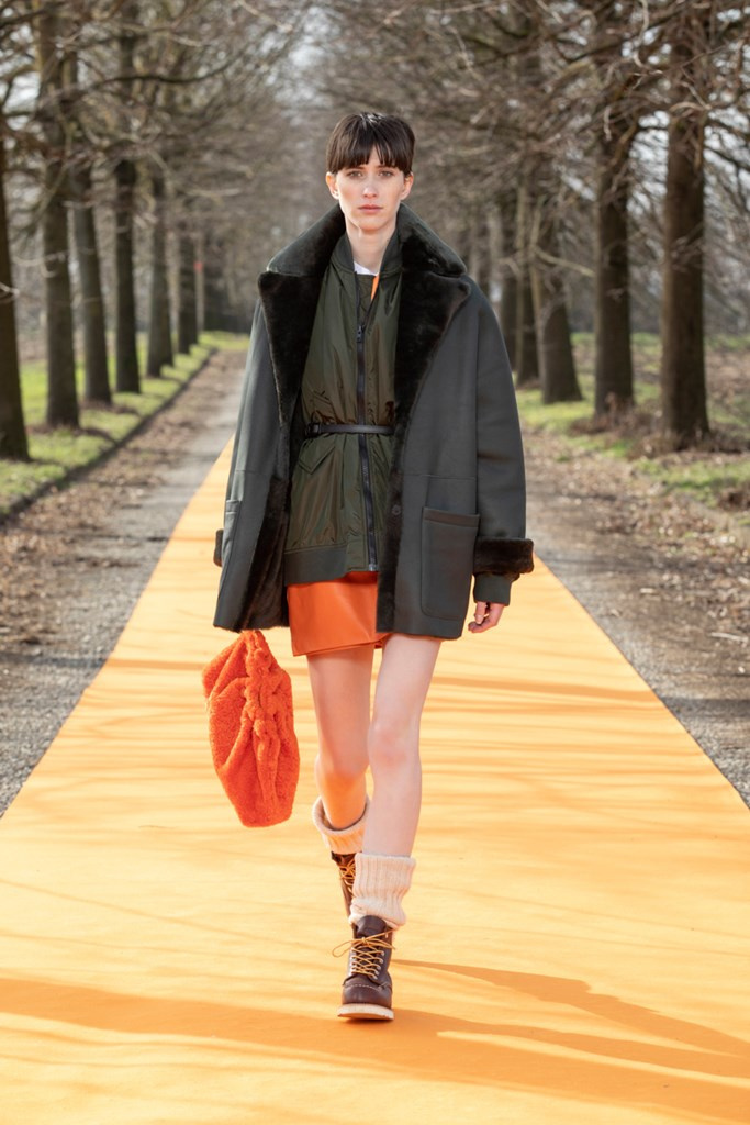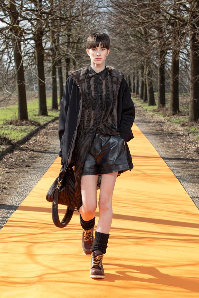 La maglieria gioca un ruolo importante con morbidi pantaloni jogging e felpe in cachemire da portare con gilet in montone arancio o con la camicia-gilet in visone taupe combinata con visone e zibellino.
