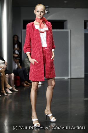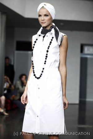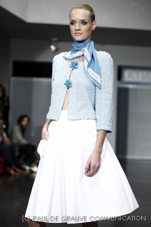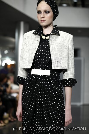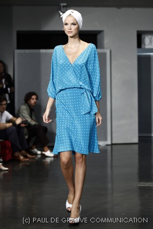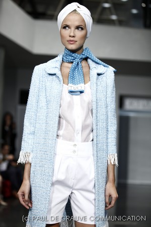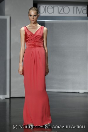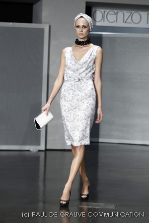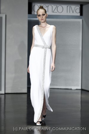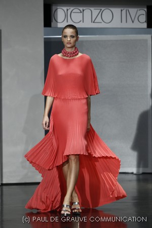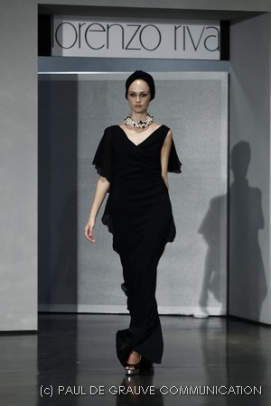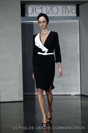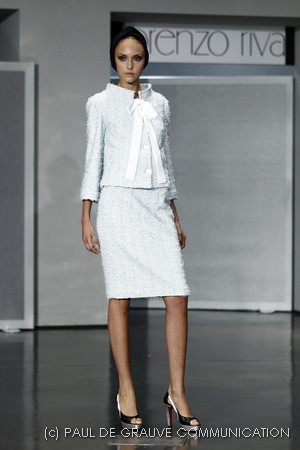 Lorenzo Riva si ispira all’eleganza degli anni ’40 e la reinterpreta con riferimenti agli anni ’70. Con i capelli raccolti in piccoli turbanti di seta è pronta per salire a bordo di una lussuosa nave da crociera la donna che sceglie di vestire Riva per la p\e 2011. Dai soprabiti alle giacche con maniche ampie e arricciate sul polso la linea è affusolata e avvolge morbidamente la silhouette.