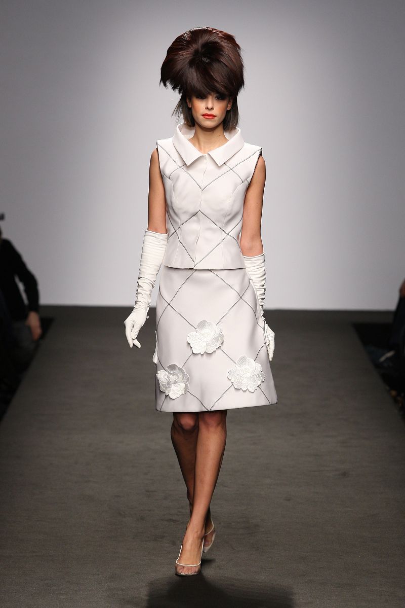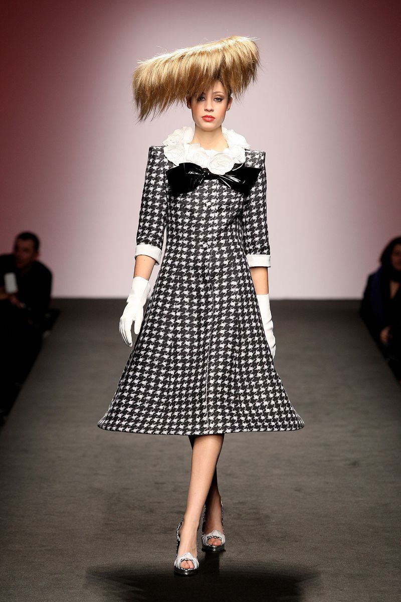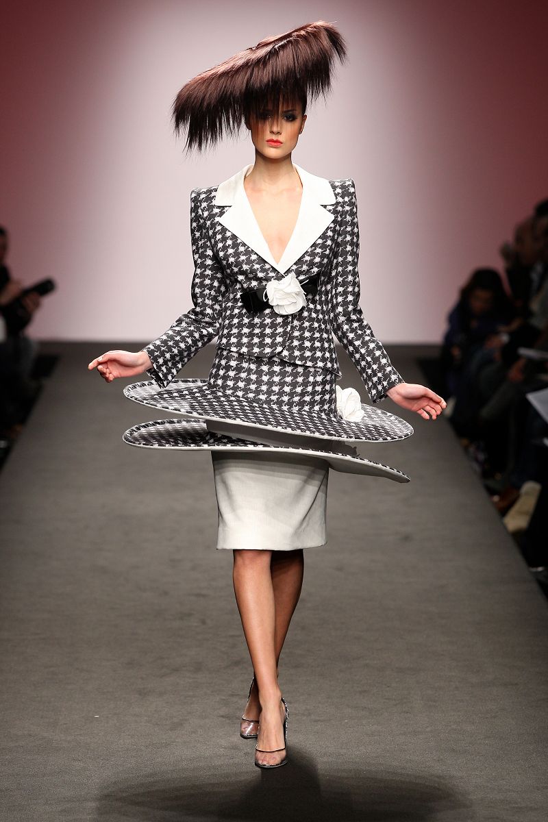 Nel frattempo mette tutto l’impegno perché la sua collezione sia come sempre un esempio di eleganza e di bon ton. Inventa con un pizzico di ironia, che sdrammatizza lo stile impeccabile dei suoi outfit, la “donna birillo” dalle acconciature, cappelli fatti di capelli, bizzarre. Rappresenta così una donna che sa contaminare gli abiti senza tempo con la modernità.