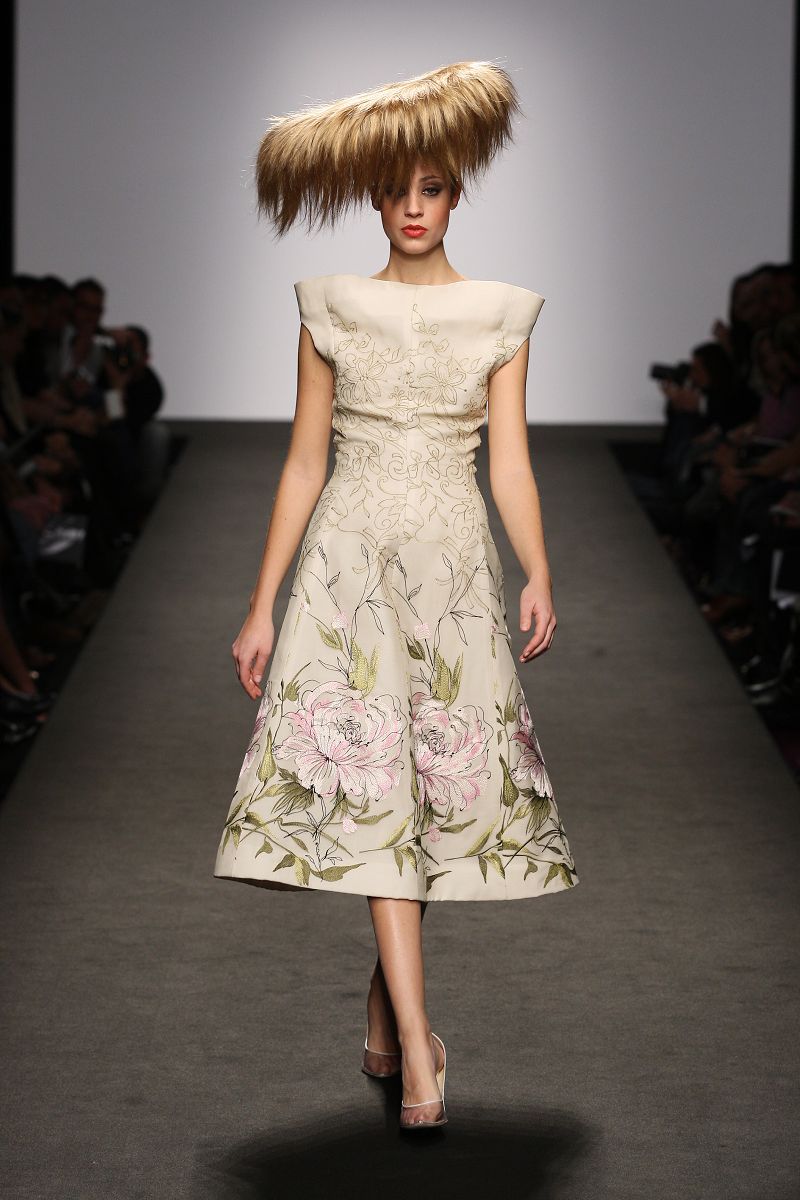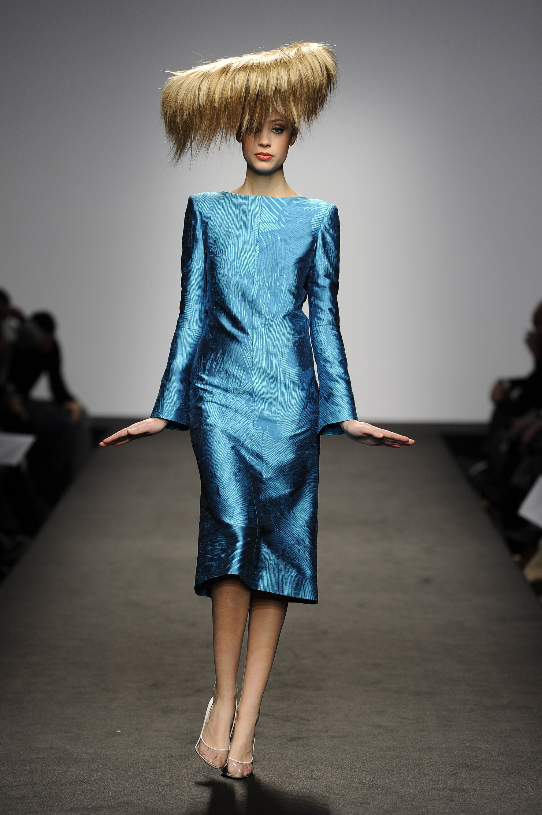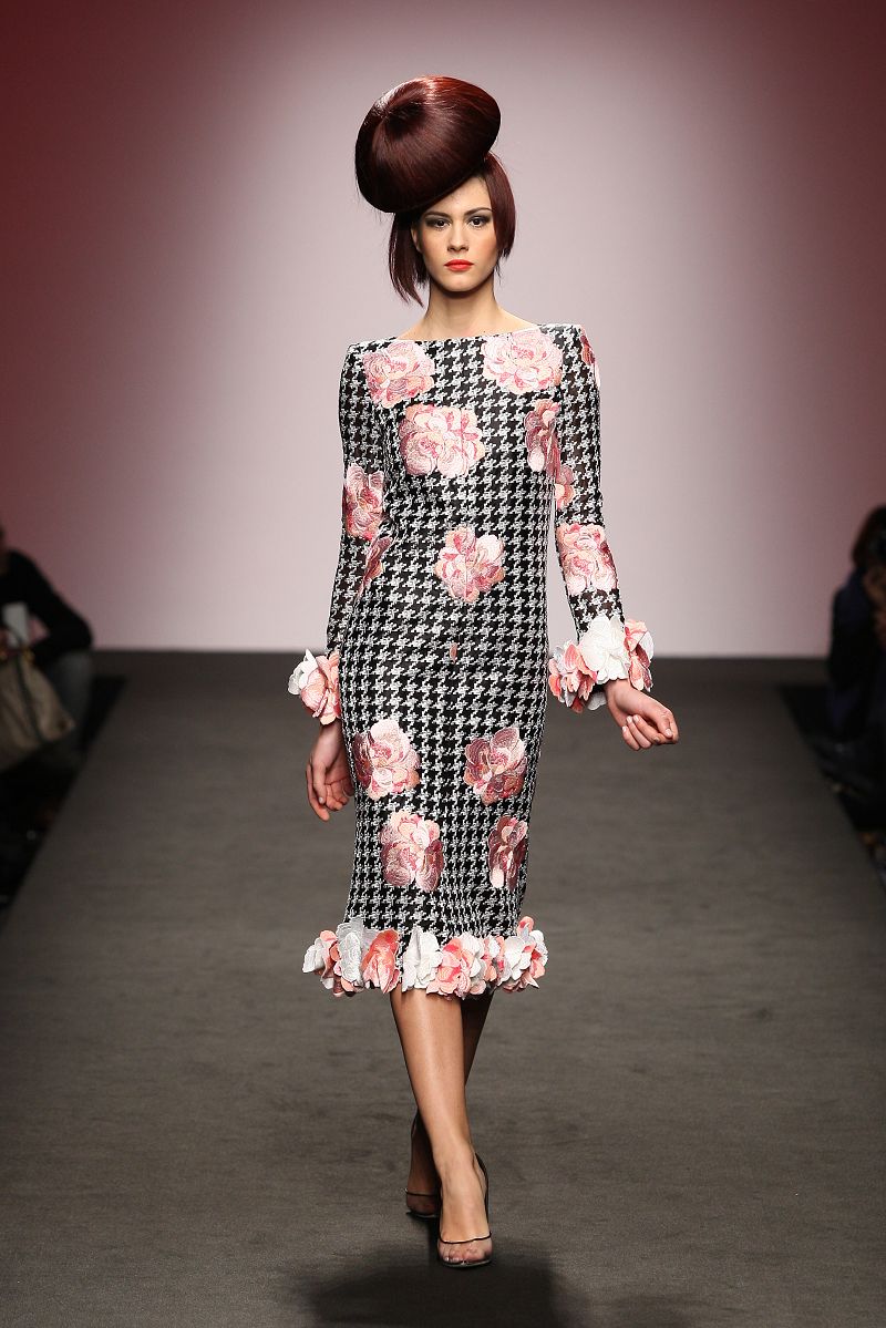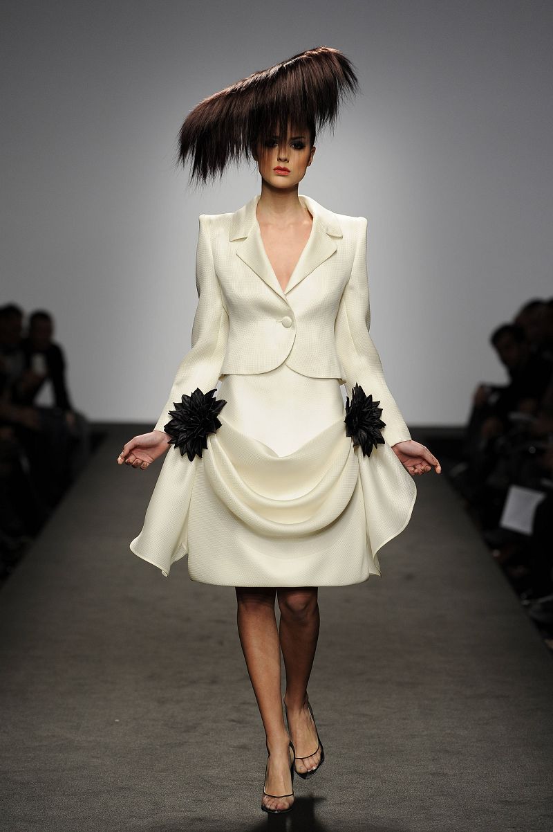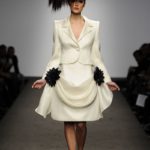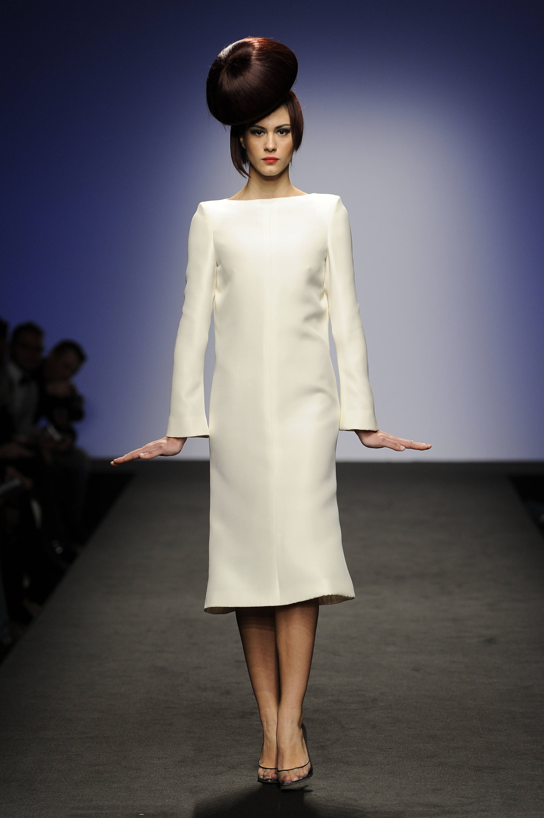 Attingendo agli anni settanta costruisce una silhouette rigida con abiti a tubo, segnati in vita; accorcia l’abito lungo, irrigidisce l’orlo e lo trasforma in una corolla. Poi scatena la fantasia per creare tailleur e abiti cocktail in cui le balze, una o anche due, sollevate restano perpendicolari alla struttura dell’abito e trasformano completamente la silhouette. Pur se ammiriamo che ciò dà all’indossatrice, anche per mantenere uno stabile equilibrio sui tacchi altissimi (pare 18 cm.), un incedere elegante e quasi etereo, l’interrogativo sulla praticità dell’abito si impone; e lamentiamo la situazione di chi fosse costretta a indossarlo in una cerimonia dal momento che impedisce una qualsiasi posizione di riposo, si trattasse anche solamente di poggiare le spalle allo stipite di una finestra. Forse dobbiamo passare sopra e considerare queste creazioni un po’ irreali e surreali, come licenze “artistiche” nell’ insieme di una collezione che comunque si distingue per vestibilità.