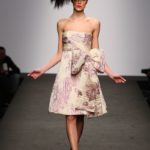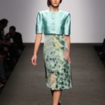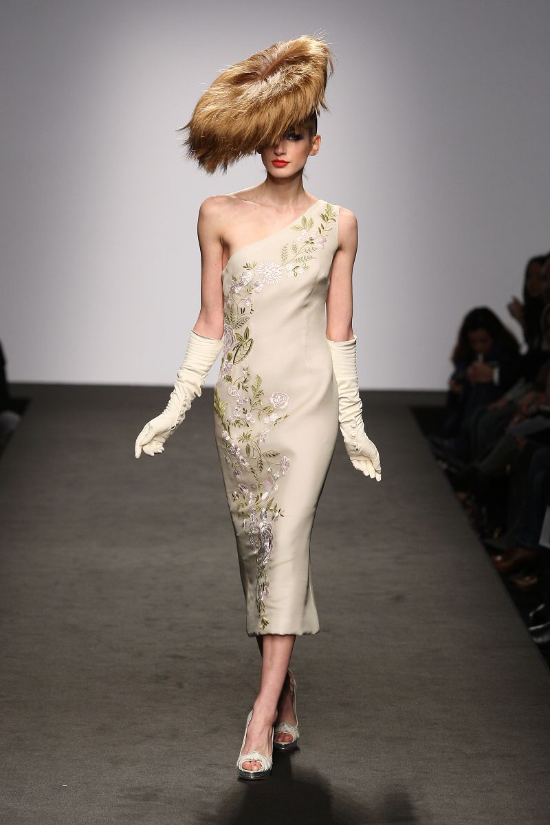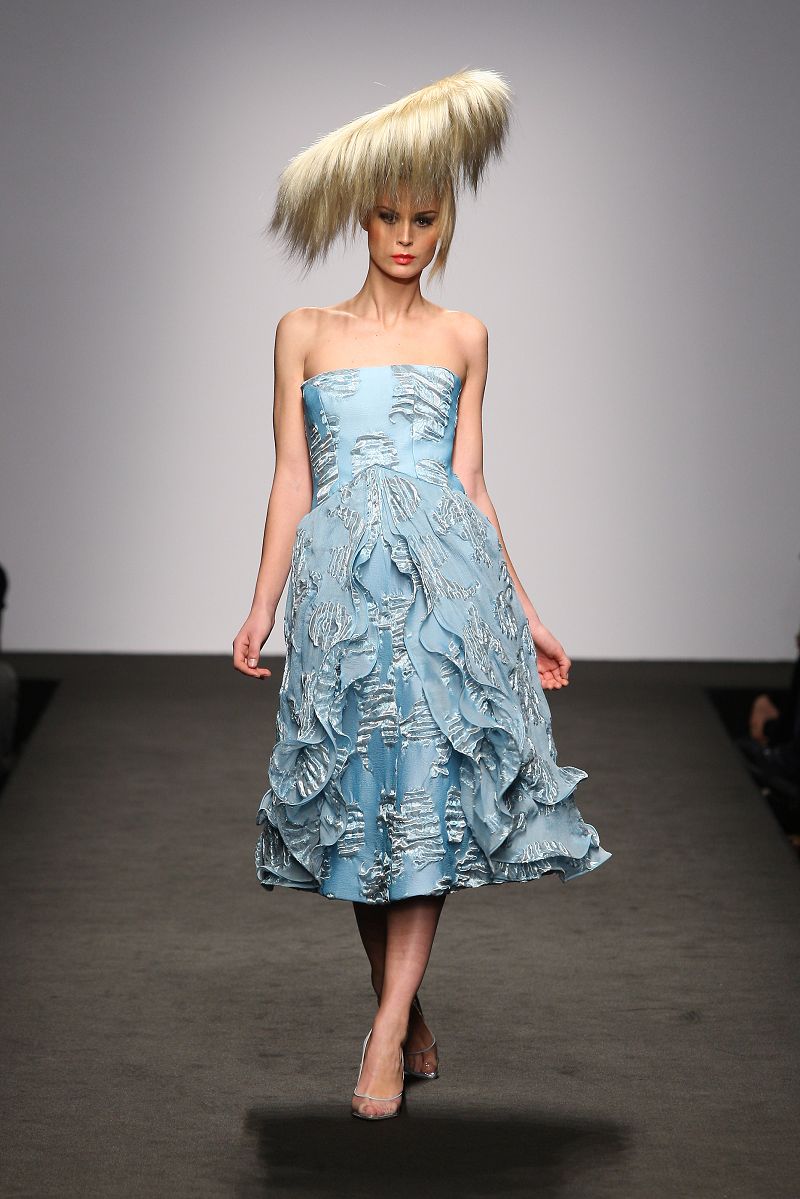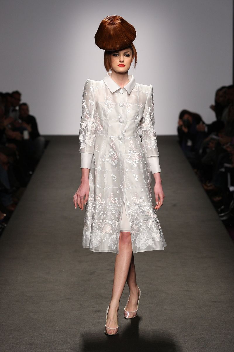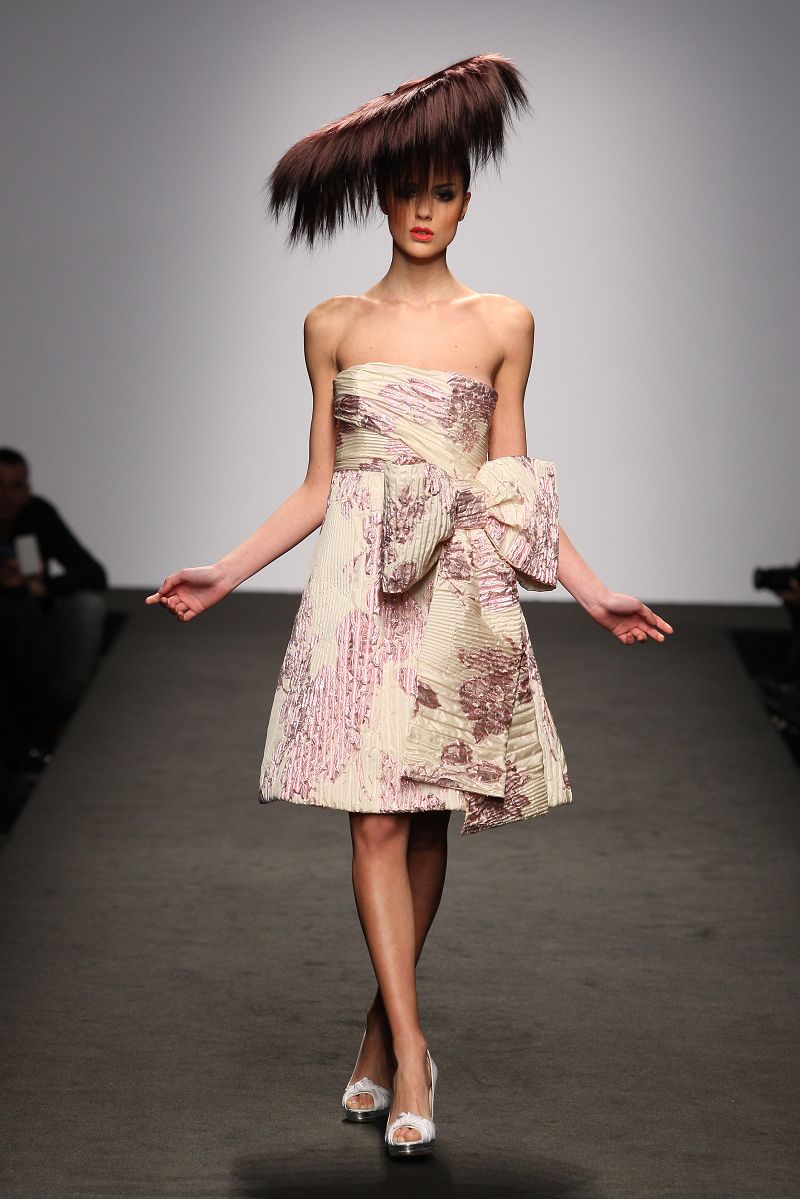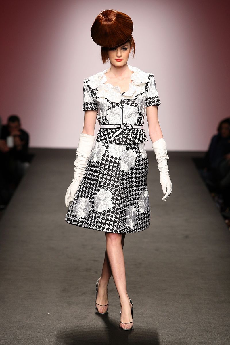 Attingendo agli anni settanta costruisce una silhouette rigida con abiti a tubo, segnati in vita; accorcia l’abito lungo, irrigidisce l’orlo e lo trasforma in una corolla. Poi scatena la fantasia per creare tailleur e abiti cocktail in cui le balze, una o anche due, sollevate restano perpendicolari alla struttura dell’abito e trasformano completamente la silhouette. Pur se ammiriamo che ciò dà all’indossatrice, anche per mantenere uno stabile equilibrio sui tacchi altissimi (pare 18 cm.), un incedere elegante e quasi etereo, l’interrogativo sulla praticità dell’abito si impone; e lamentiamo la situazione di chi fosse costretta a indossarlo in una cerimonia dal momento che impedisce una qualsiasi posizione di riposo, si trattasse anche solamente di poggiare le spalle allo stipite di una finestra. Forse dobbiamo passare sopra e considerare queste creazioni un po’ irreali e surreali, come licenze “artistiche” nell’ insieme di una collezione che comunque si distingue per vestibilità.