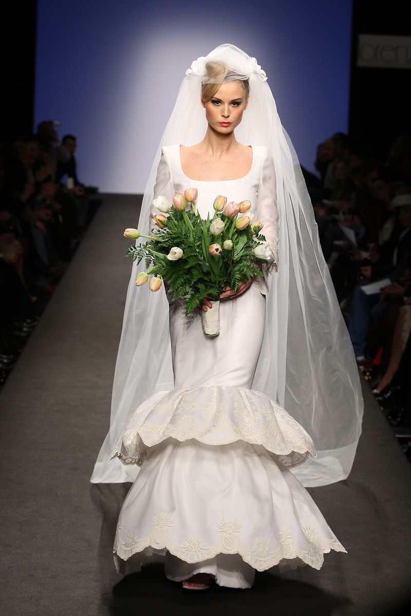 La collezione termina come di consueto con un tradizionale abito da sposa, dalla linea semplice che segue la silhouette femminile senza enfatizzarla e ricami sulle due balze; velo fermato da due fiori.