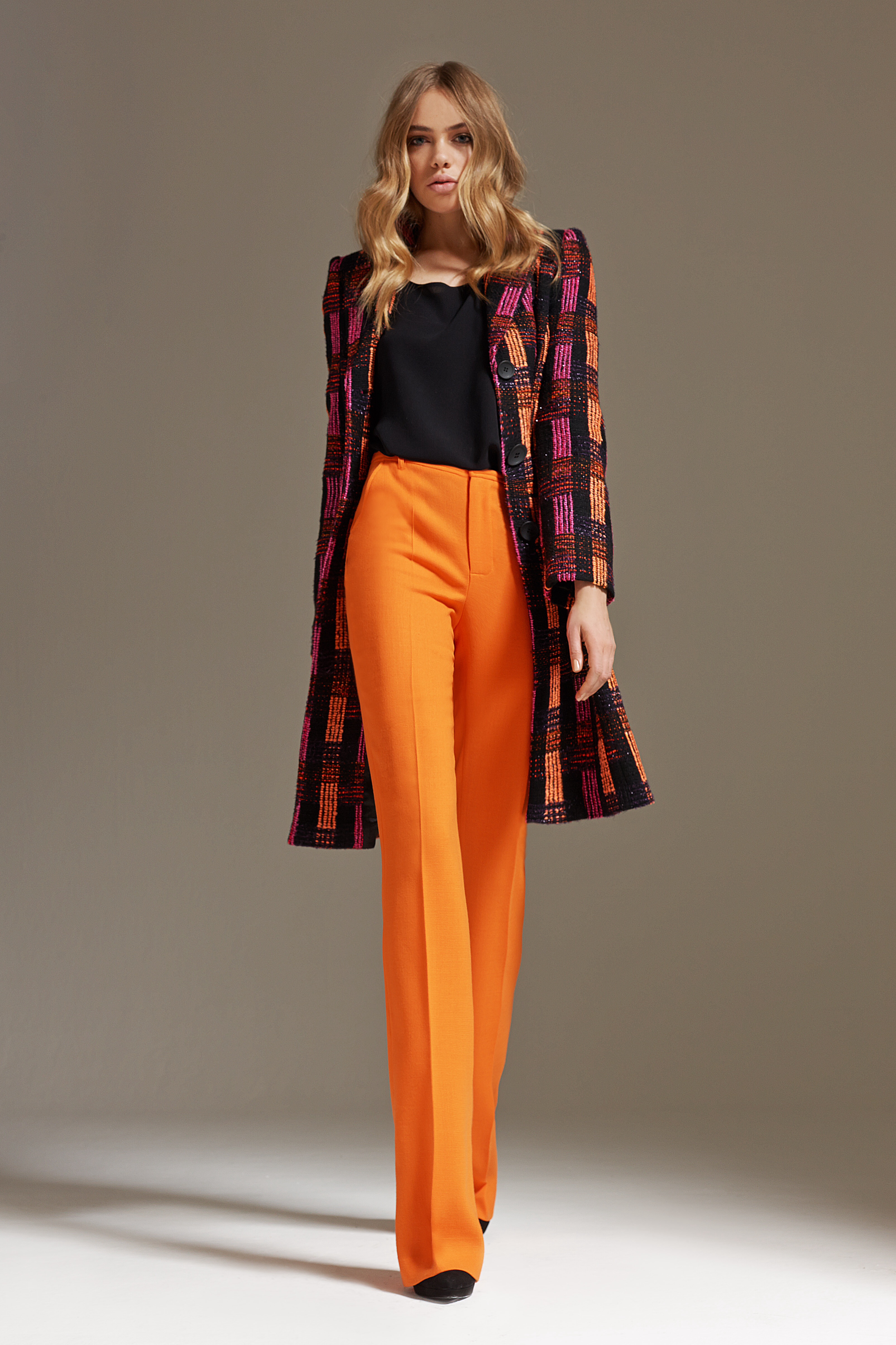 In perfetto stile Coveri la linea con fiori geometrici: il fuxia, il giallo, l’azzurro, il verde e il viola giocano su fondo nero, creando un perfetto mix di stampe fiorate che riveste abiti, giacche, pantaloni e camicie. Non può mancare anche una collezione più fluo – dove abiti e giacchine sono tinteggiati di fiori rosa e neri – e una linea di check e micro jacquard, con disegni violacei su fondo grigio o arancioni su fondo nero. A completare la proposta autunno-inverno 2014/15, i lunghi abiti da sera, adatti a tutte le stagioni e da sfoggiare anche durante le cerimonie: colorati, preziosi, fluidi e decisamente spettacolari.