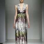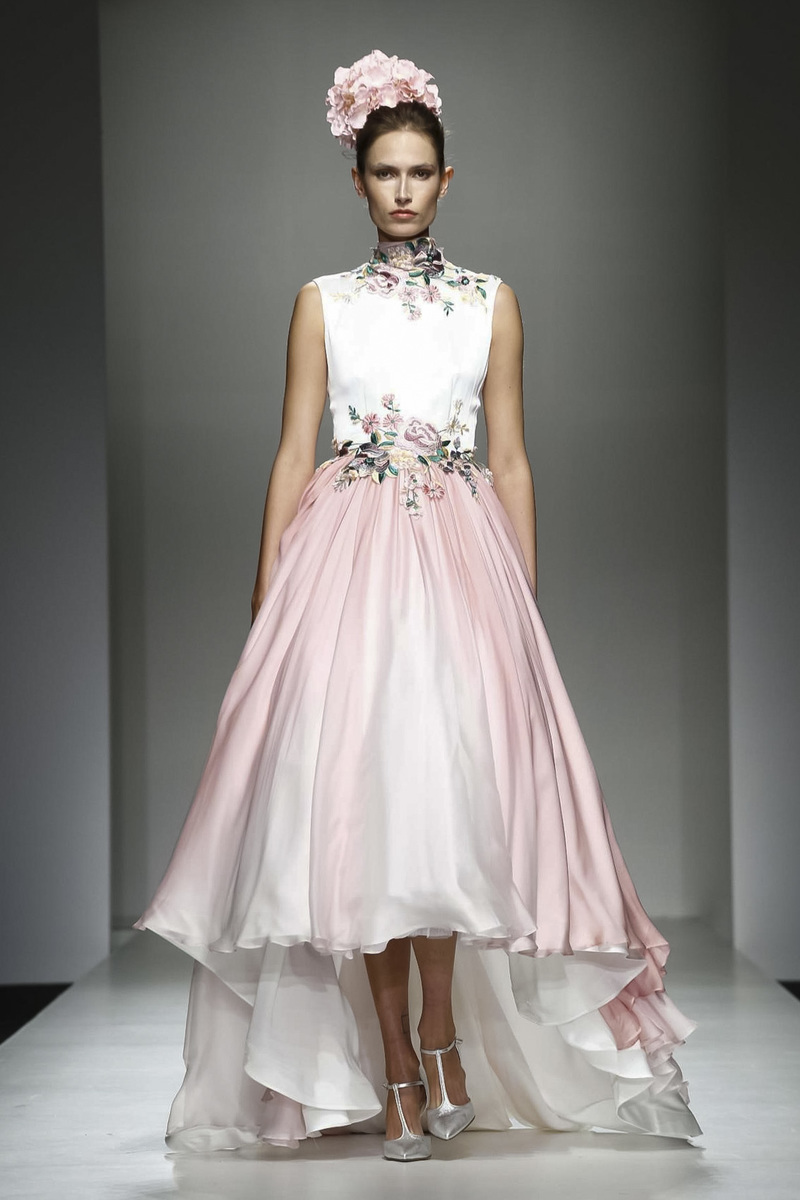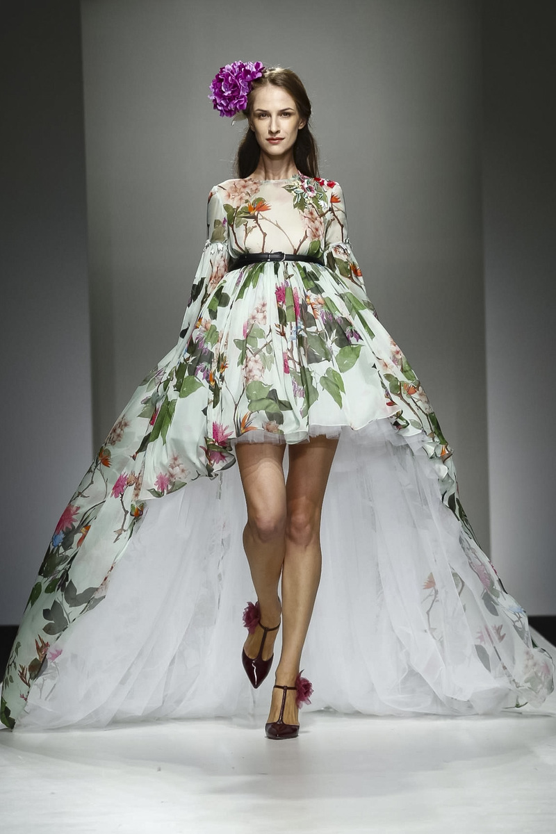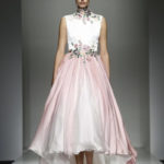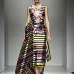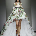 Una couturier sofisticata, che nella collezione “Giardino Segreto” Haute Couture P/E 2017 ha evidenziare le sue capacità espressive e ha saputo utilizzare quelle soluzioni stilistiche sorprendenti e proprie del lavoro nell’alta moda espressa in una ready couture, una pronta couture, di alta creatività. Abiti sontuosi nella loro semplicità, dal taglio geometrico netto rettangolare, solo talvolta smussato da una curva; dove le stampe, i ricami, i tessuti giocano un ruolo importante per dare valore alla creazione, mantenendone però l’espressione di estrema leggerezza e geometrica semplicità. Basti, come esempio, osservare l’abito da sposa, realizzata in un duplice gioco di sfumature: linea semplicissima, ricchezza espressa nella gonna e nelle applicazioni di ricami in vita e nel corpino. Oppure guardiamo l’abito di tessuto stampato a fiori, gonna corta sul davanti che permette di apprezzare il compito del tulle che doppia internamente la gonna gonfiandola e sostiene lo strascico rendendolo voluminoso. Belle le stampe a fiori sul voile di seta e sul cadì; sapienti gli accostamenti delle sfumature di colore, studiati gli effetti ottenuti con i panneggiamenti del tessuto a righe colorate. Una sottile cintura nera segna il punto vita e sdrammatizza anche gli abiti più costruiti.