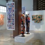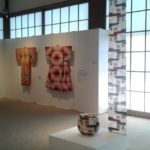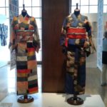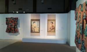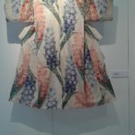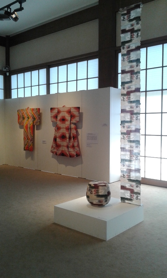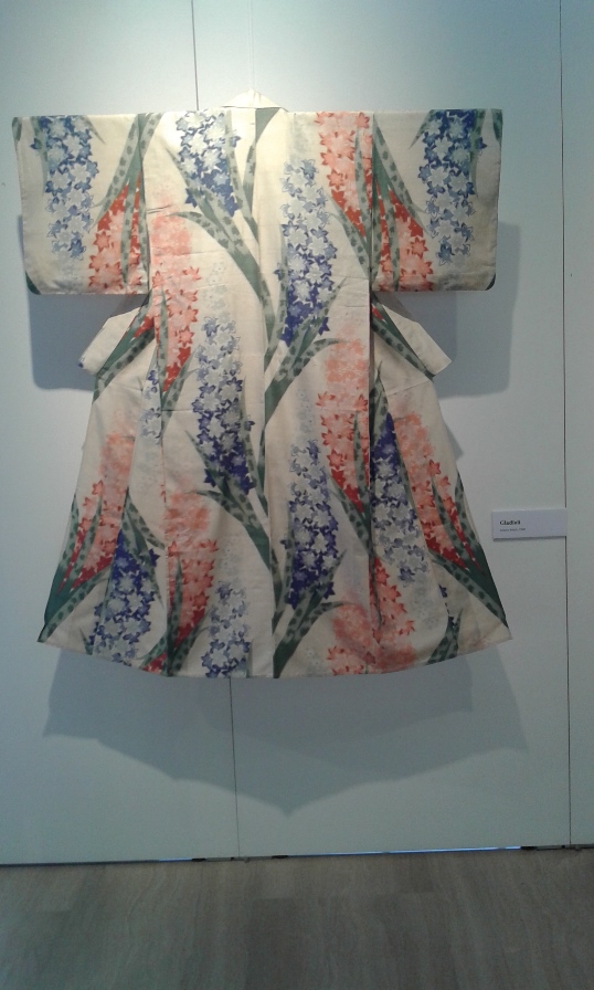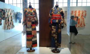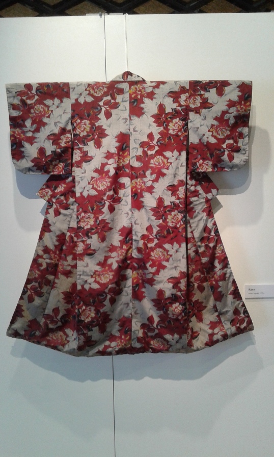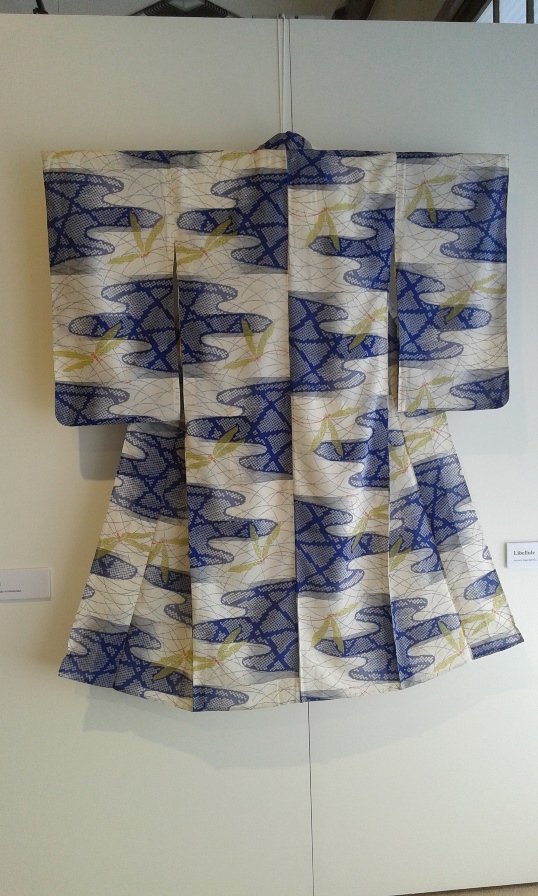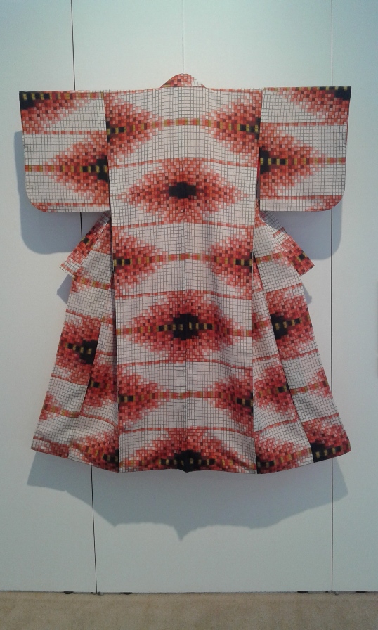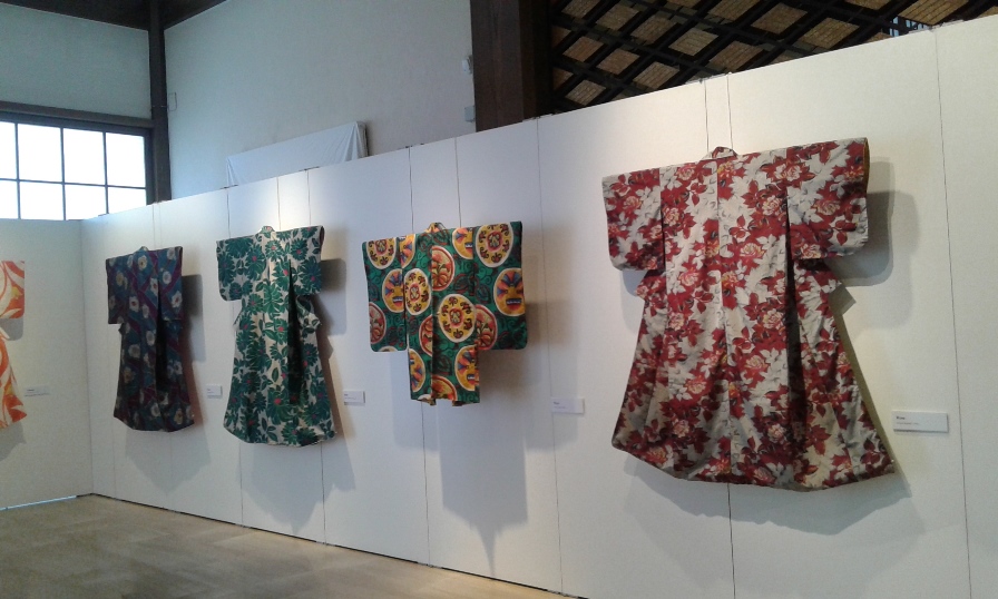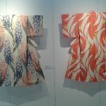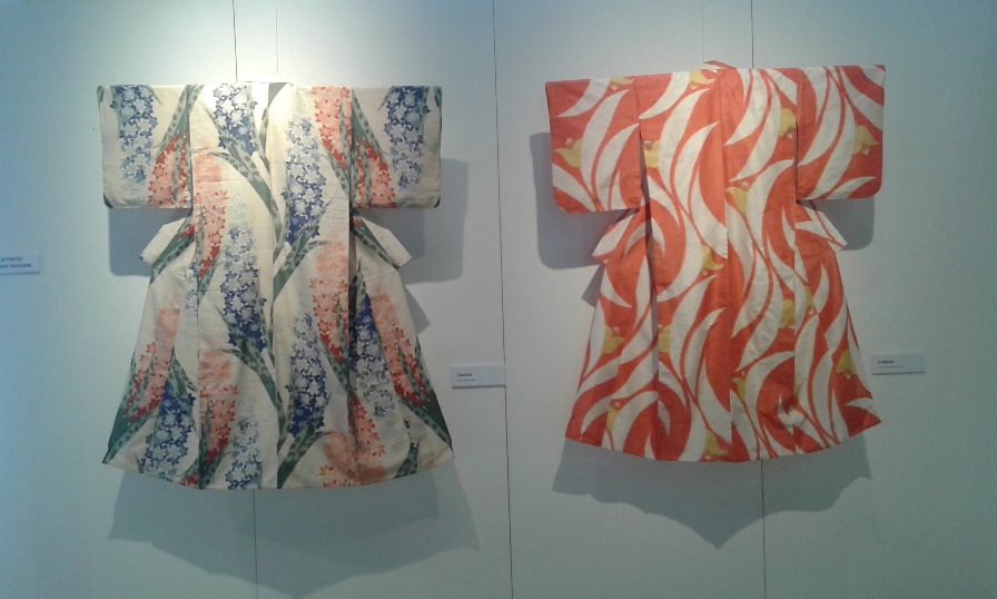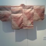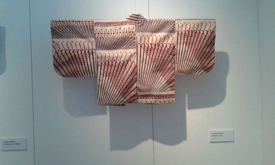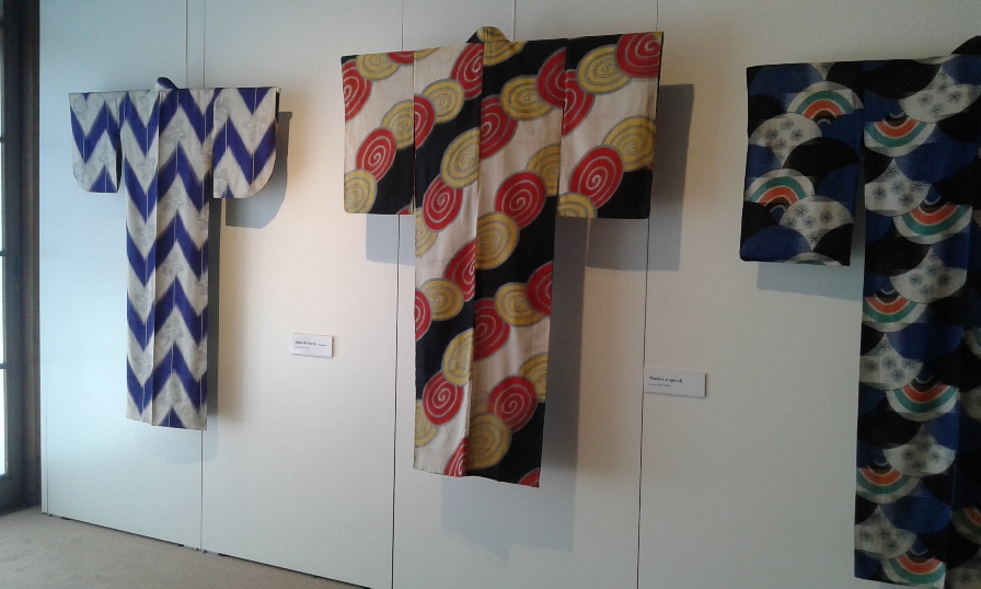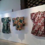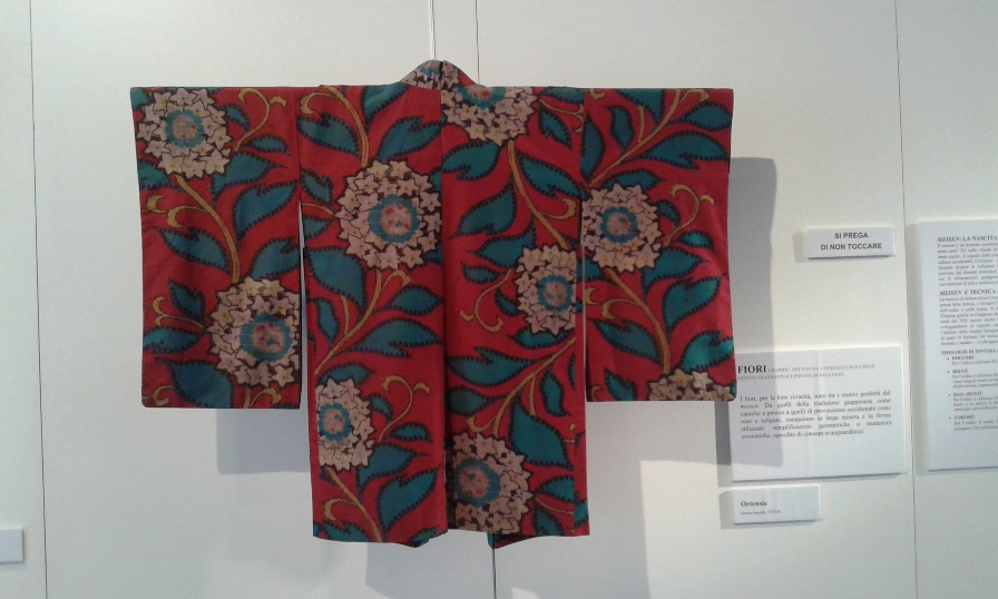 Una piccola zona della sala era dedicata alla proiezione di un video sulle tecniche di lavorazione e colorazione del tessuto. Apprendiamo così che ci sono vari sistemi di tinteggiatura: la “ikat” per esempio, tramandata in epoca Edo dai paesi del sud-est asiatico, prevede di tingere il tessuto in fasci di fili tenuti parzialmente legati per lasciarne una parte bianca. Ha un che di ipnotico osservare, a continuazione, il certosino lavoro della filatura: quel placido e metodico perfetto incastro di trama e ordito.