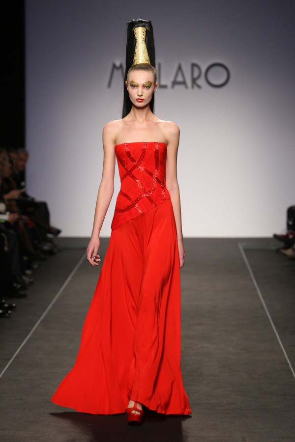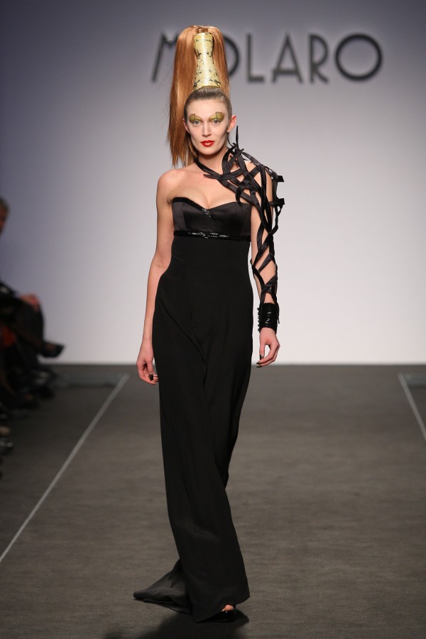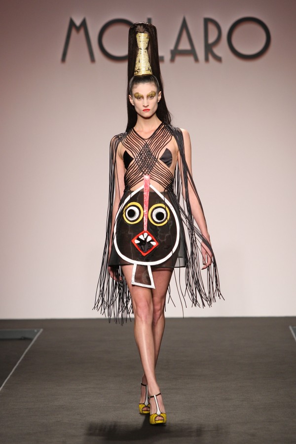 Le giacche hanno spalle squadrate, hanno sfilato stole a gabbia ma anche crinoline rigide che sorreggono bustier, da indossare su gonne a ruota di seta. Anche le stole sono realizzate con intrecci di radici, sempre di seta, oppure con petali in tulle sovrapposti entro cui avvolgersi. La collezione, pur nella sua originalità, non dimentica l’eleganza classica del taglio impero negli abiti lunghi in cui è fondamentale il gioco di contrasti fra il bianco e il nero, fra il giallo e il rosso acceso. Le proposte di Gianni Molaro puntano sicuramente a catturare lo sguardo e a colpire l’attenzione con lavorazioni audaci e tridimensionali, effetti studiati come le luccicanti piramidi in plexiglass impresse sull’abito a sirena. In passerella anche un abito ispirato a un’antica divinità cosmica: la crinolina è composta da radici di chiffon che racchiudono, in trasparenza, piccoli cucchiai trasformati in ironici dettagli di couture. Le acconciature svettano altissime, le lunghe code sono state imprigionate in decine di cerchi dorati, simili ai bracciali indossati dalle donne di diverse popolazioni africane. Infine ha sfilato la sposa, rappresentata da un abito a sirena in mikado avorio, completamente ricamato con elementi e perline dorate; la creazione è impreziosita da uno strascico lungo oltre tre metri.