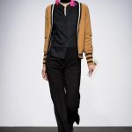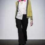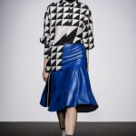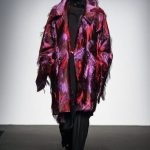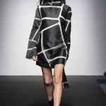 Fatta di un mix di materiali sperimentali oltre che classici, così il nylon water proof, la vernice, la eco pelle e la eco pelliccia, così la doppia crêpe di lana, la seta stampata e il jacquard floreale, tessuti ben sintonizzati con la palette selezionata fatta di colori decisi e ritempranti come il blu elettrico, il rosso, ma anche di colori più soft come i verdi, i marroni bruciati, il tabacco, i panna e gli iridescenti grigi metallici.