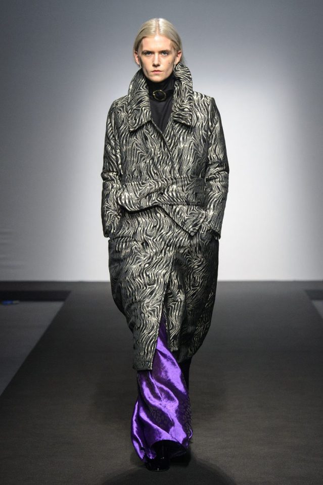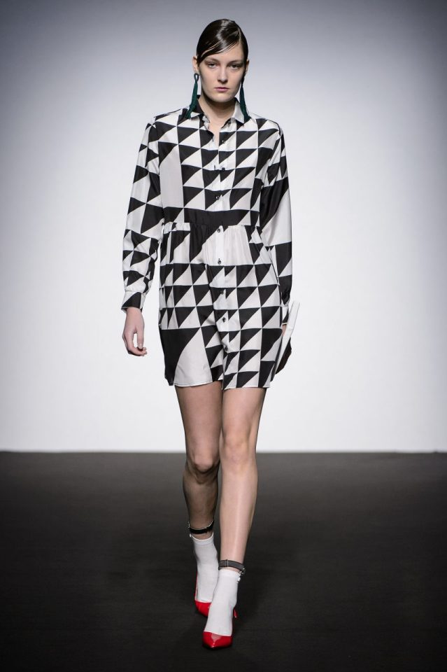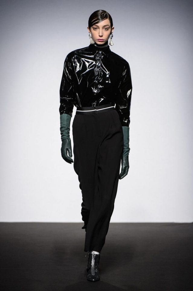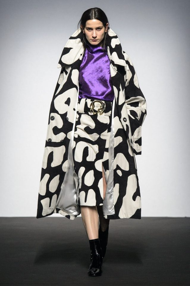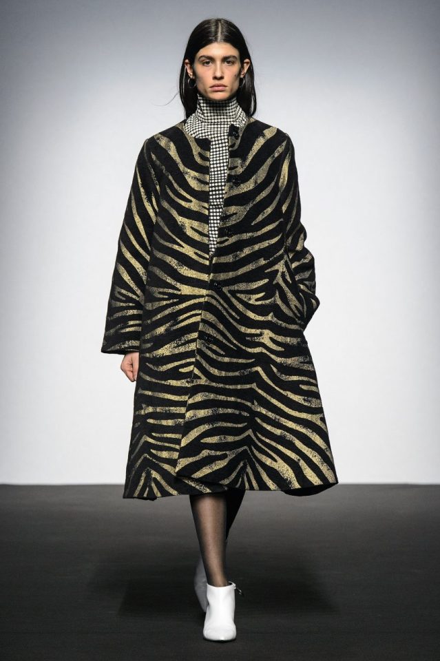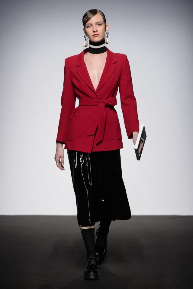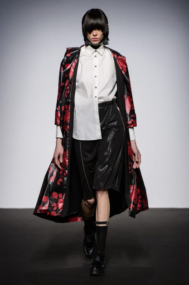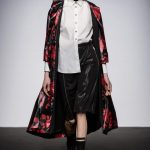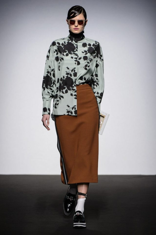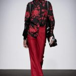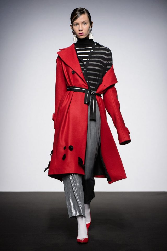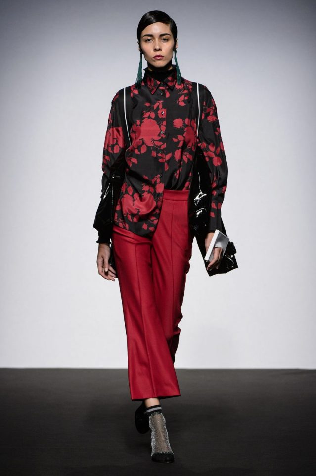 Hanno sfilato maxi cappotti e crop top in eco pelliccia stampata accanto a gonne a matita, e a corolla; pea cot in doppio crêpe di lana, chemisier, trench in vernice, maxi coat in stampe macro rosso e nero, completi giacca- pantalone dal taglio maschile, camicie over combinate con pantaloni a zampetta ed eleganti maxi abiti con coulisse in vita.