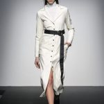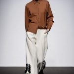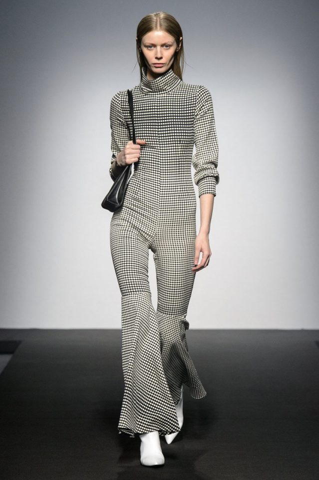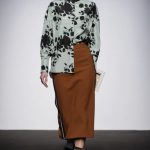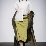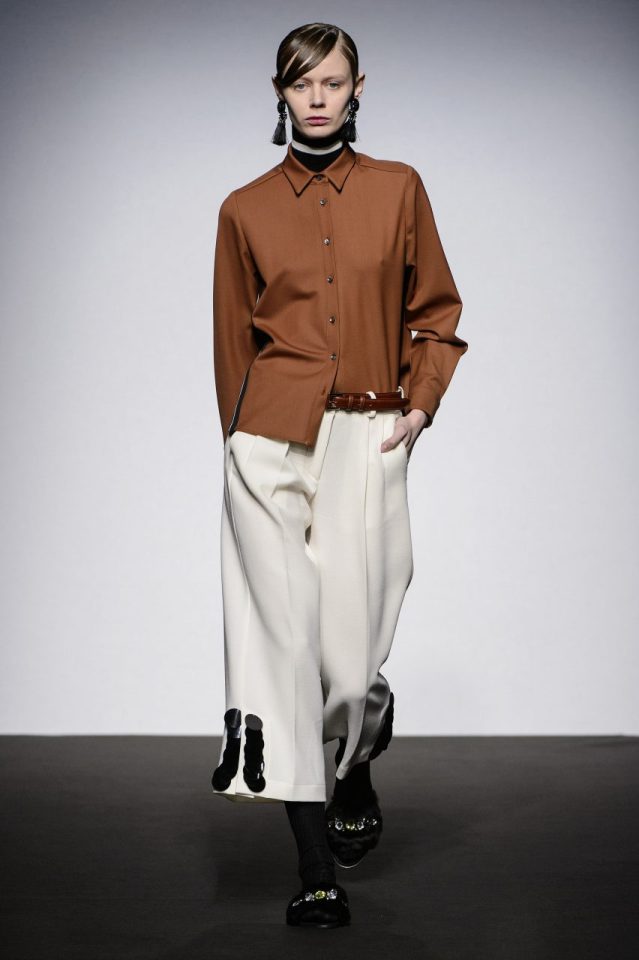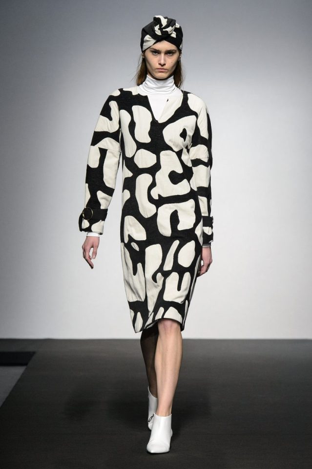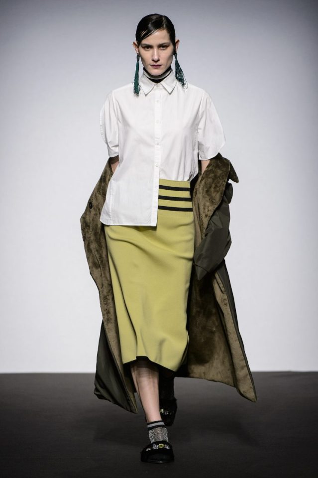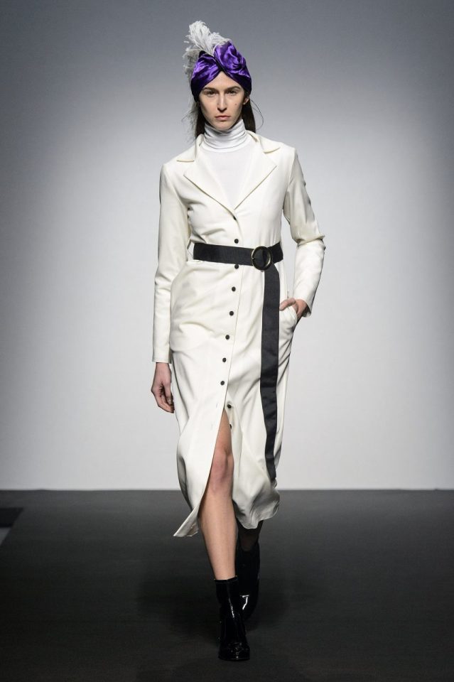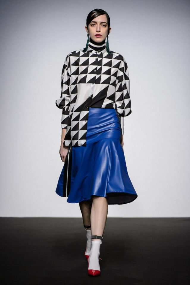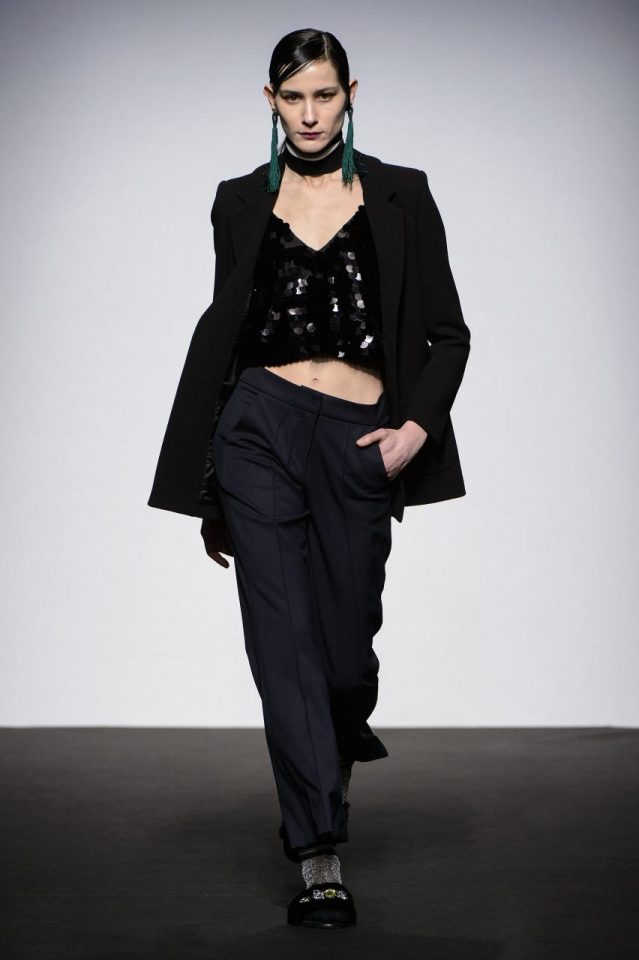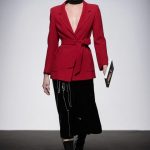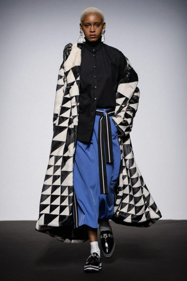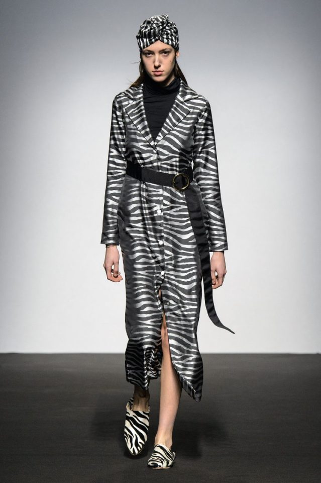 Hanno sfilato maxi cappotti e crop top in eco pelliccia stampata accanto a gonne a matita, e a corolla; pea cot in doppio crêpe di lana, chemisier, trench in vernice, maxi coat in stampe macro rosso e nero, completi giacca- pantalone dal taglio maschile, camicie over combinate con pantaloni a zampetta ed eleganti maxi abiti con coulisse in vita.