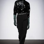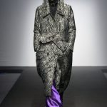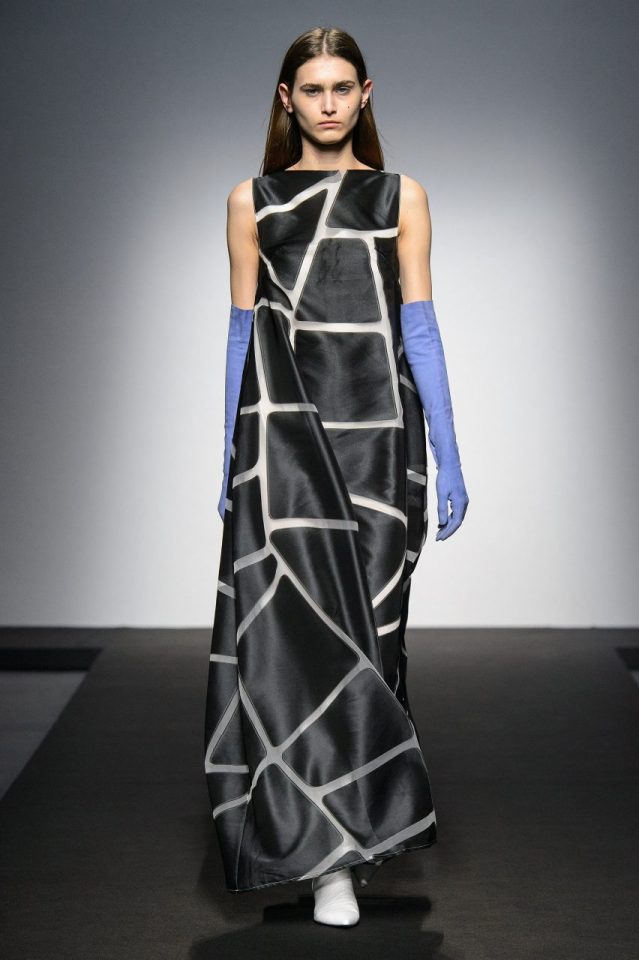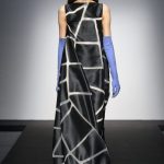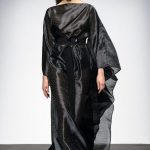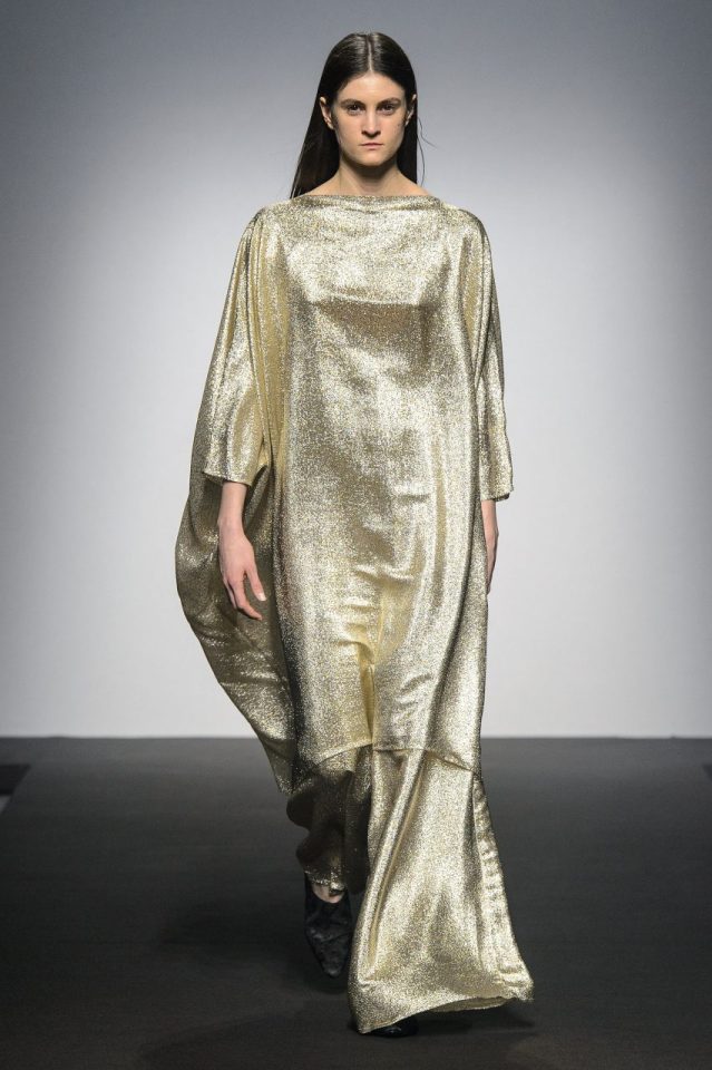 I colori virano dai neutri bianco e nero alle tonalità di viola fino ad arrivare al dorato, colore protagonista degli abiti second skin in lurex. Una collezione di sicuro impatto che coniuga ottimamente tecniche innovative a dettagli della old school, che emergono per esempio dalla proposizione di splendidi turbanti posti a coprire il capo.