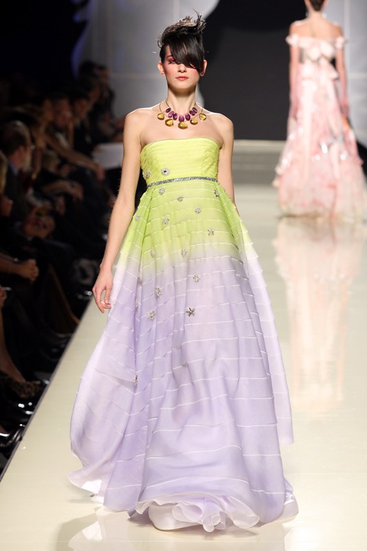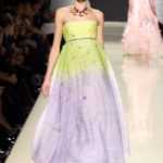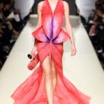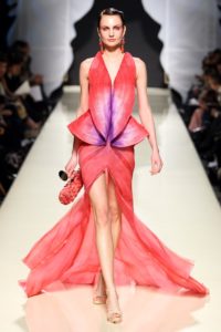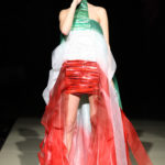 E’ in sintesi questo il messaggio che lo stilista di Gattinoni ha lanciato dalla passerella di Santo Spirito in Saxia. Se da una parte rappresenta con senso del realismo il disastro dei nostri giorni lo smog, le nebbie, i territori violati, contaminati, profanati e lo fa con i colori nei toni del grigio, del fumé; prevale la sua visione ottimistica. Man mano i colori si fanno primaverili, diventando rosa, albicocca sfumato nel melone, verde malva e poi vitali, giallo, ocra, rosso, corallo, lilla. I tessuti si alleggeriscono sono organza e chiffon jersey di seta e o lucidi rasi duchesse . Le forme guardano al futuro, aerodinamiche nel bell’abito rosso dalla giacca dalle mille piegoline sfumata, elicoidali, curve per rappresentar la femminilità, ma anche una ricerca della perfezione.